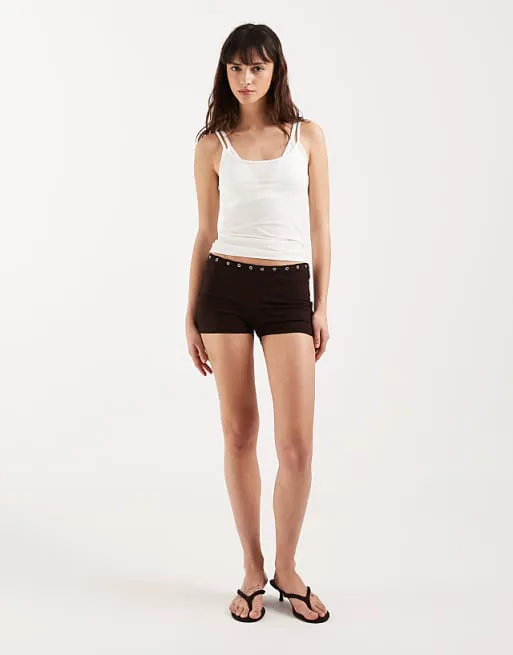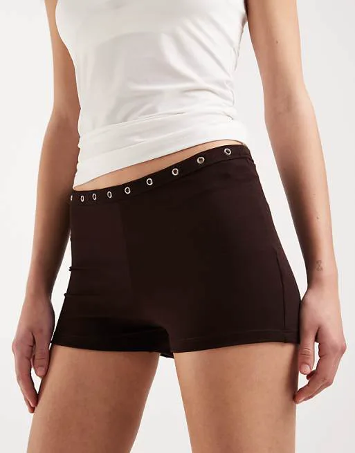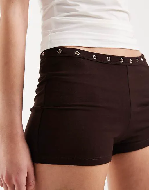 Дизайн шорт продуман до мелочей. Декоративные люверсы, расположенные на поясе, добавляют изюминку и делают акцент на талии. Узкий крой подчеркивает силуэт, обеспечивая комфортную посадку и свободу движений. Короткая длина визуально удлиняет ноги, делая образ более привлекательным и современным.