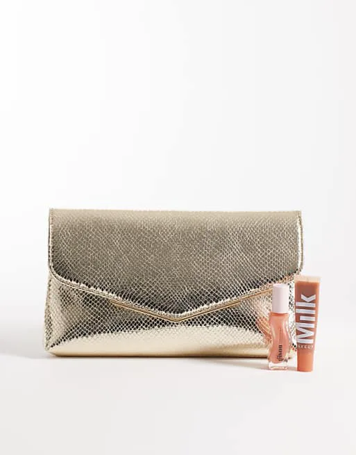 Дизайн клатча выполнен в золотистом цвете с эффектной имитацией змеиной кожи, что придает ему роскошный и неповторимый вид. Металлизированная отделка добавляет блеска и привлекательности, делая его идеальным дополнением к вечернему наряду или праздничному образу.