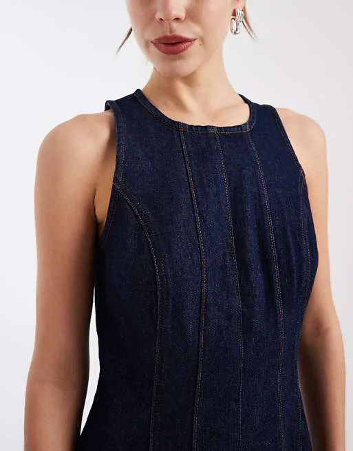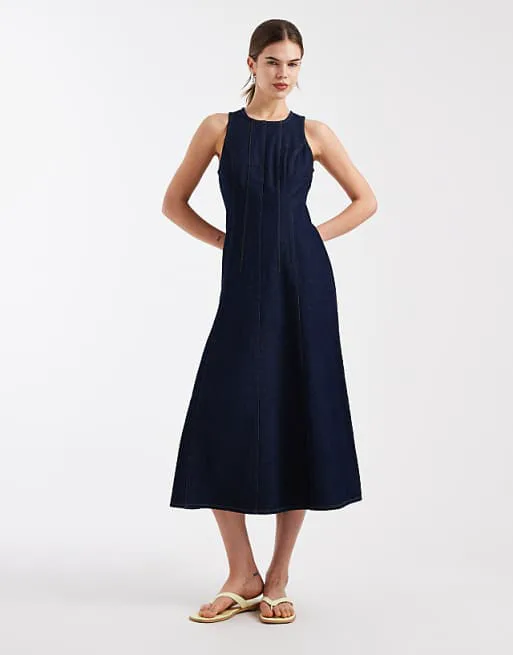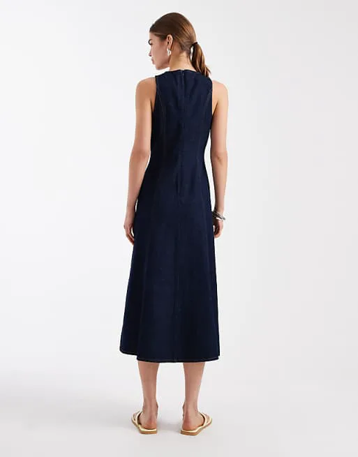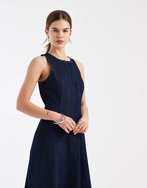Платье выполнено из плотного, но приятного на ощупь денима, который отлично держит форму и обеспечивает долговечность изделия. Цвет индиго придает платью глубину и благородство, делая его подходящим как для повседневной носки, так и для более формальных мероприятий.