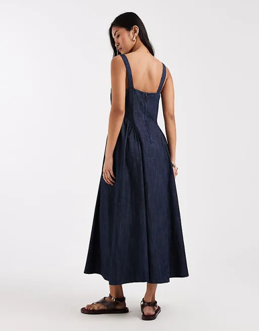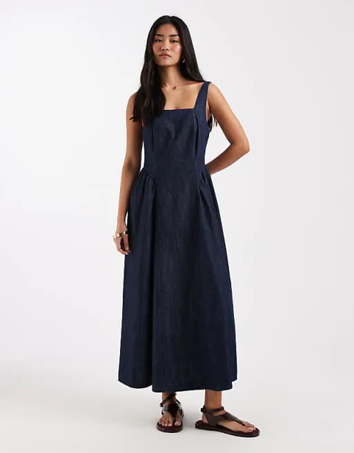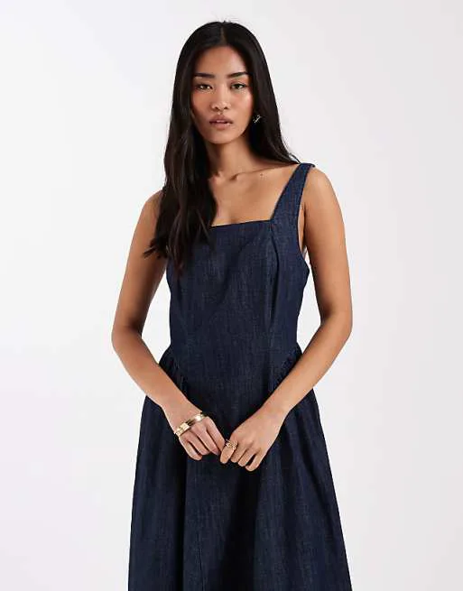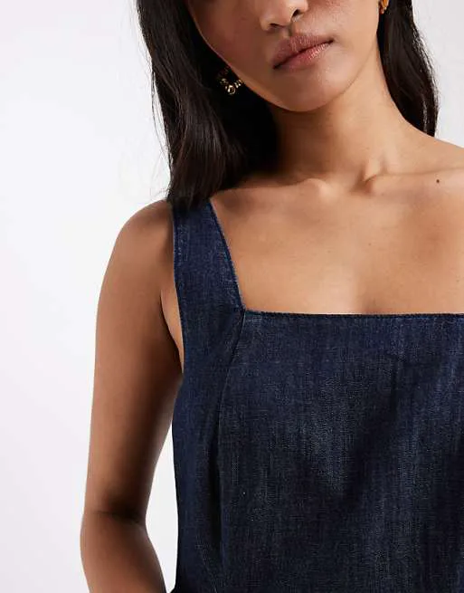Платье выполнено из качественного денима, который обеспечивает долговечность и приятные тактильные ощущения. Квадратный вырез горловины добавляет изысканности и женственности, выгодно подчеркивая линию шеи и ключиц. Отсутствие рукавов делает платье идеальным выбором для теплой погоды, позволяя чувствовать себя комфортно и уверенно.