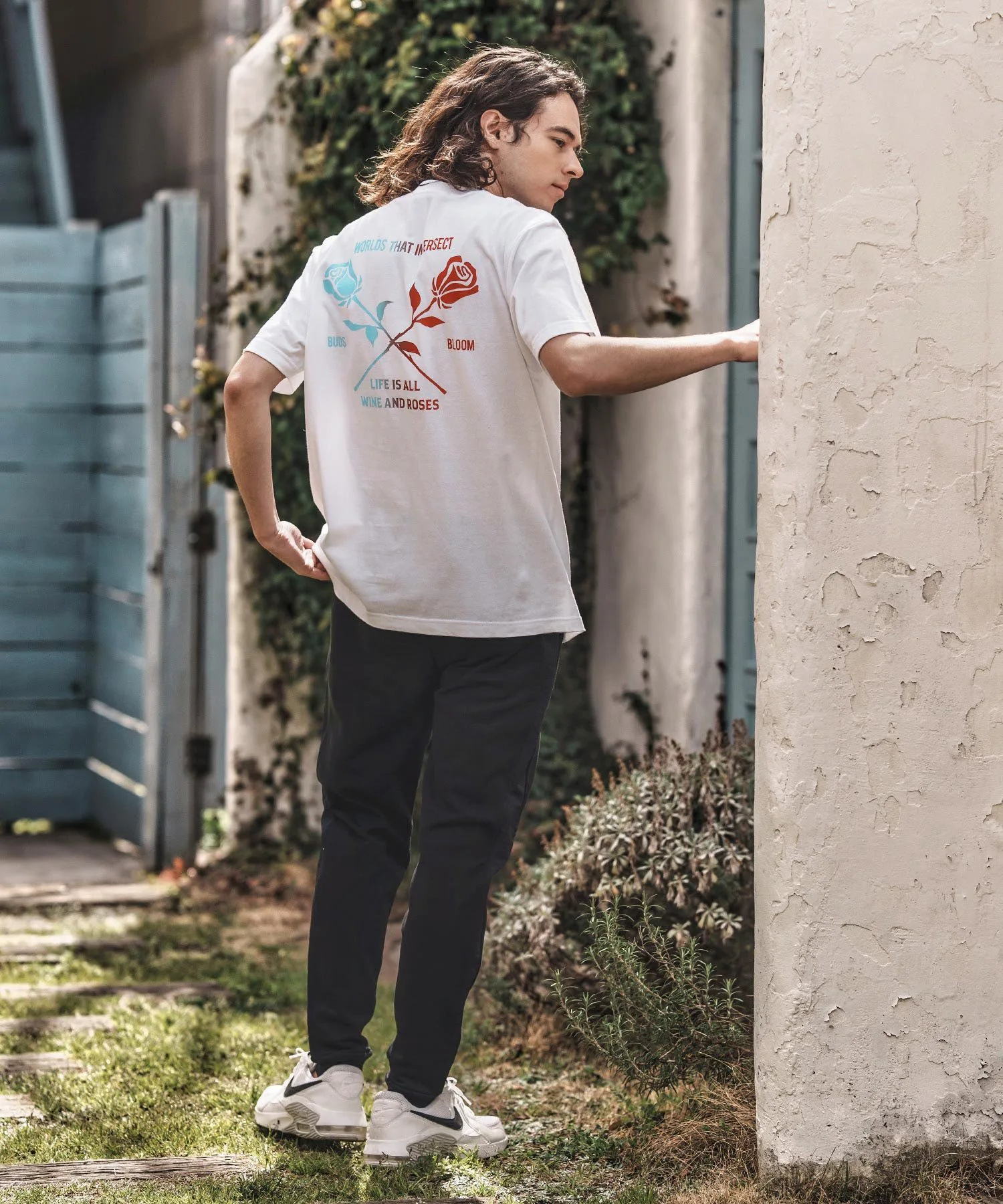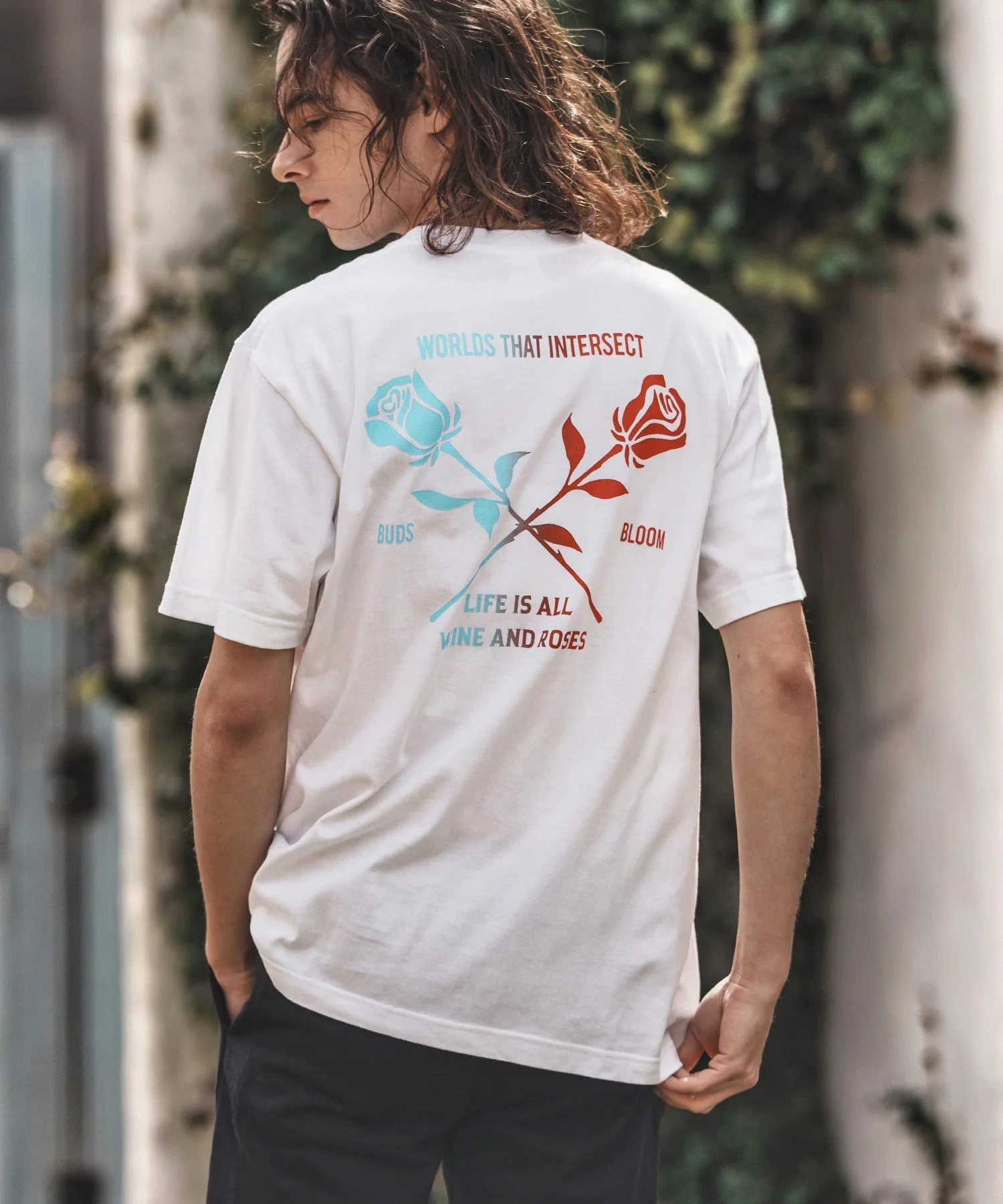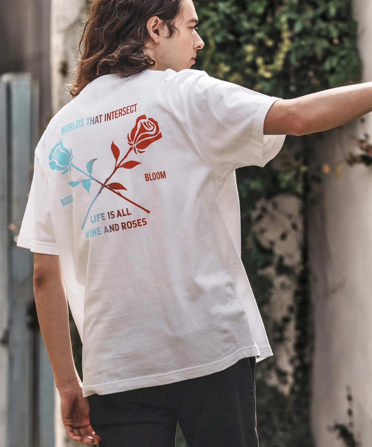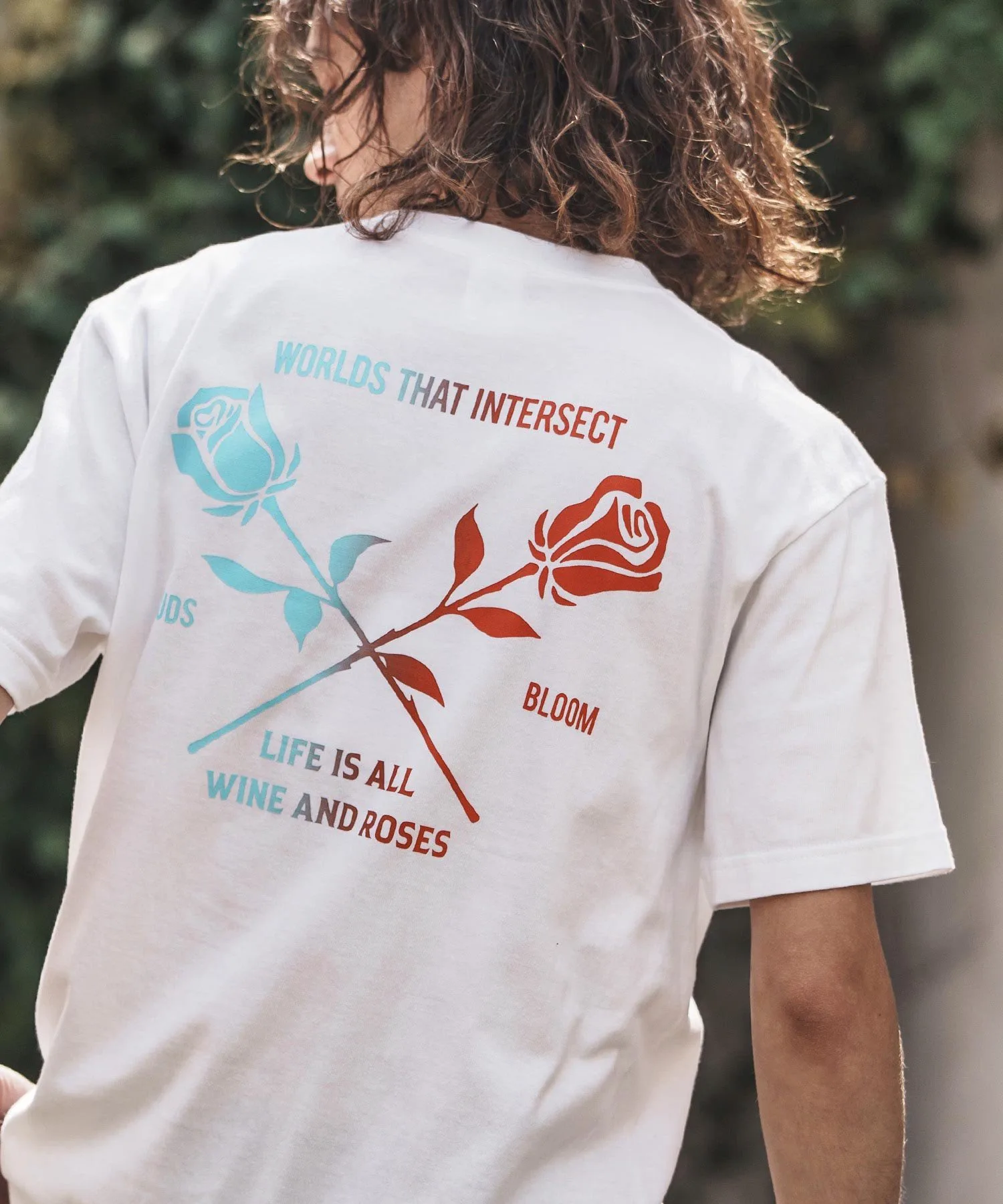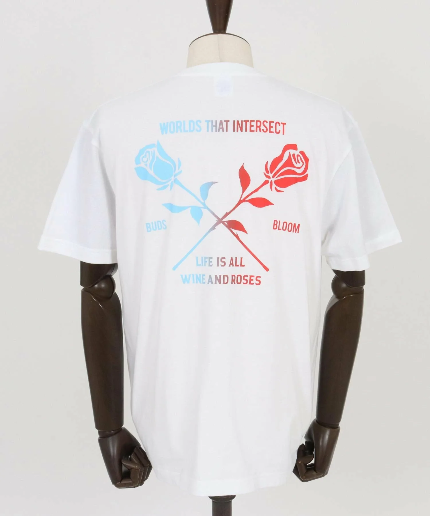 Футболка с принтом, на которой изображен рисунок розы, выполненный с использованием специальной техники, создающей градиент цветов от синего к красному.
