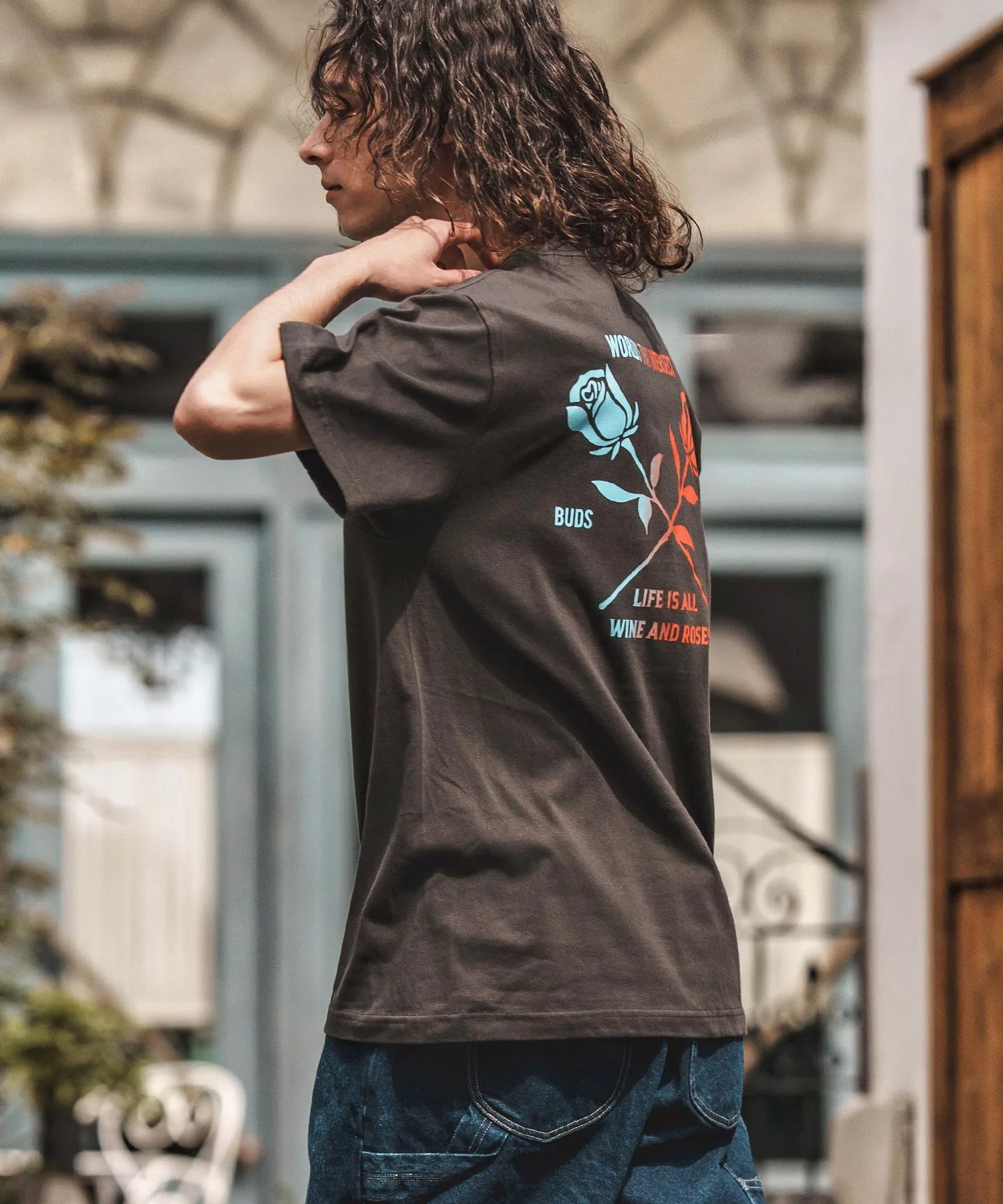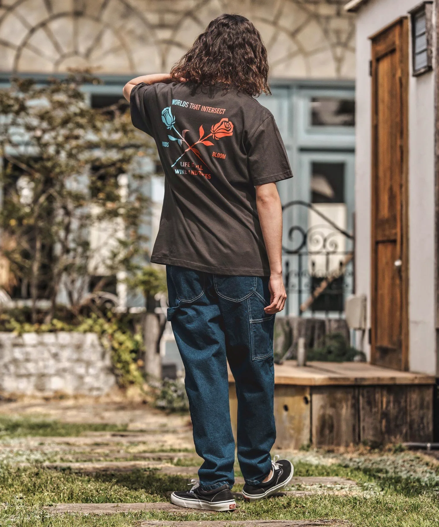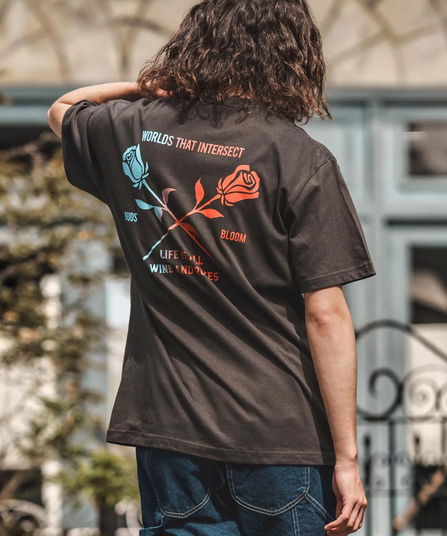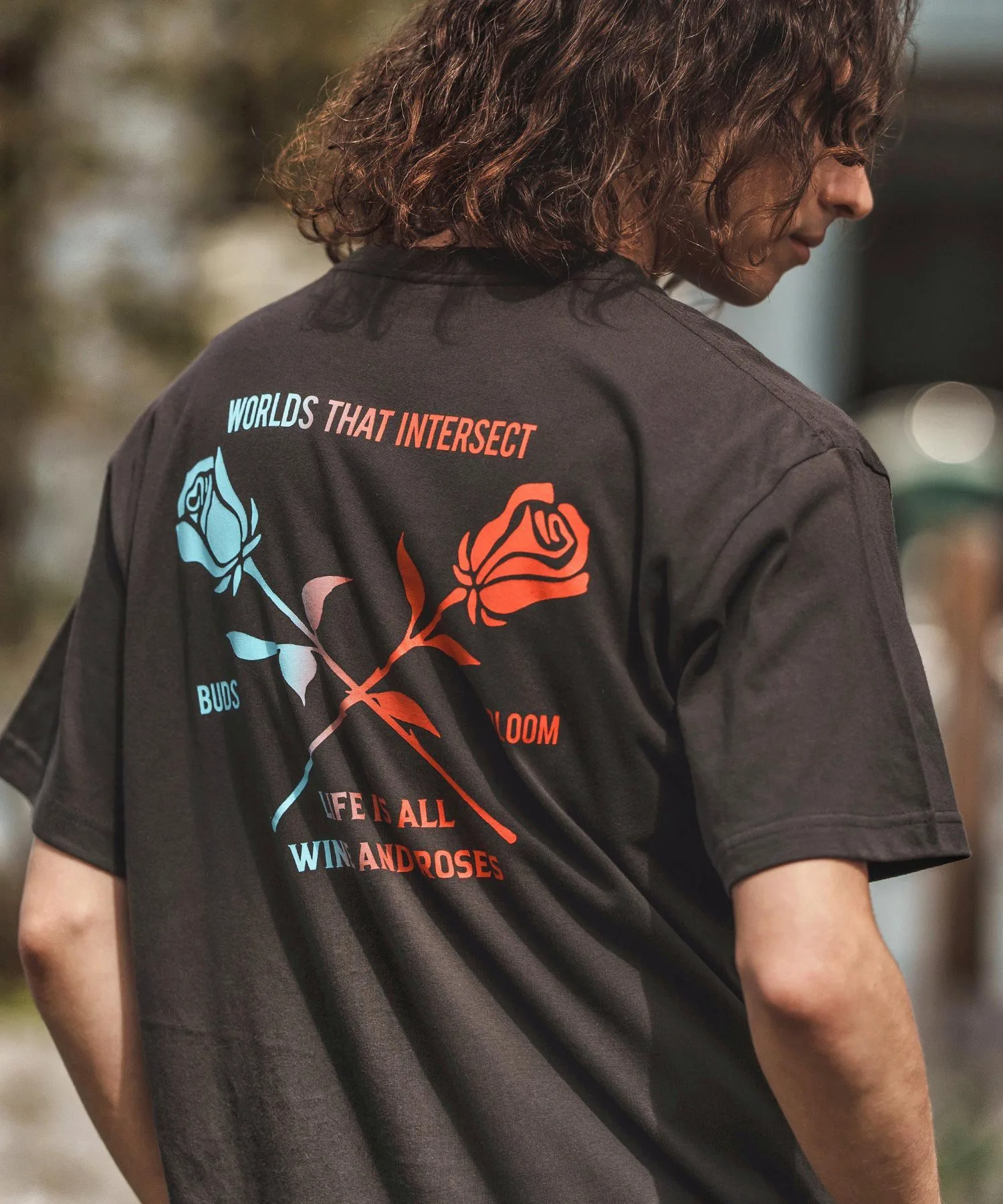 Футболка с принтом, на которой изображен рисунок розы, выполненный с использованием специальной техники, создающей градиент цветов от синего к красному.