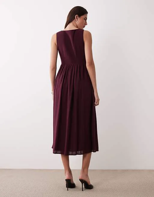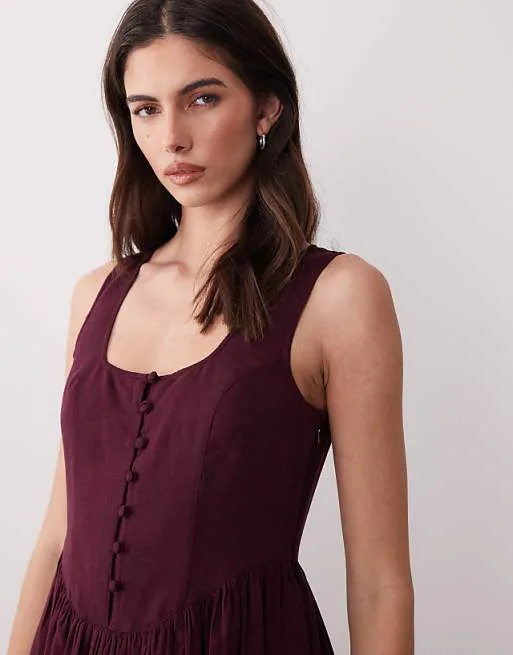 Платье выполнено в насыщенном темно-красном цвете, который придает образу глубину и выразительность. Квадратный вырез подчеркивает линию шеи и добавляет нотку утонченности. Застежка на пуговицы спереди создает стильный акцент и позволяет регулировать глубину выреза по вашему желанию. Отсутствие рукавов делает платье идеальным выбором для теплой погоды, обеспечивая свободу движений и комфорт.