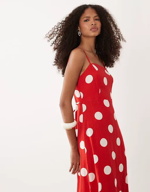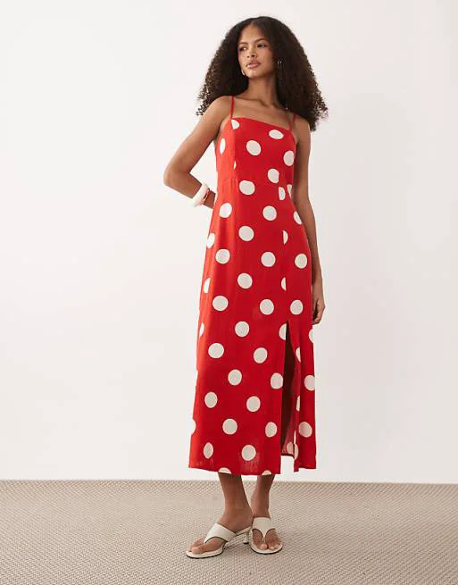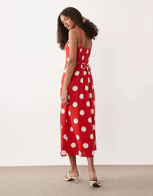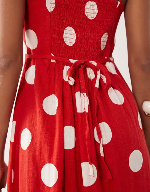 Платье украшено актуальным принтом в горошек, который никогда не выходит из моды и всегда выглядит женственно и элегантно. Квадратный вырез горловины добавляет изысканности и подчеркивает линию шеи. Регулируемые бретели позволяют адаптировать посадку платья под вашу фигуру, обеспечивая максимальный комфорт. Завязка на талии акцентирует силуэт, делая его более выразительным. Сборчатая вставка сзади добавляет объема и создает красивую драпировку. Разрез спереди придает образу легкость и игривость, позволяя продемонстрировать ноги при ходьбе.