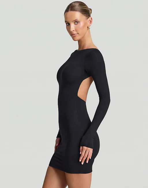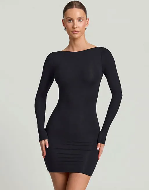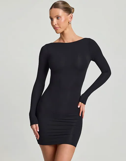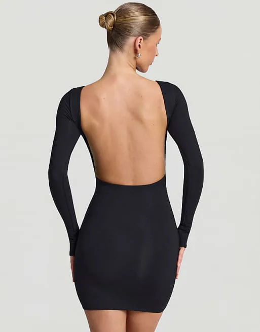 Одной из ключевых особенностей платья является его открытая спина, которая добавляет образу нотку соблазнительности и изысканности. Длинные рукава придают платью элегантность и делают его подходящим для прохладной погоды. Вырез лодочкой деликатно подчеркивает линию шеи и ключиц, добавляя образу утонченности.