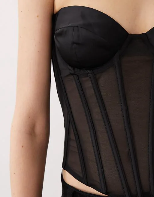 Особенностью модели является вставка из прозрачной сетки, которая деликатно обнажает кожу, придавая образу загадочность и чувственность. Корсетные косточки спереди обеспечивают идеальную посадку и поддерживают форму, создавая утонченный силуэт. Шнуровка на спине позволяет регулировать посадку по фигуре, обеспечивая максимальный комфорт.