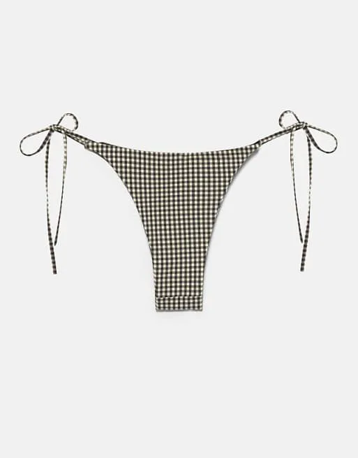 Плавки выполнены в классическом коричневом цвете с мелким клетчатым принтом, который всегда остается в тренде. Низкая посадка подчеркивает фигуру, а регулируемые завязки по бокам позволяют идеально подогнать плавки по фигуре, обеспечивая комфорт и уверенность в себе. Бразильский крой добавляет игривости и привлекательности образу.