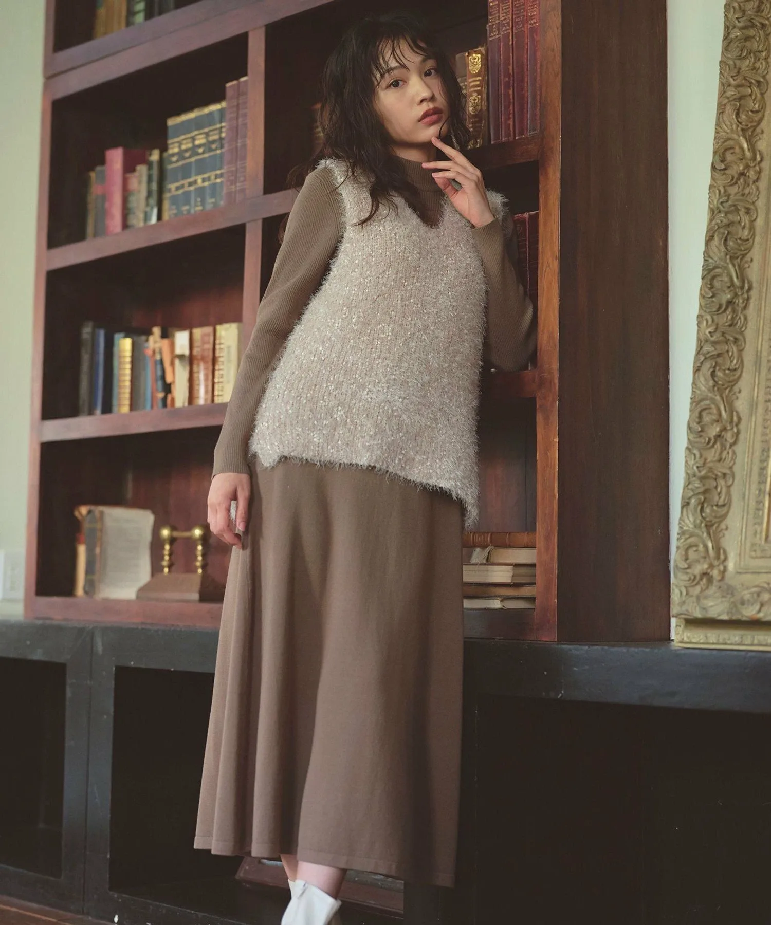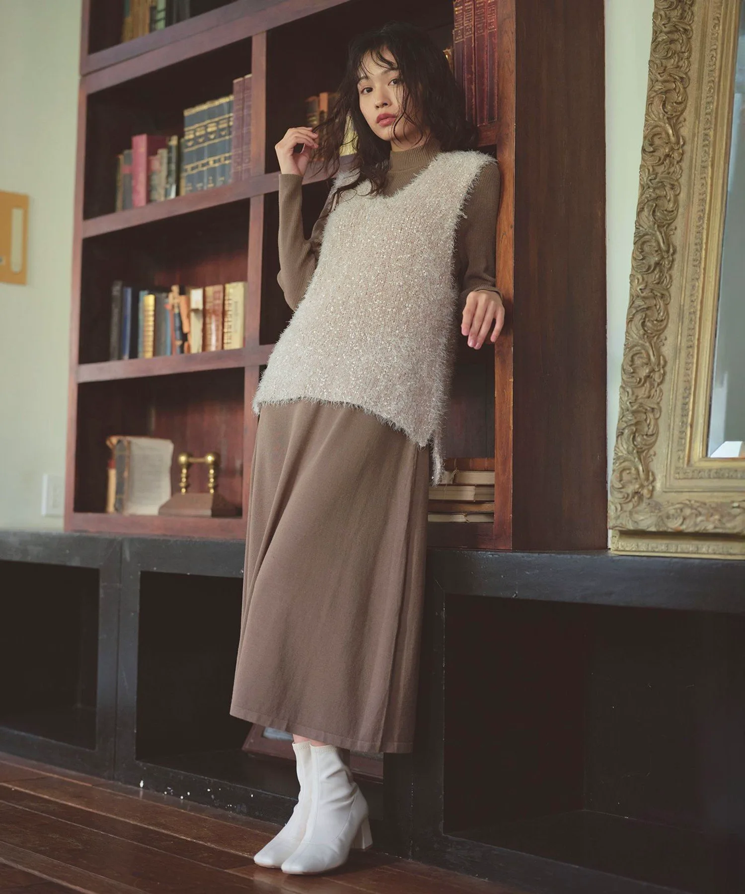 Этот вязаный жилет имеет твидовый вид благодаря ленточной пряже. Контраст с плоским вязаным платьем создает стильный образ.