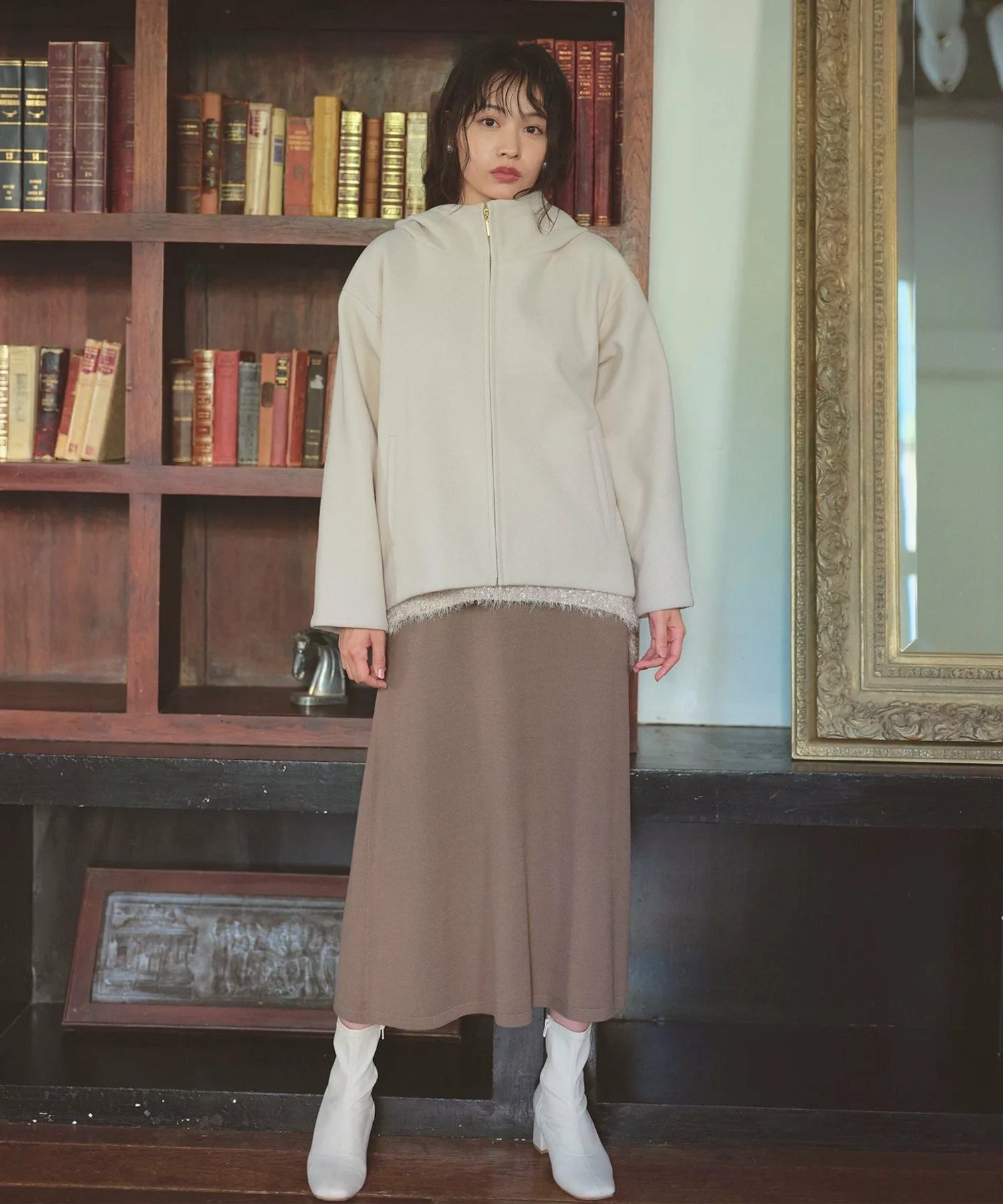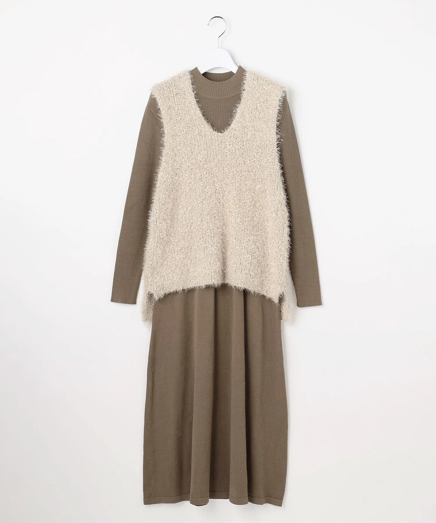 Этот комплект из вязаных вещей включает в себя яркий жилет и платье с чистым, выгодно подчеркивающим фигуру силуэтом. Легко создать модный многослойный образ! Жилет имеет твидовую отделку с использованием ленточной пряжи. Его текстурированная поверхность приятна на ощупь. Платье имеет чистый, элегантный силуэт. Расклешенный силуэт скрывает недостаток вязаных платьев, которые, как правило, подчеркивают фигуру, а плотная ткань обеспечивает комфортную посадку.