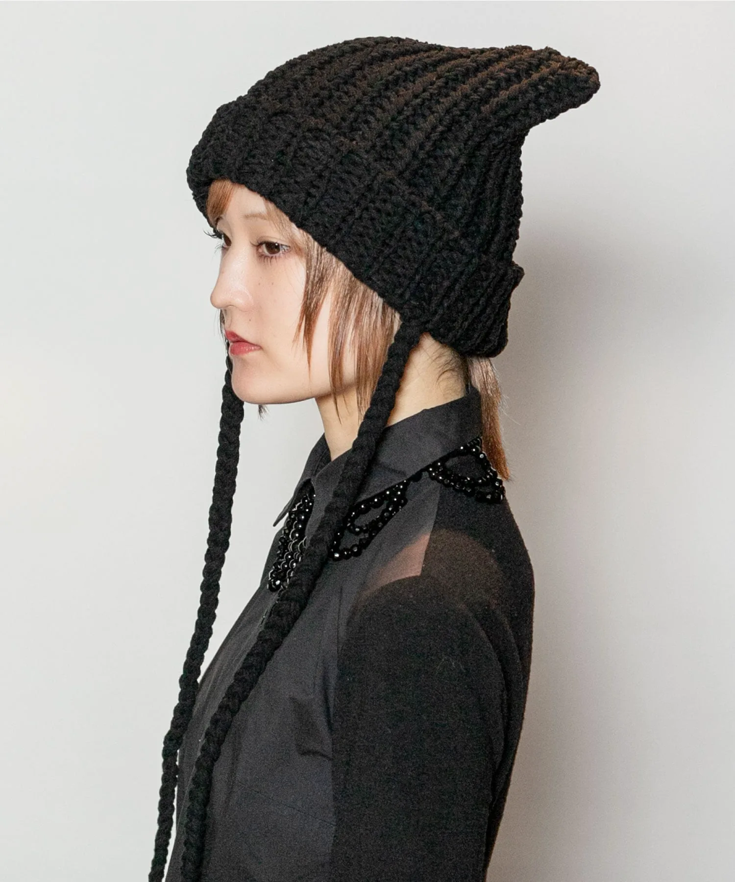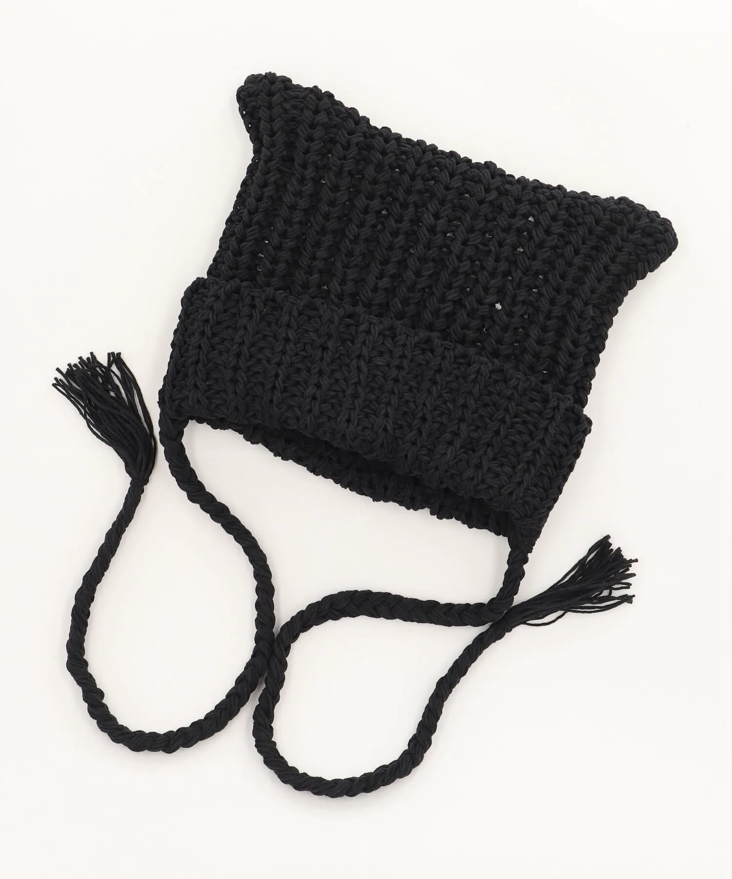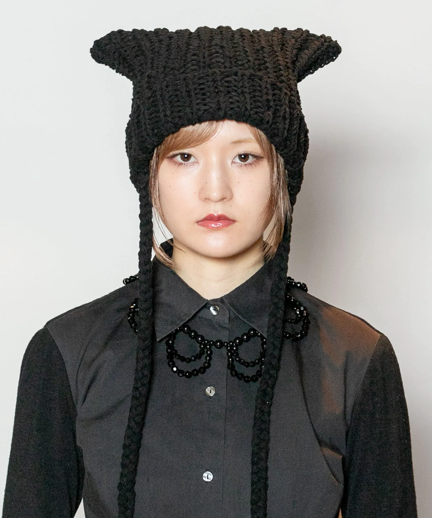 Милый силуэт с кошачьими ушками, прикрепленными к вязаному полотну. Свисающие по бокам завязки также являются изюминкой.