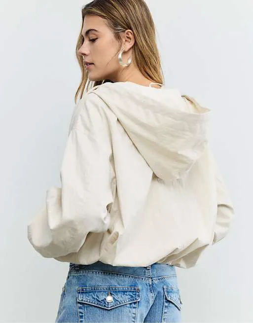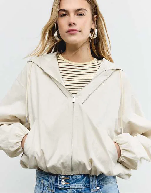 Нейлоновая куртка с капюшоном Stradivarius Basic цвета экрю