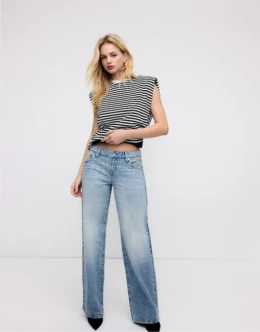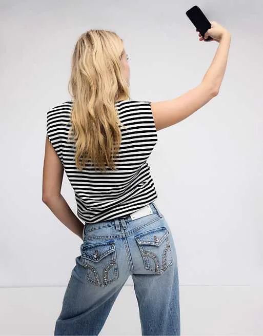 Черная полосатая футболка с уплотненными плечами Stradivarius Basic 3 980₽
