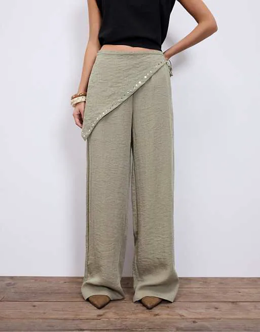Особенностью модели является струящийся шарф, который добавляет образу легкость и динамичность. Шарф изящно обрамляет силуэт, создавая эффектный акцент и придавая брюкам уникальный вид. Завязываются на талии, подчеркивая ее изгиб и создавая женственный силуэт. Обернутый перед с декоративными заклепками добавляет изюминку и делает модель более выразительной.