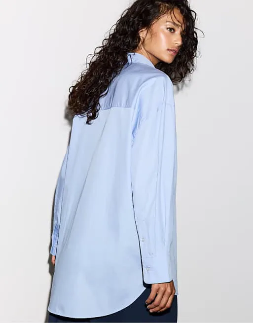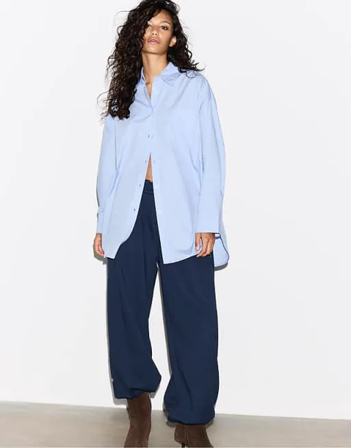 Представляем вашему вниманию стильную голубую рубашку оверсайз, которая станет прекрасным дополнением к вашему гардеробу. Эта рубашка сочетает в себе комфорт и современный дизайн, идеально подходя для создания расслабленных и модных образов.