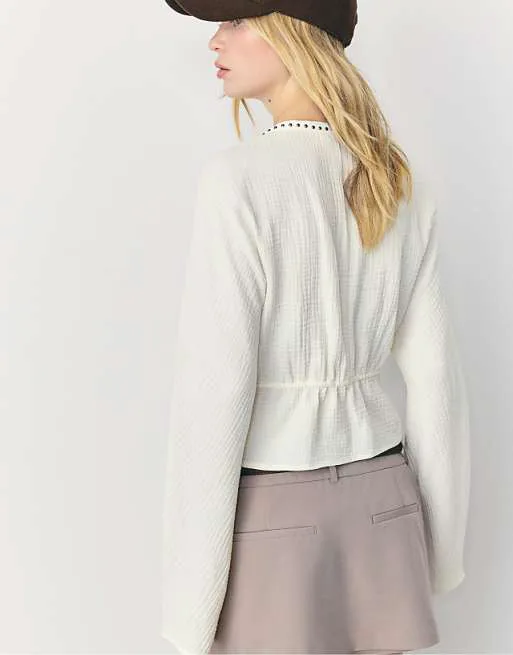 Представляем рубашку Stradivarius Open цвета экрю, которая станет изысканным дополнением к вашему гардеробу. Эта рубашка сочетает в себе элегантность и дерзость, создавая неповторимый образ. Фактурная ткань придает изделию особый шарм, а V-образный вырез подчеркивает изящность шеи.