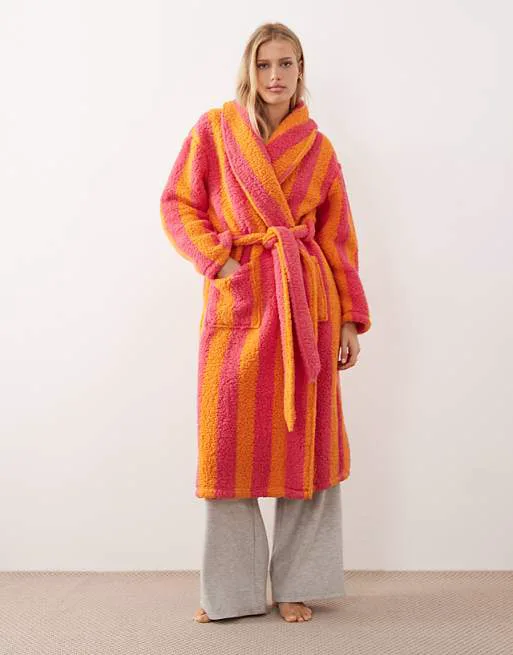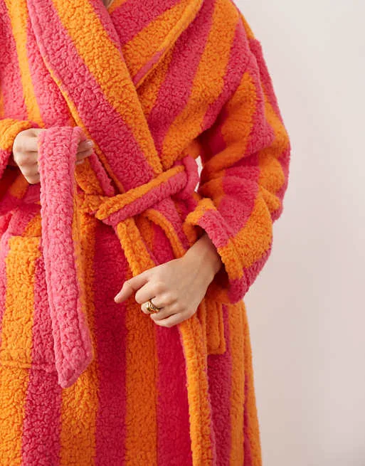 Дизайн халата выполнен в яркой полосатой расцветке, сочетающей оранжевый и цвет фуксии, что придает ему оригинальный и привлекательный вид. Шалевый воротник добавляет элегантности и обеспечивает дополнительное тепло для шеи. Халат имеет удобный крой оверсайз, который не сковывает движений и подходит для любого типа фигуры.