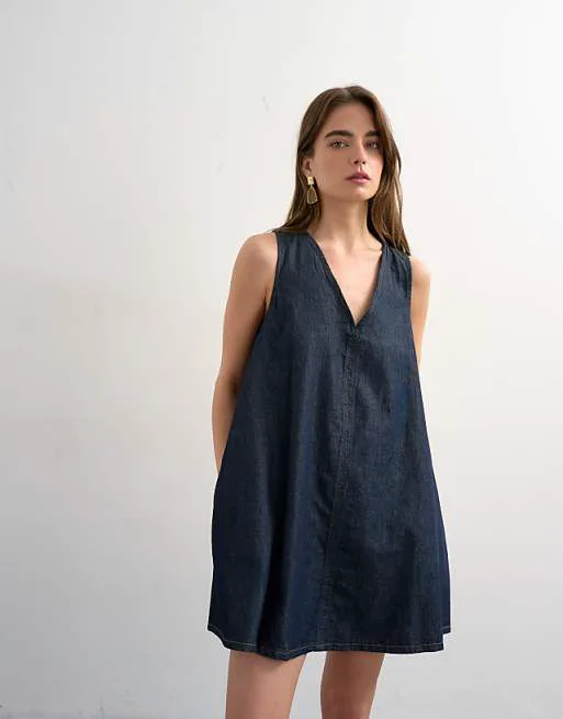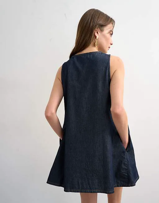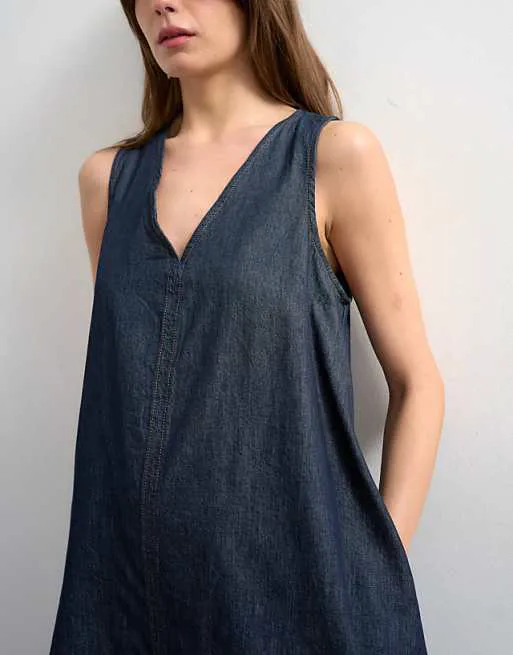 Платье выполнено из плотного, но приятного на ощупь денима темно-синего цвета. Этот оттенок денима является универсальным и легко сочетается с различными аксессуарами и обувью, позволяя создавать разнообразные образы – от повседневных до более формальных.