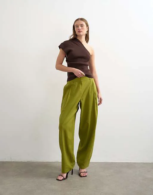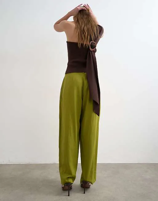 Представляем вашему вниманию стильные брюки от Topshop, выполненные в актуальном бочкообразном крое. Эти брюки станут отличным выбором для создания как повседневных, так и более формальных образов. Зеленый цвет ткани придает изделию свежесть и оригинальность, делая его заметным элементом гардероба.