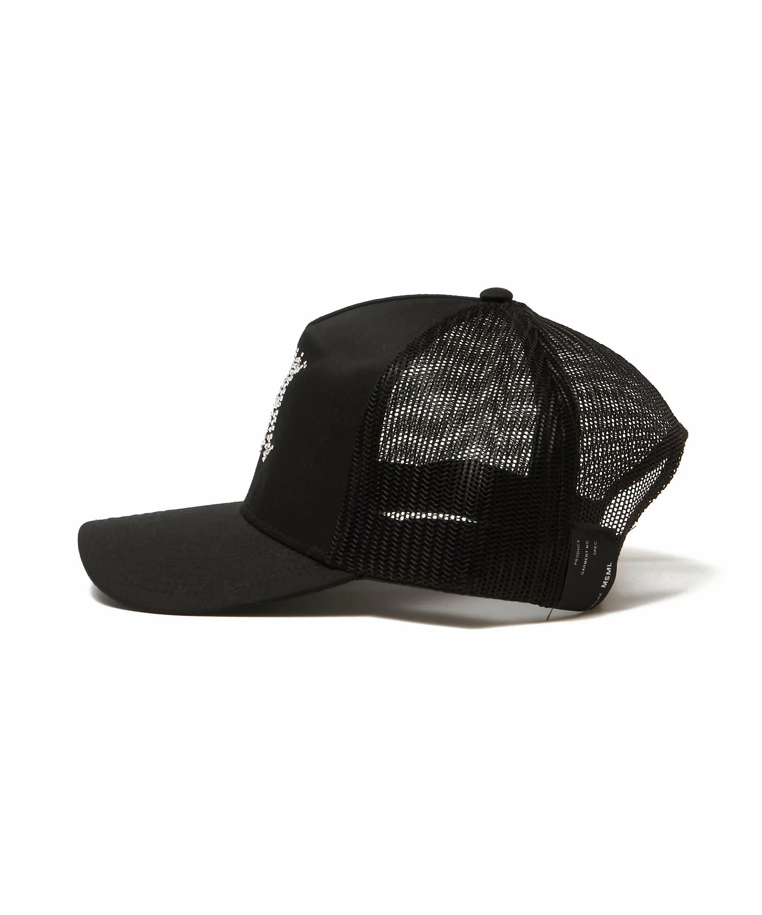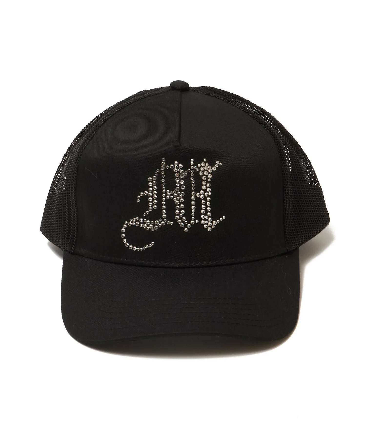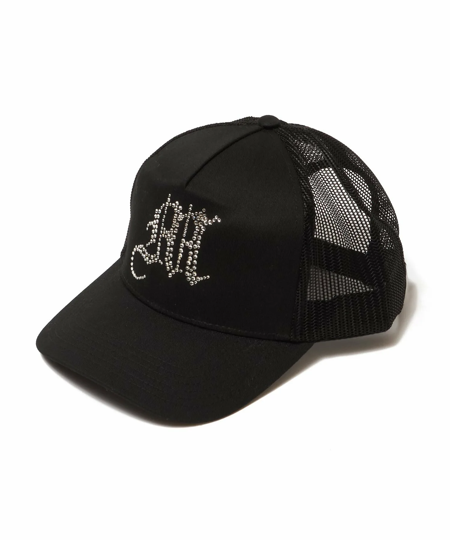 сетчатая кепка с логотипом «M», выполненным из сверкающих стразов.