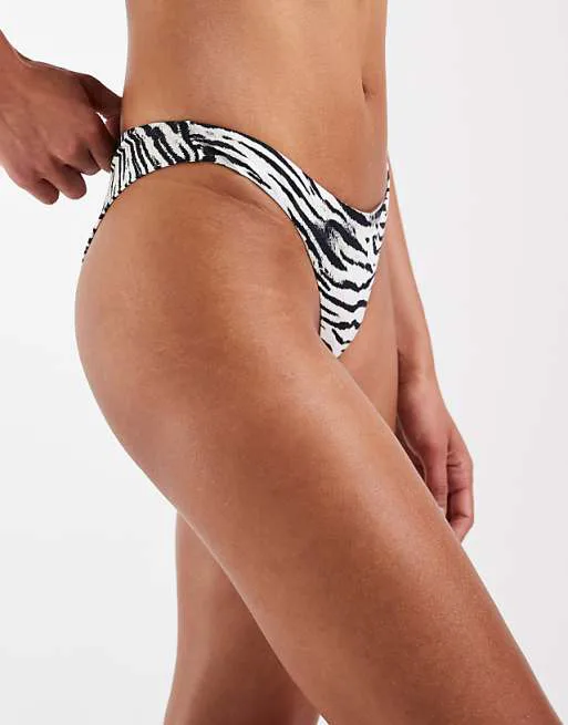 Дизайн трусиков бикини выполнен в актуальном стиле с использованием принта зебры, который всегда остается в тренде. Этот смелый и выразительный принт добавит вашему образу нотку дикости и элегантности. Низкая посадка трусиков бикини подчеркивает линию талии, делая силуэт более изящным. Бразильский крой обеспечивает комфортную посадку и позволяет чувствовать себя уверенно на пляже или у бассейна.