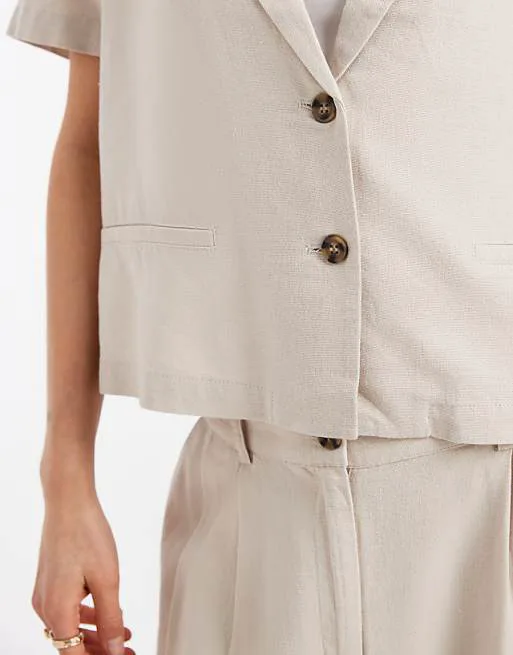 Блейзер выполнен из ткани полотняного переплетения, что придает ему особую текстуру и делает его приятным на ощупь. Сочетание вискозы и льна в составе ткани обеспечивает отличную воздухопроницаемость и комфорт в носке, что делает его идеальным выбором для теплой погоды. Короткие рукава добавляют модели легкости и непринужденности, а также позволяют комбинировать блейзер с различными вариантами одежды.