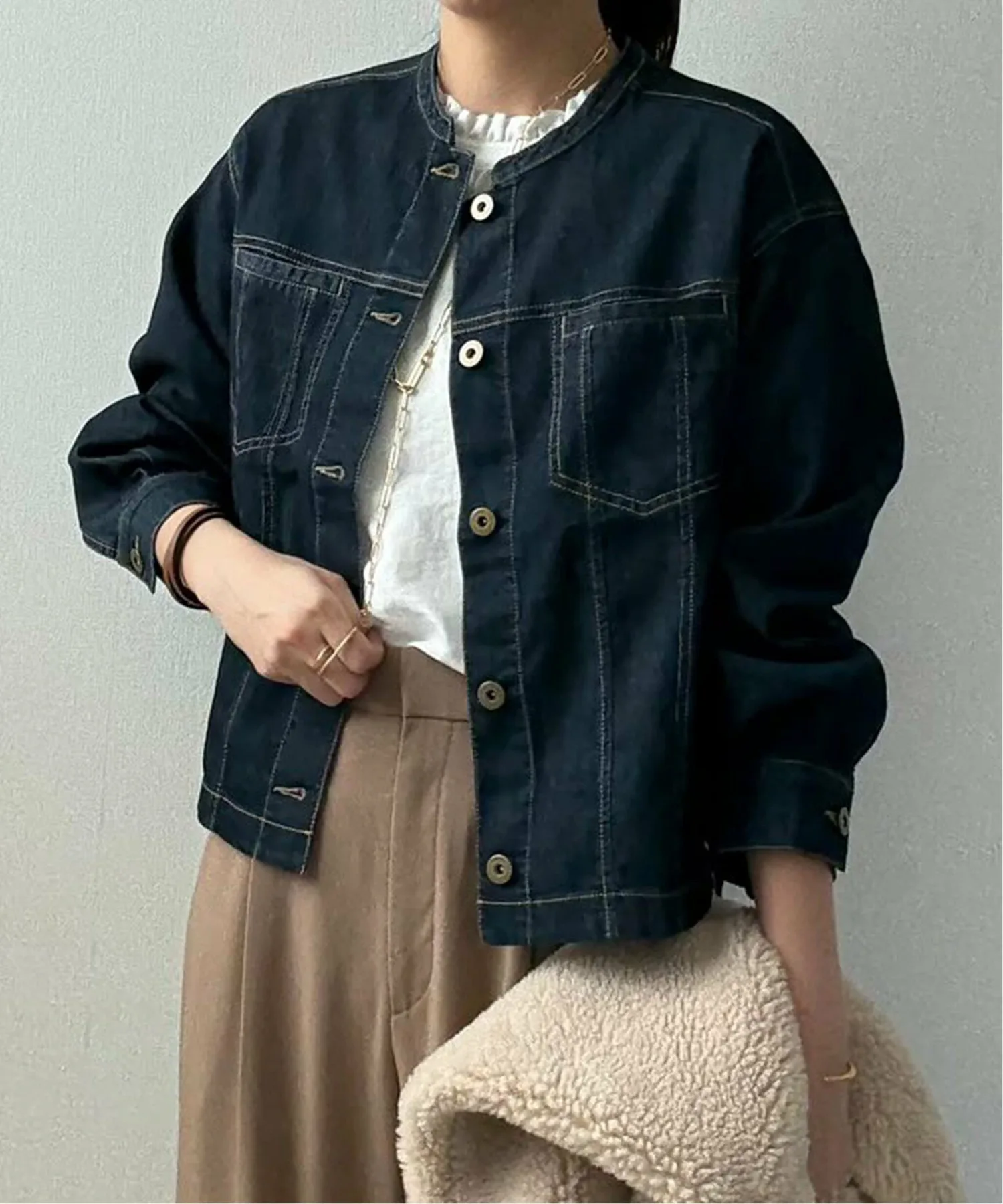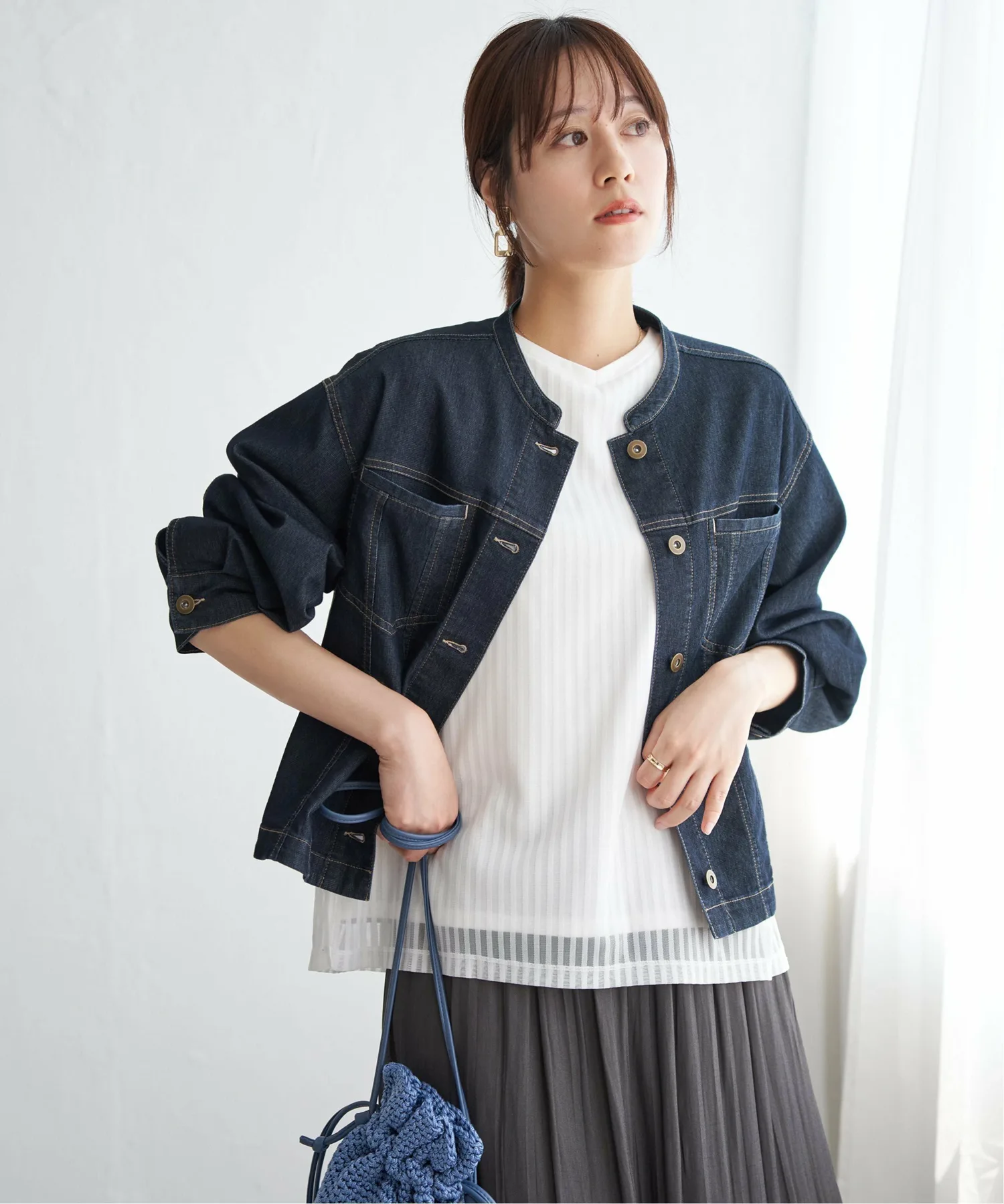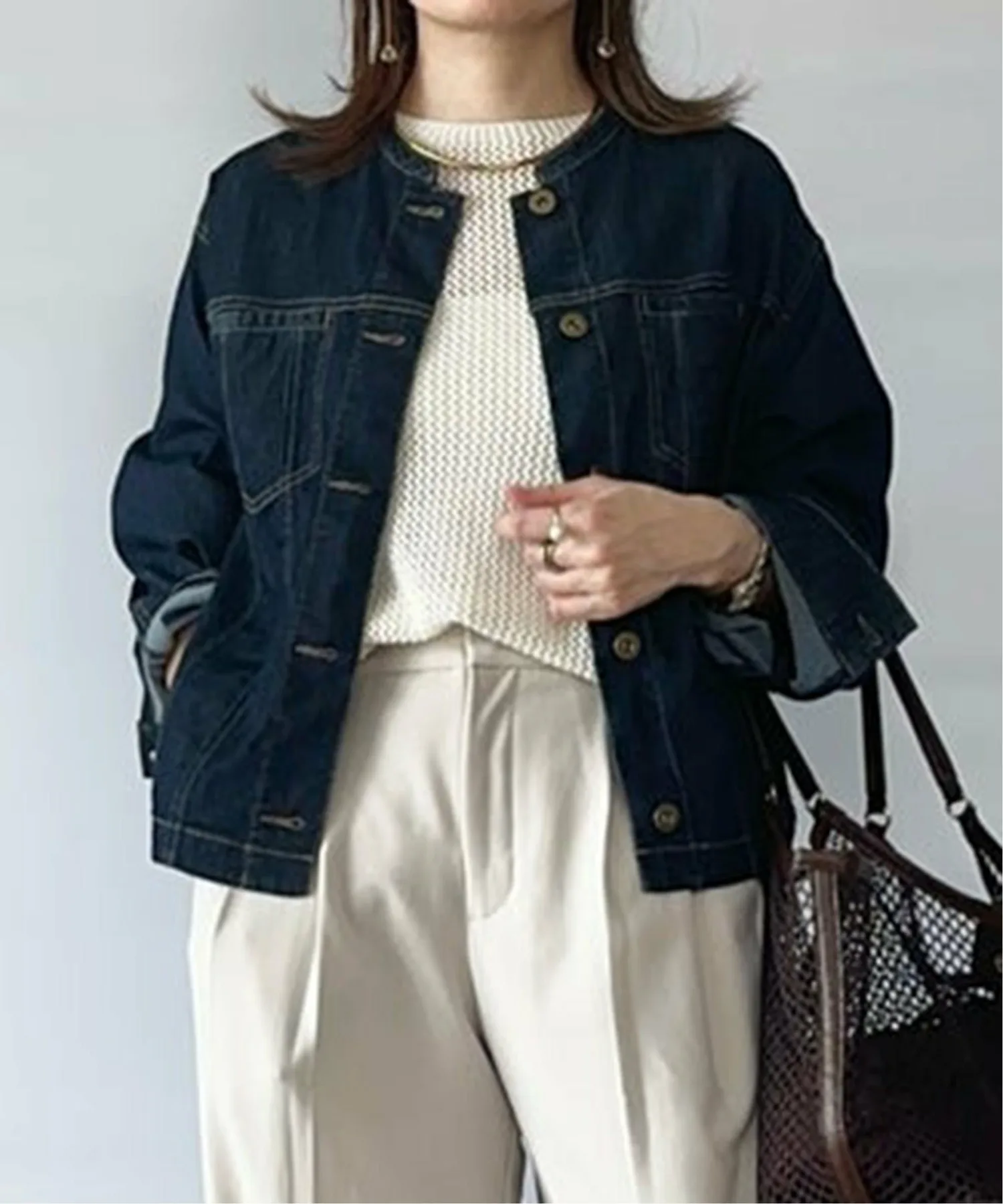 ・Джинсовая куртка с сетчатым воротником-стойкой.