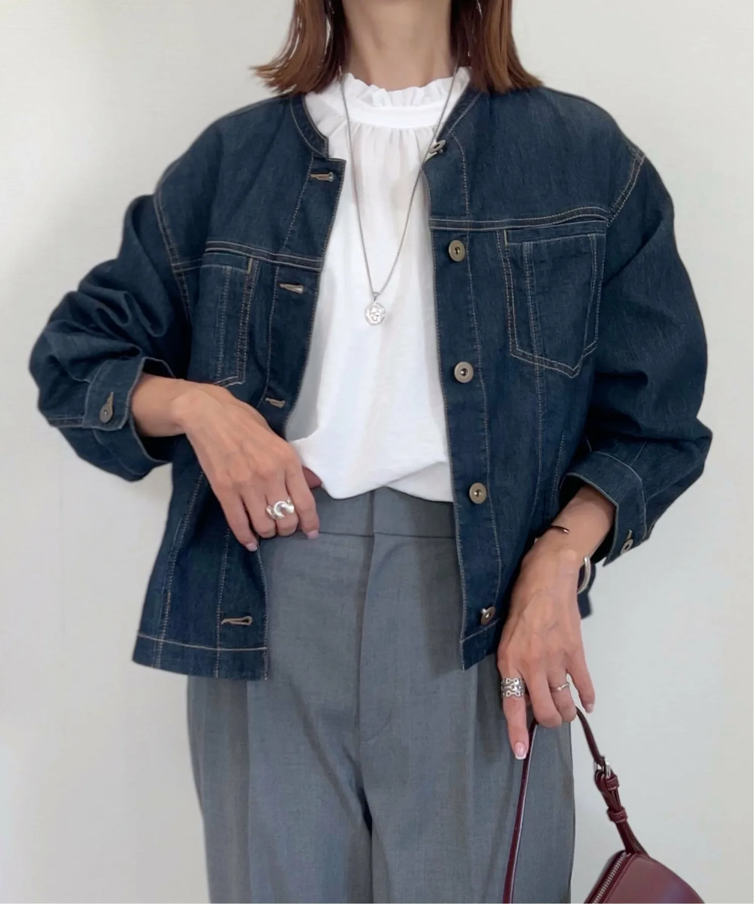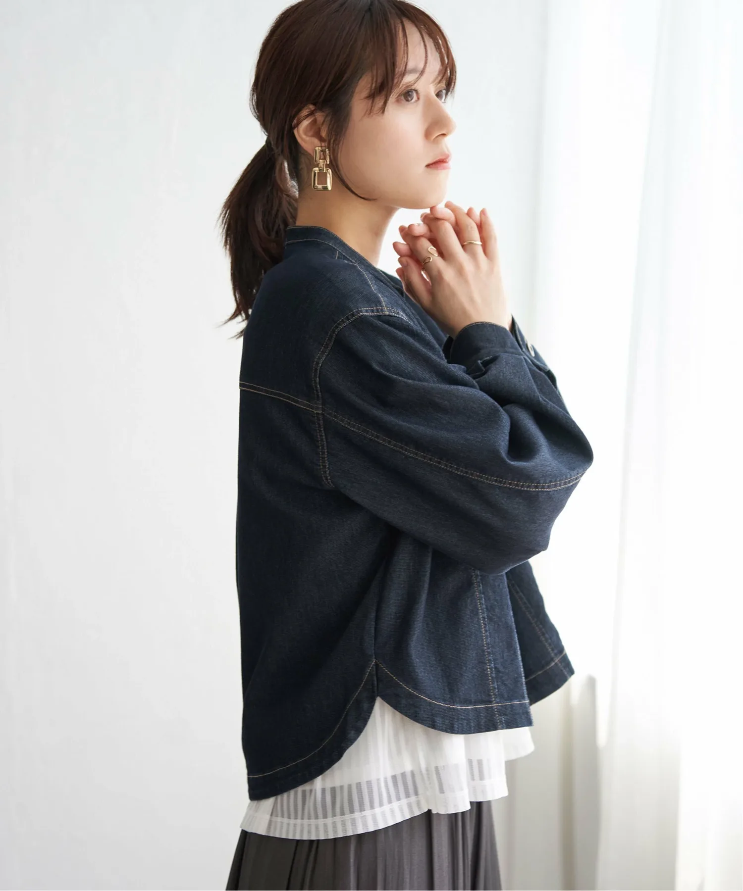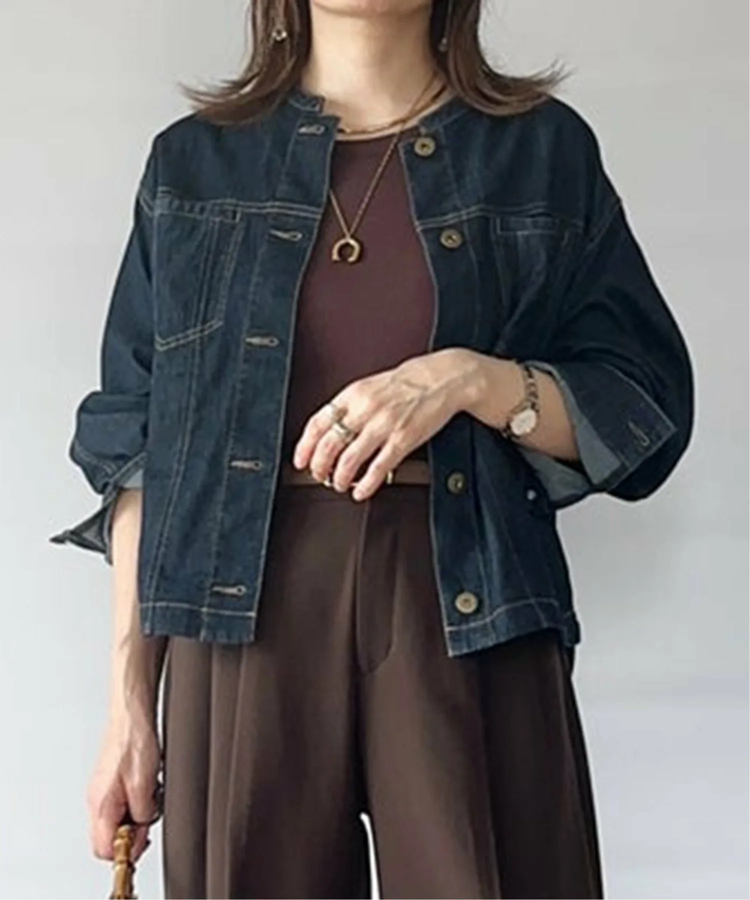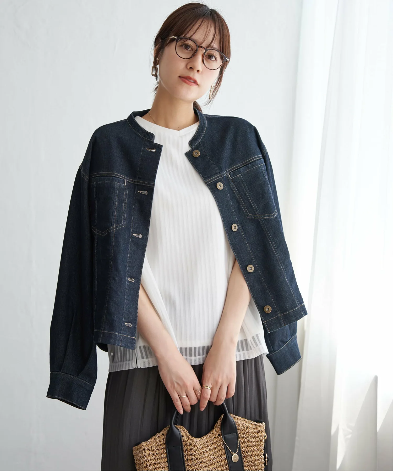 ・Джинсовая куртка с сетчатым воротником-стойкой.