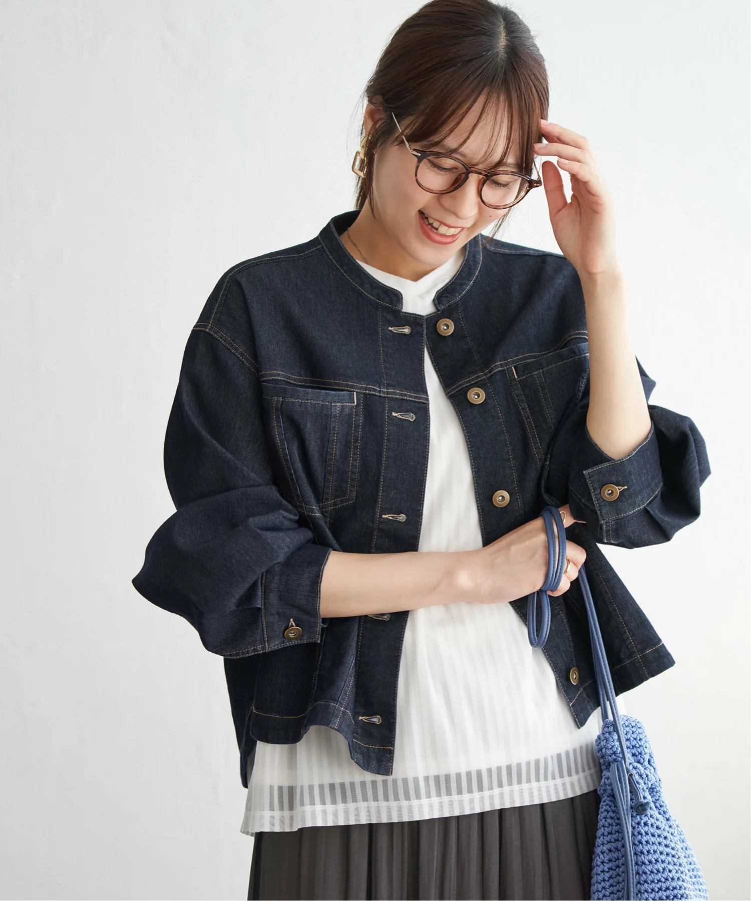Блузон без воротника из сетчатого материала, придающего джинсовому виду лёгкий блеск.