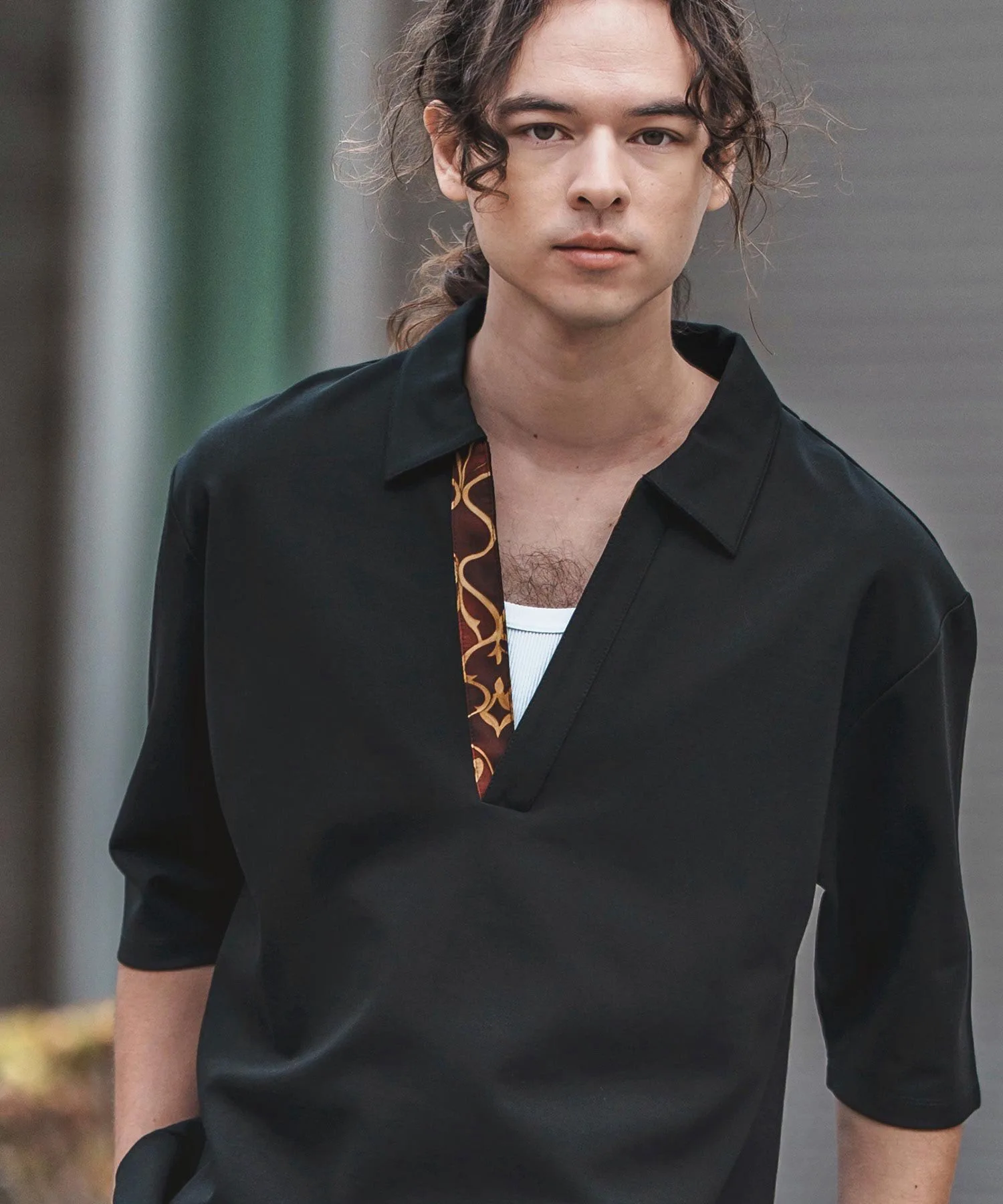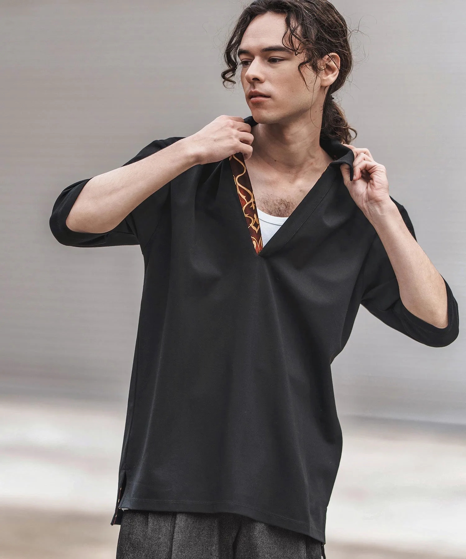 По бокам подола есть разрезы, создающие разницу в длине между передней и задней частью.