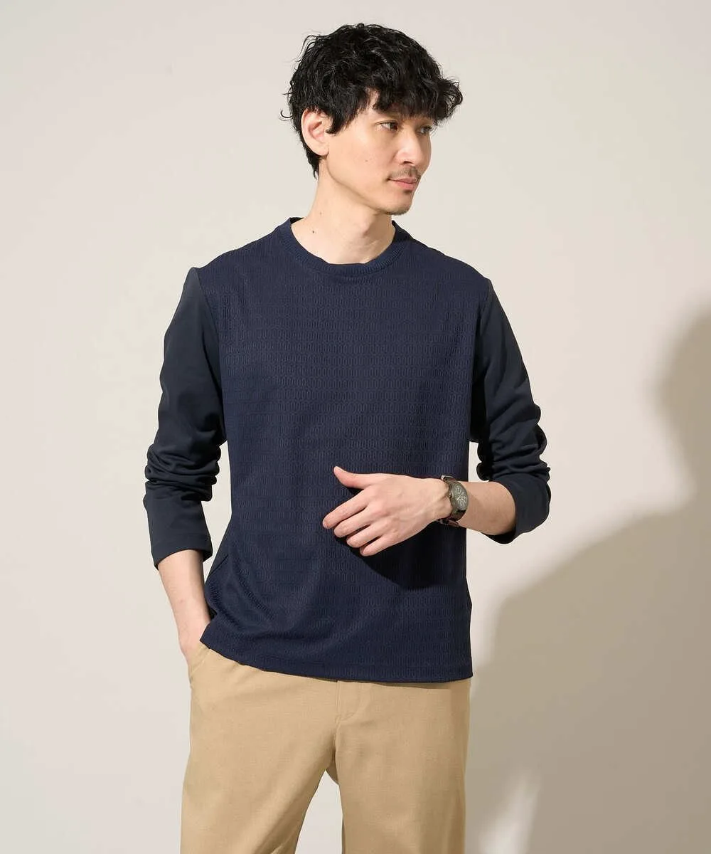 Передняя часть выполнена из мелкого овального жаккардового трикотажа, придающего ей вид вязаного полотна, а рукава и спинка — из трикотажного полотна понте аналогичного цвета с красивой текстурой. Воротник выполнен из трикотажа, а не из ребристой вязки, что придает футболке более элегантный и роскошный вид в качестве нижнего слоя для школьницы.