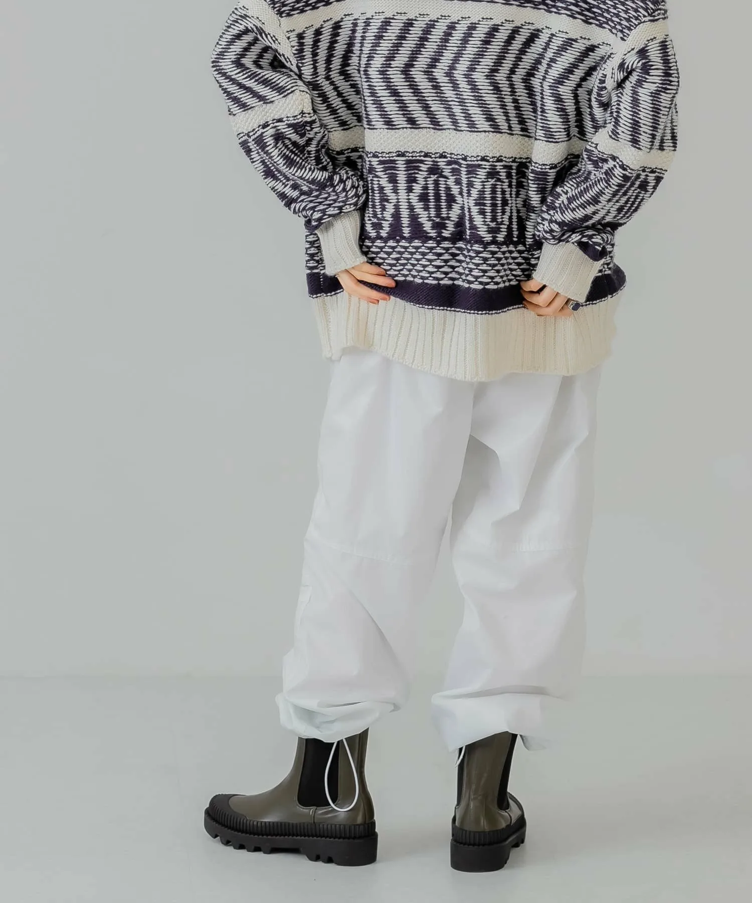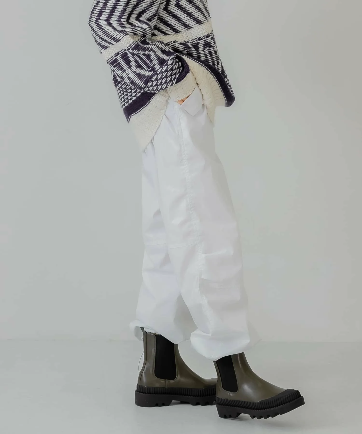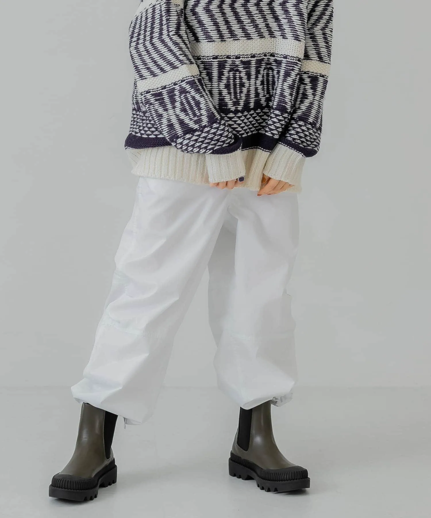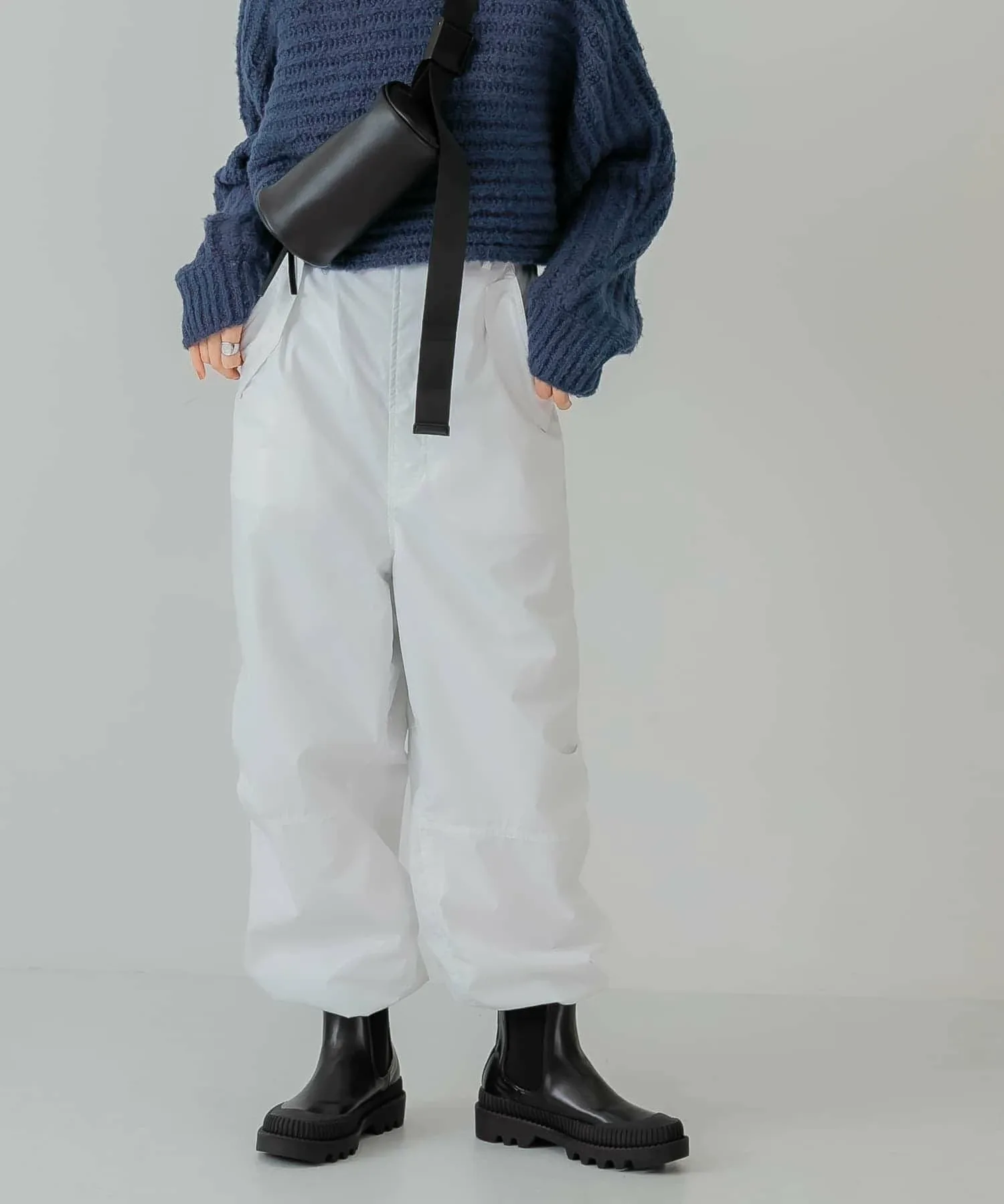 Как следует из названия, эти брюки добавят непринужденности образу, в котором много элементов рабочего стиля. Легкая хлопчатобумажная ткань покрыта смолой для плотного прилегания. Нижний край имеет шнурок, поэтому вы можете регулировать посадку в соответствии со своим настроением. Эта вещь идеально сочетается с трикотажем.