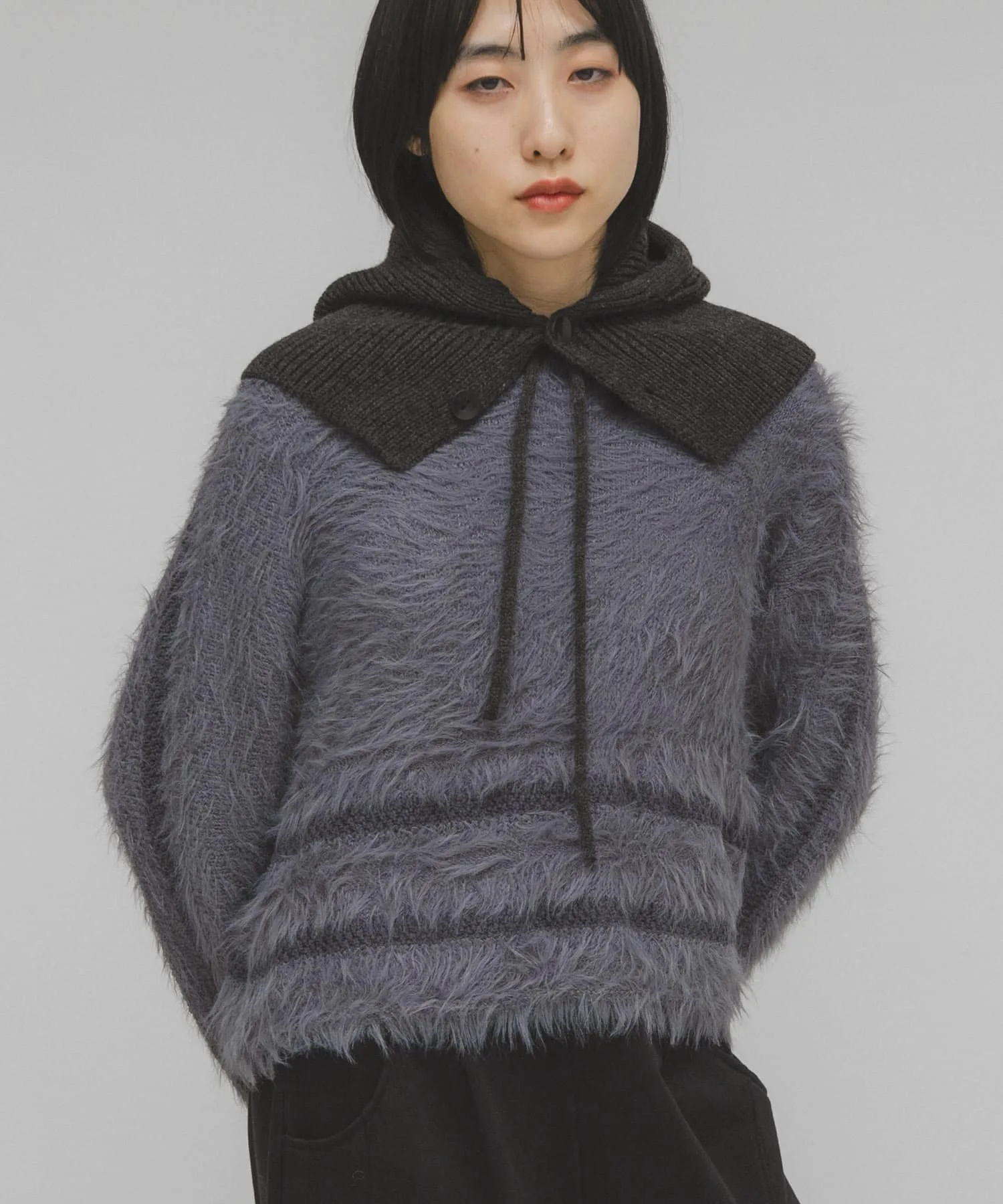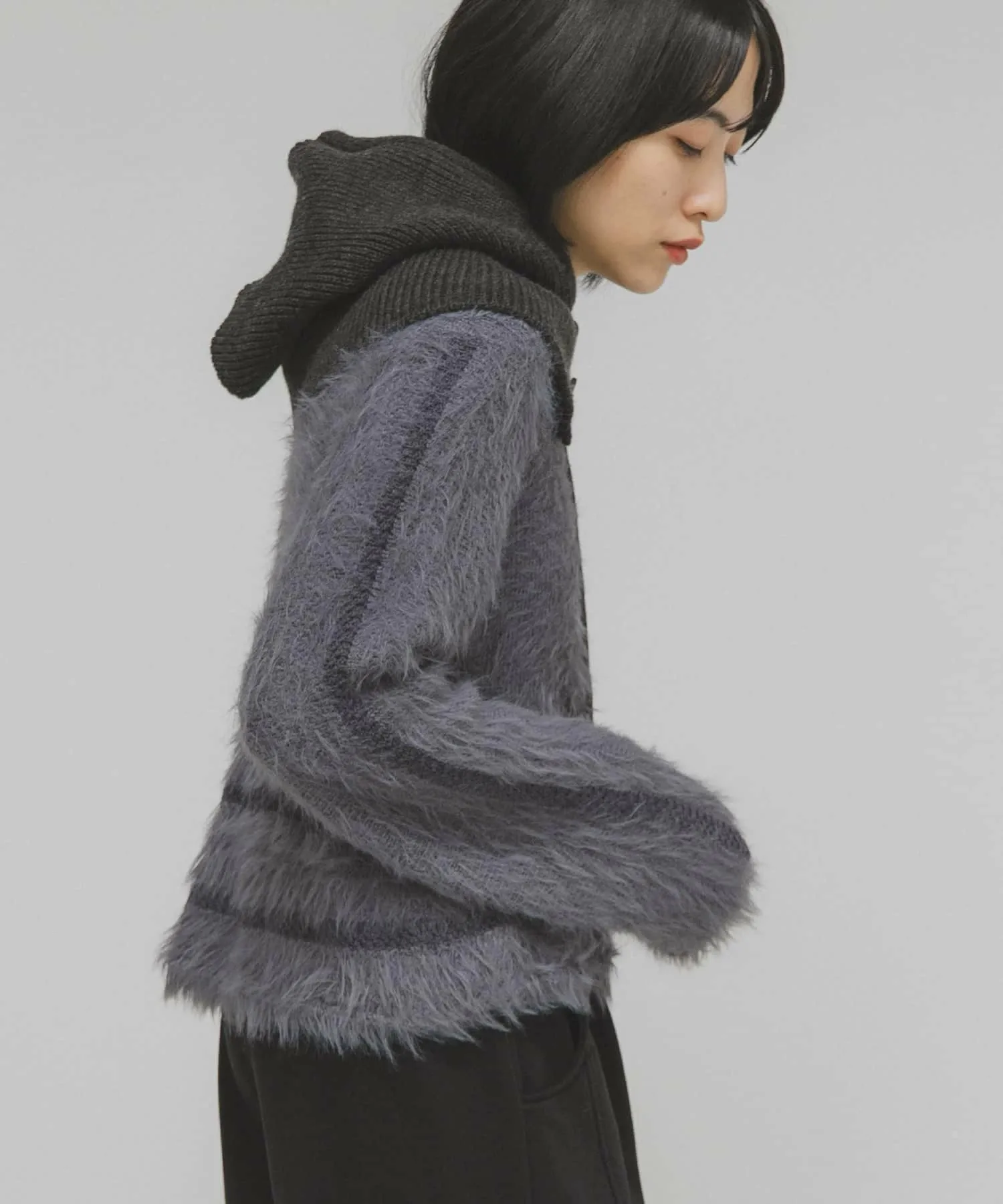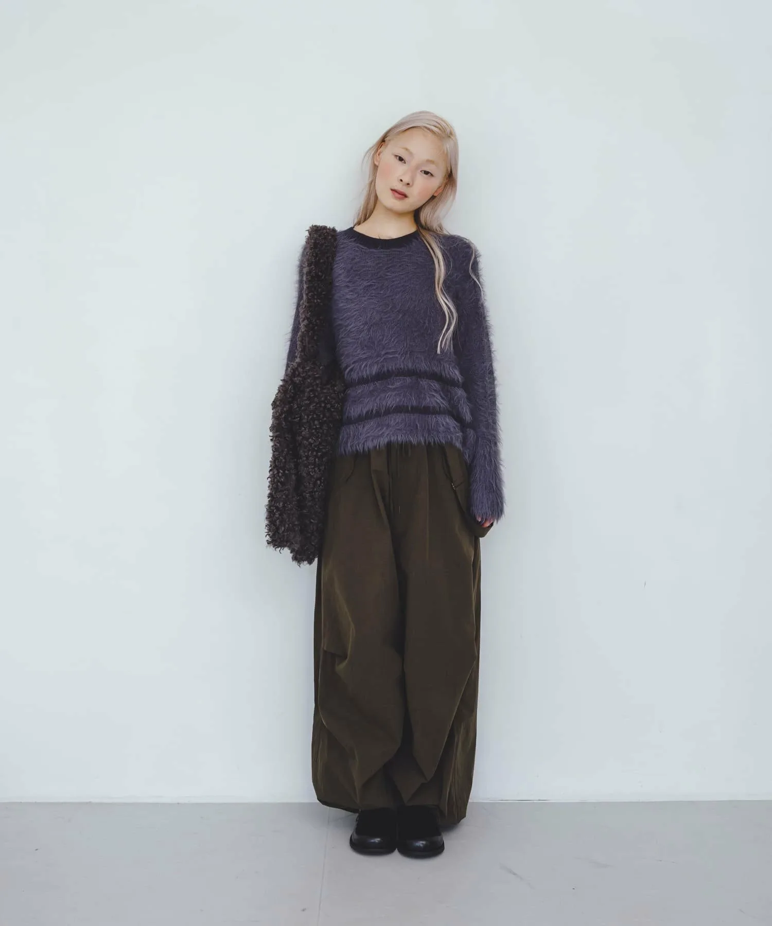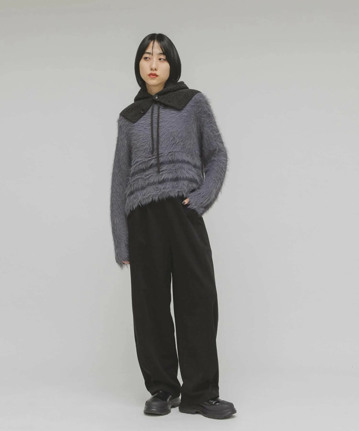 Эта вязка отличается выразительным воротником, а также линиями подола и рукавов, выполненными из разных видов пряжи. Материал мягкий на ощупь и имеет женственную драпировку, что делает его привлекательным. Ворсистая отделка добавляет сезонный колорит, а сочетание с базовыми брюками создает эффектный образ. Мы также предлагаем ворсистую вязаную шапку (KBA7-2CR104) из того же материала.