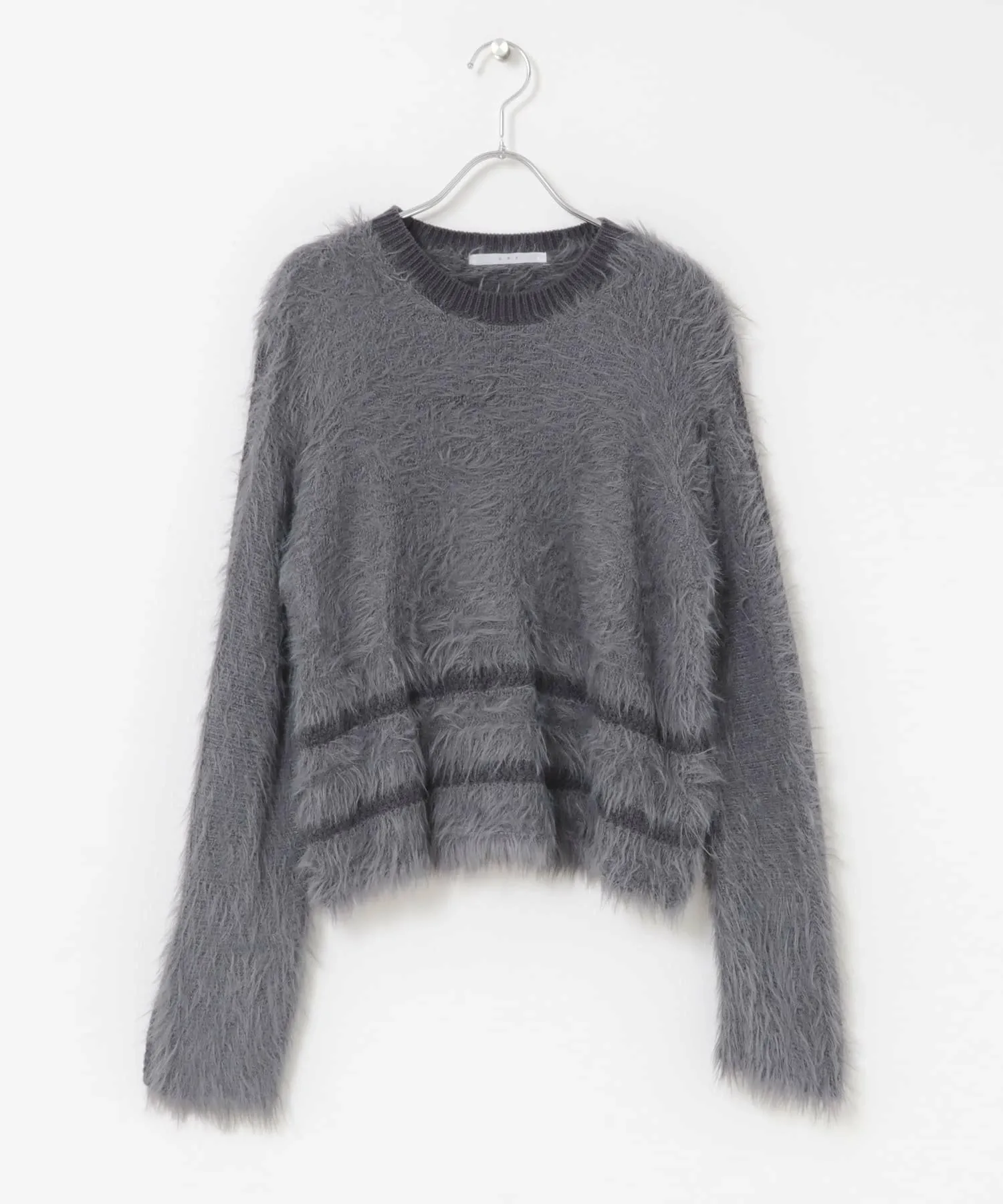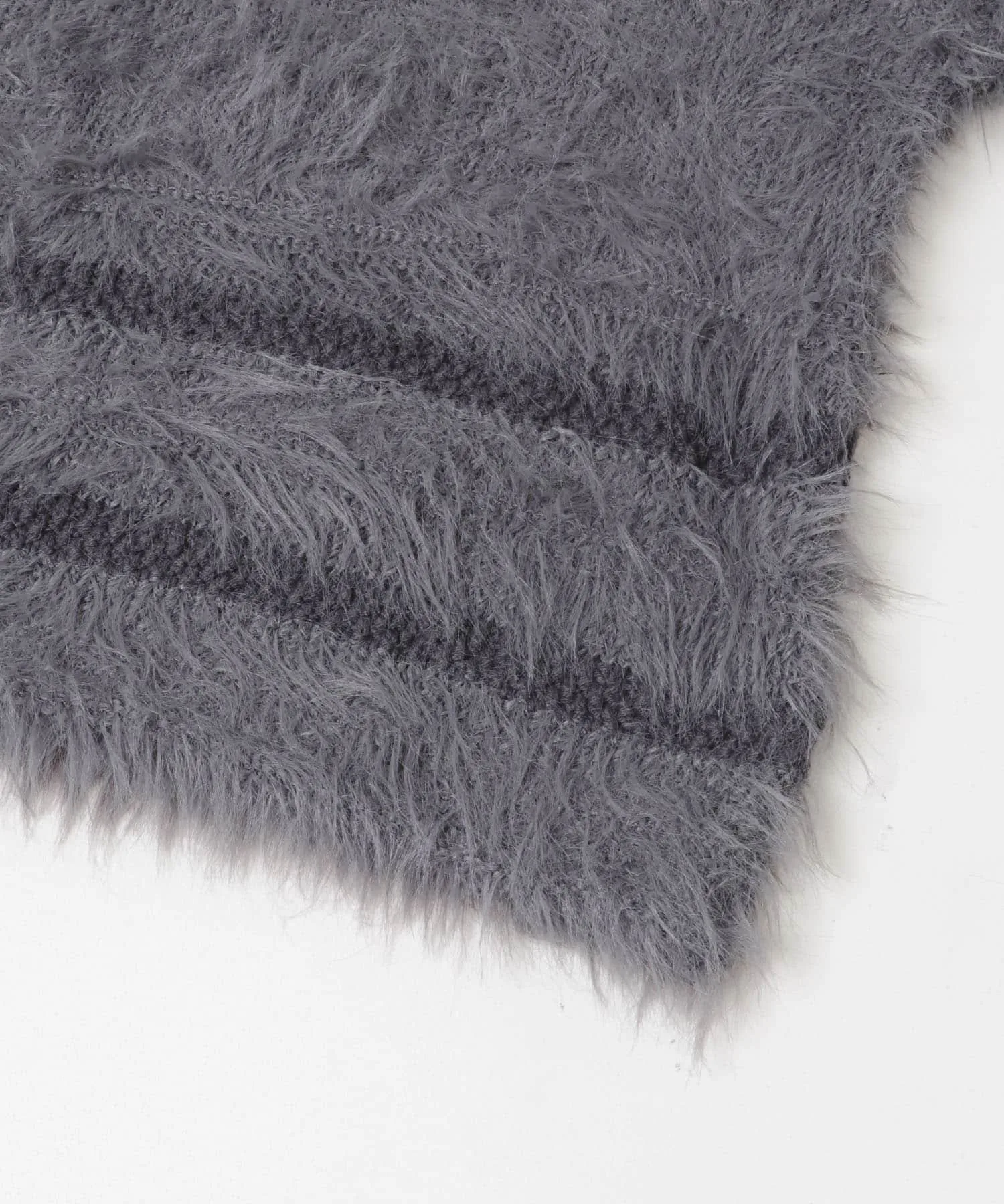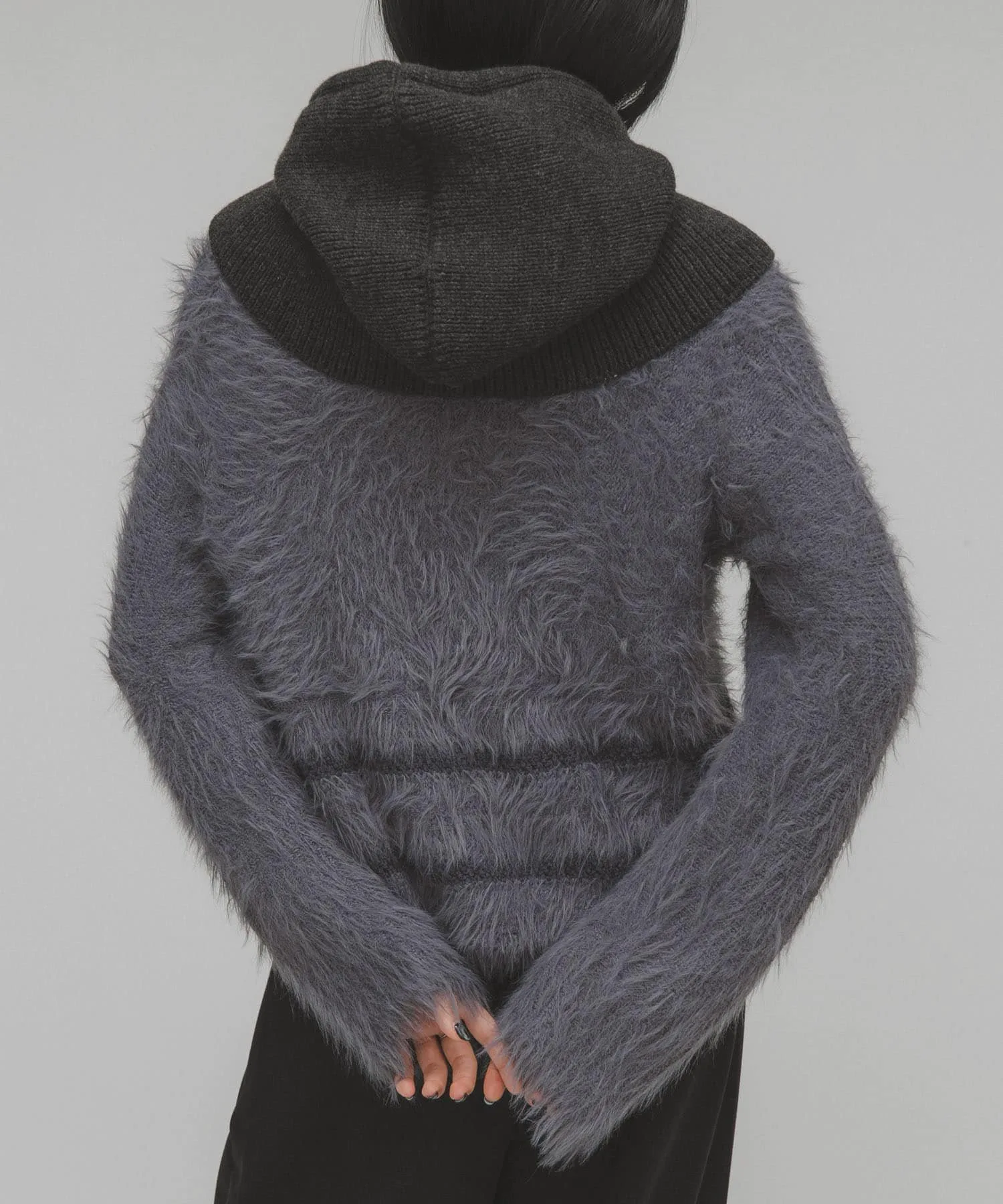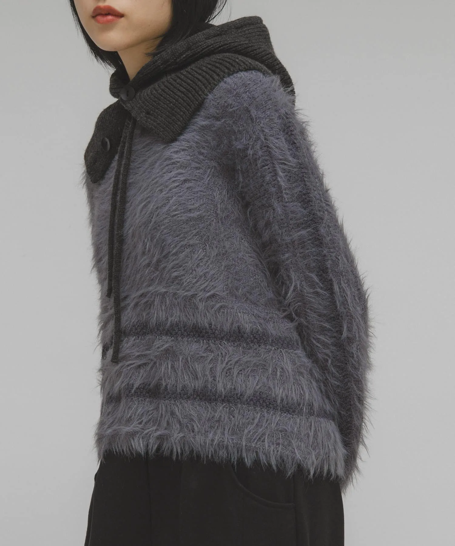 Эта вязка отличается выразительным воротником, а также линиями подола и рукавов, выполненными из разных видов пряжи. Материал мягкий на ощупь и имеет женственную драпировку, что делает его привлекательным. Ворсистая отделка добавляет сезонный колорит, а сочетание с базовыми брюками создает эффектный образ. Мы также предлагаем ворсистую вязаную шапку (KBA7-2CR104) из того же материала.
