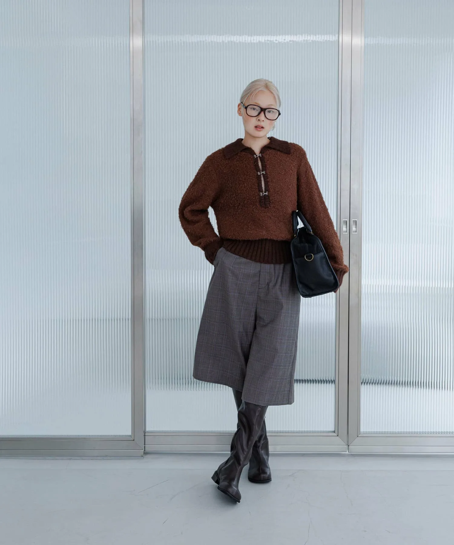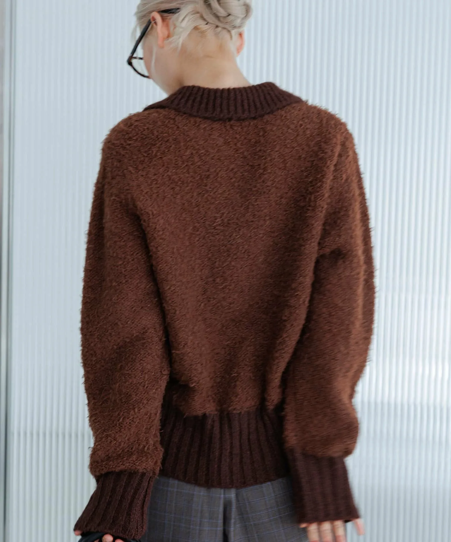 Вязаное полотно с плотной вязкой и застежкой на крючок спереди. Несмотря на приятный общий вид, фасон «поло» добавляет непринужденности. Ношение с расстегнутой застежкой на крючок спереди создает аккуратный вид вокруг шеи, придавая ощущение расслабленности. Немного укороченная длина также выполнена с использованием ребристой ткани, которая надежно фиксирует талию, создавая естественный округлый силуэт.