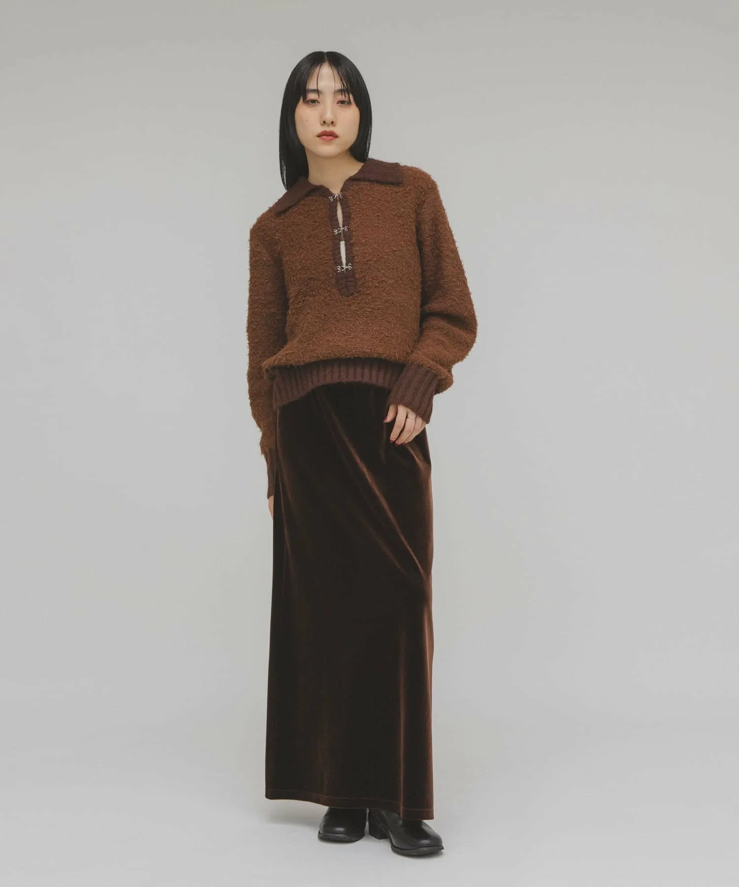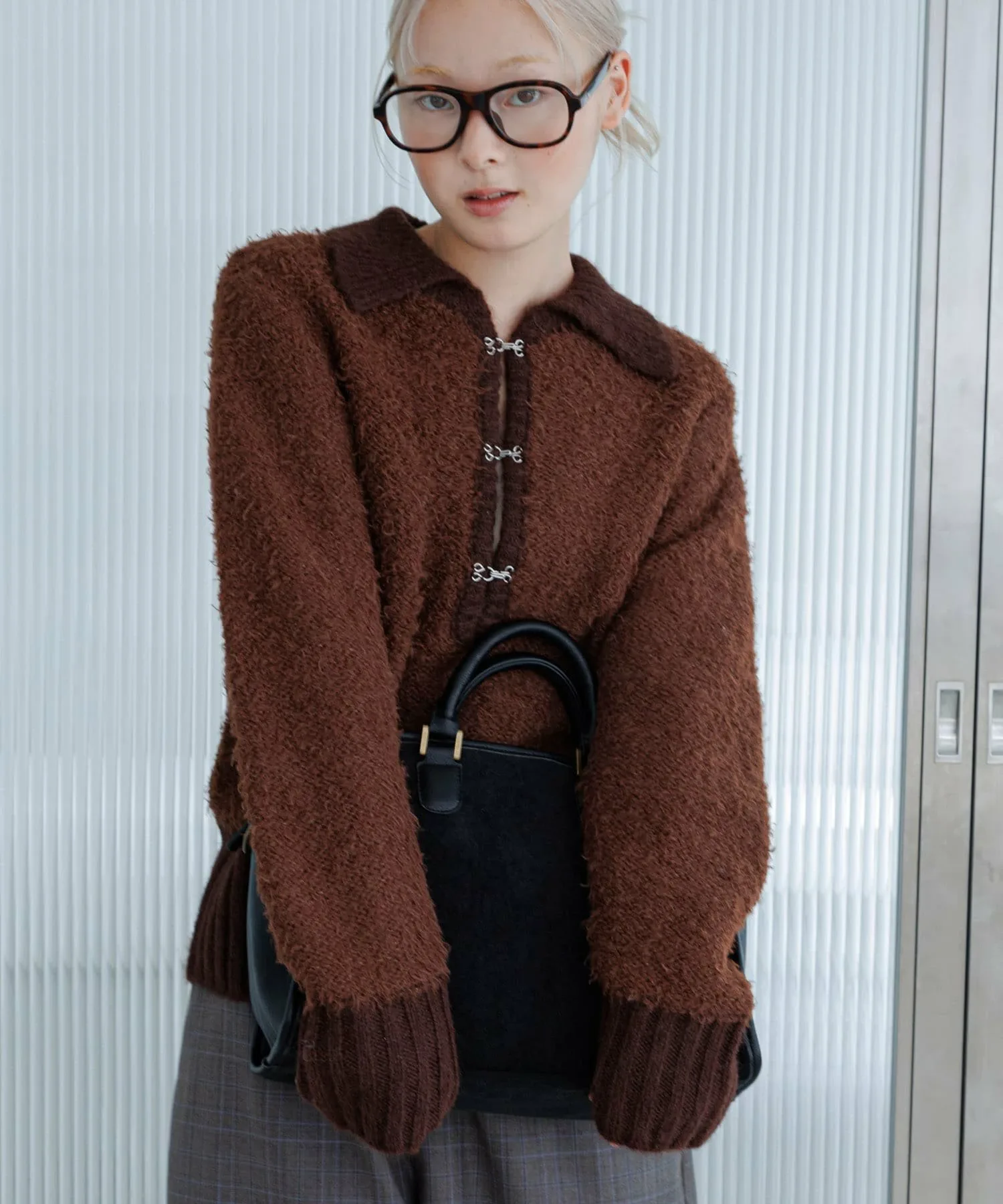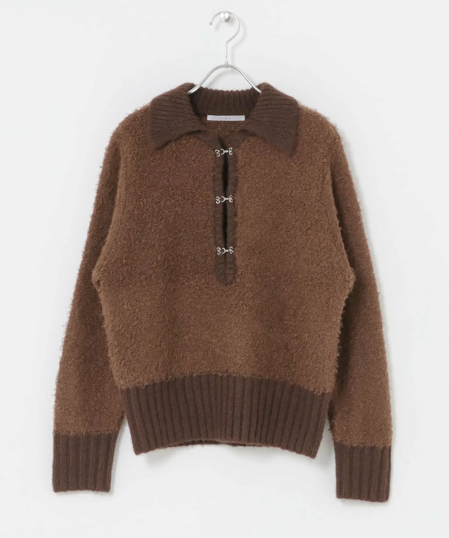 [Вязаное полотно с застежкой на крючок спереди]