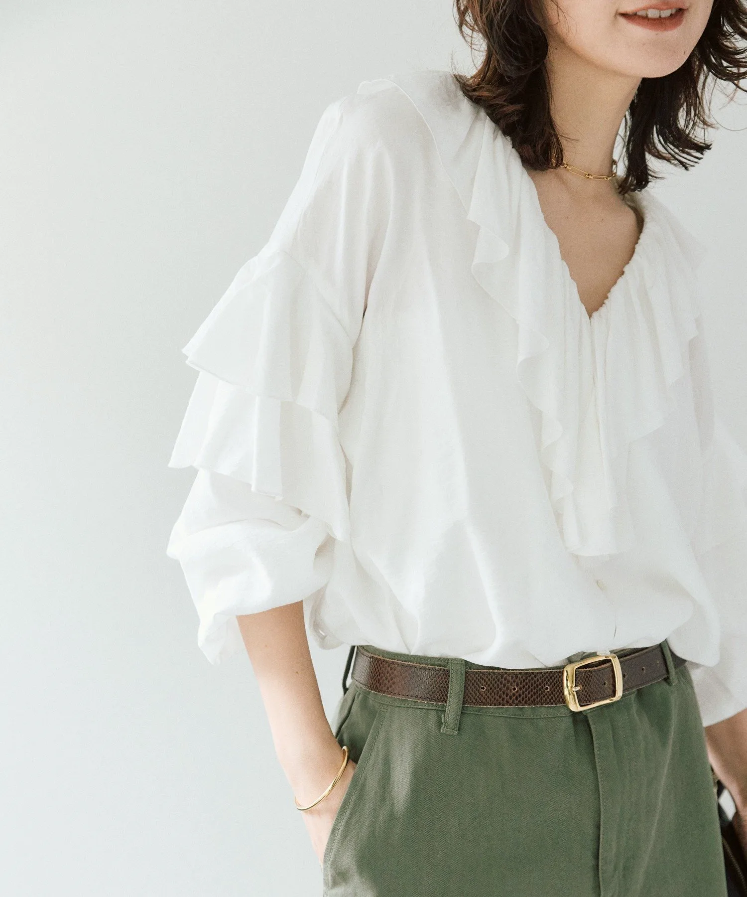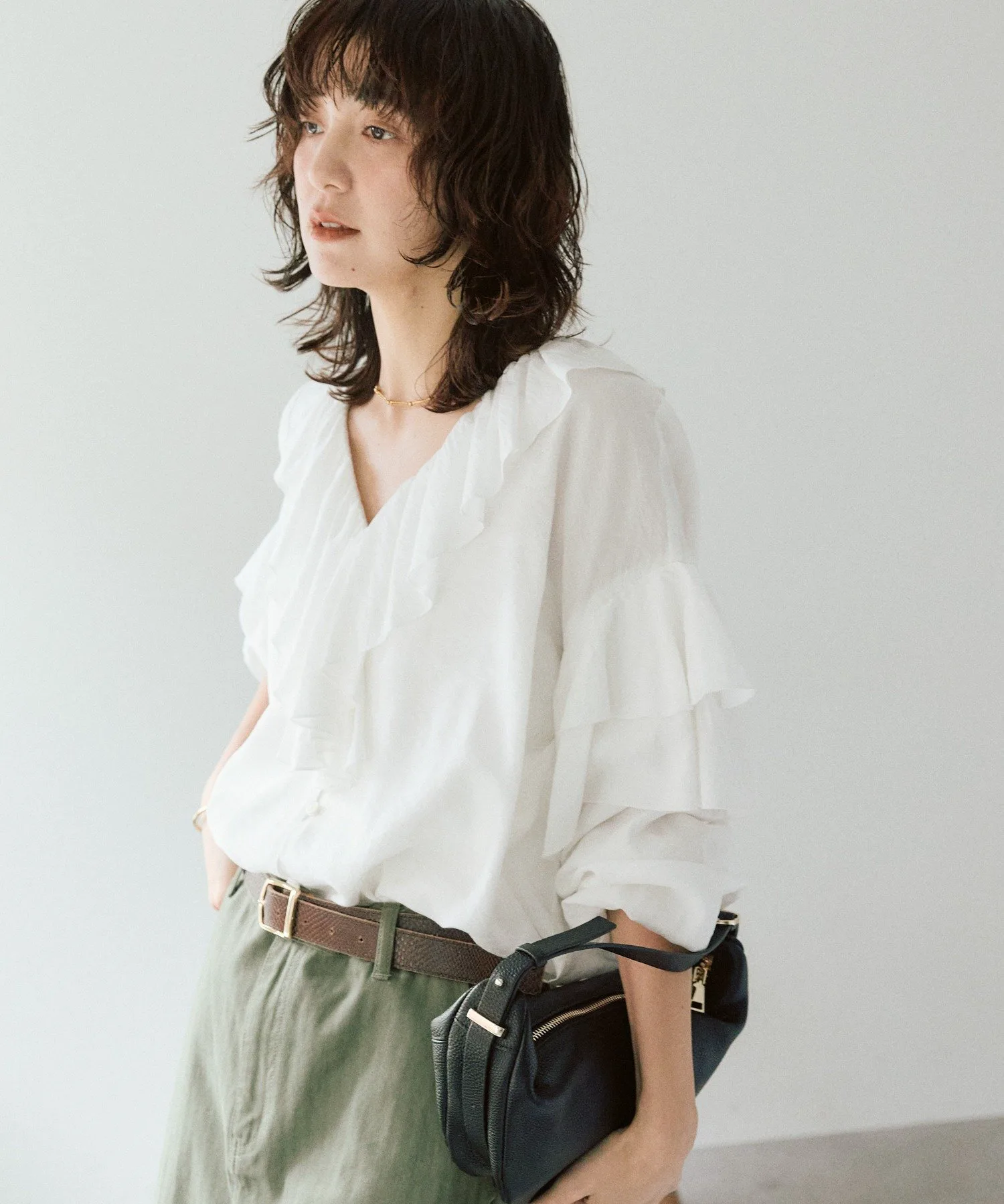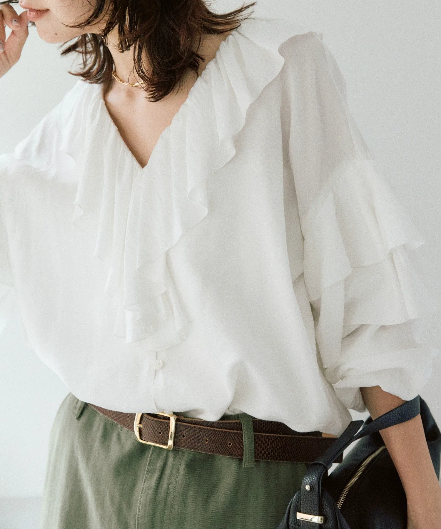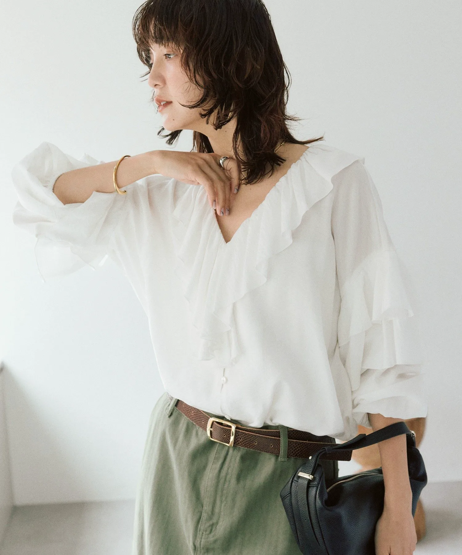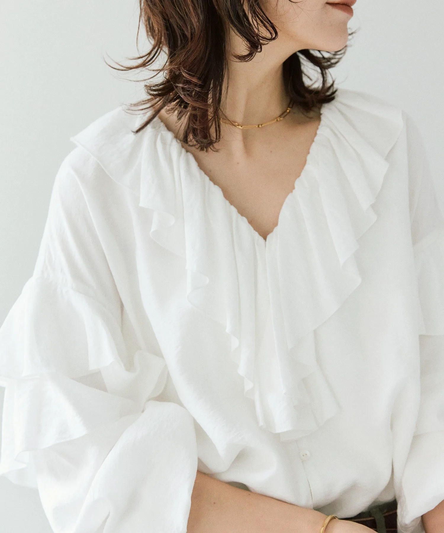 - Элегантная блузка с великолепными оборками на вырезе и рукавах