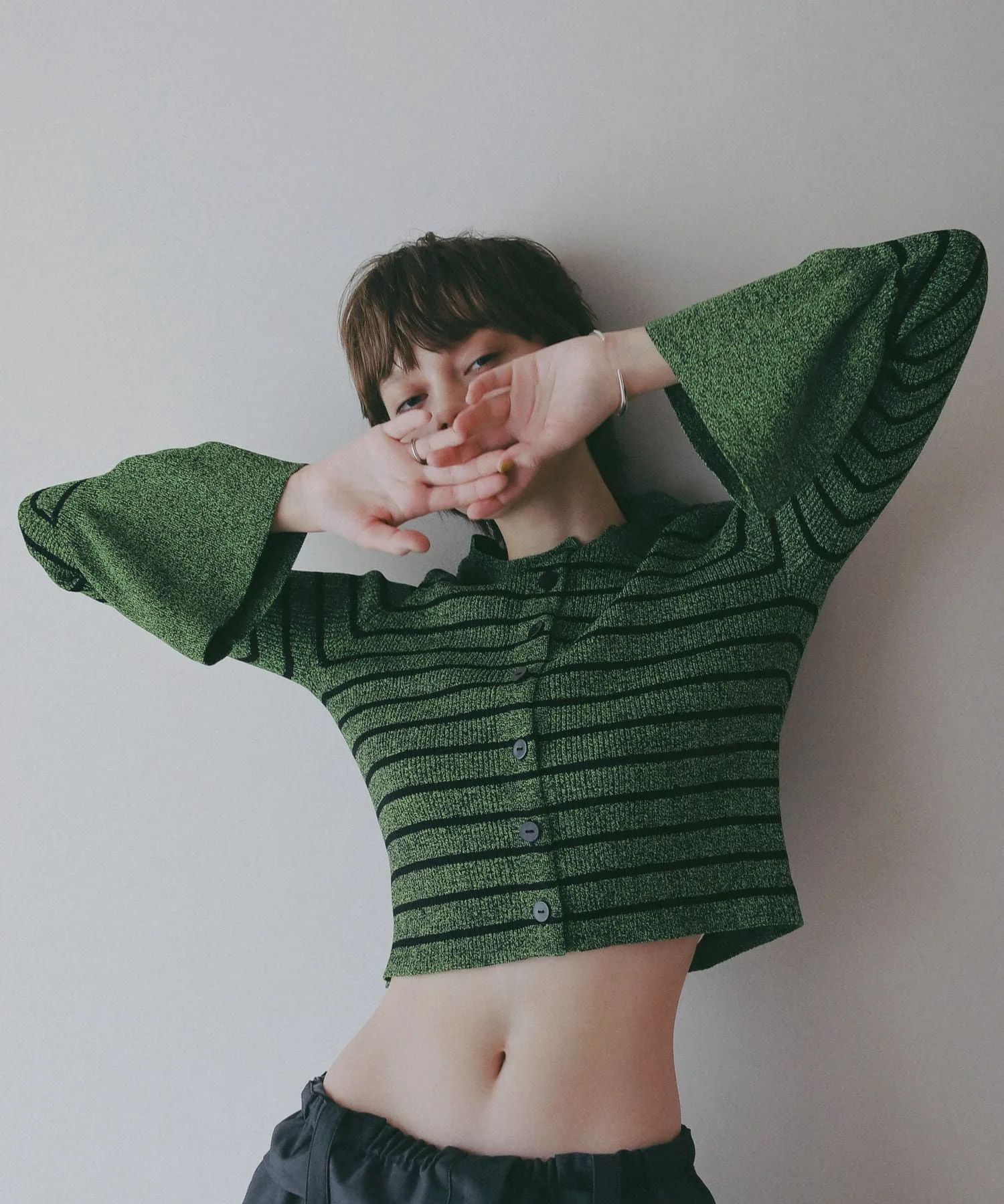 Полосатый трикотаж с рукавами-воланами и открытым передом.