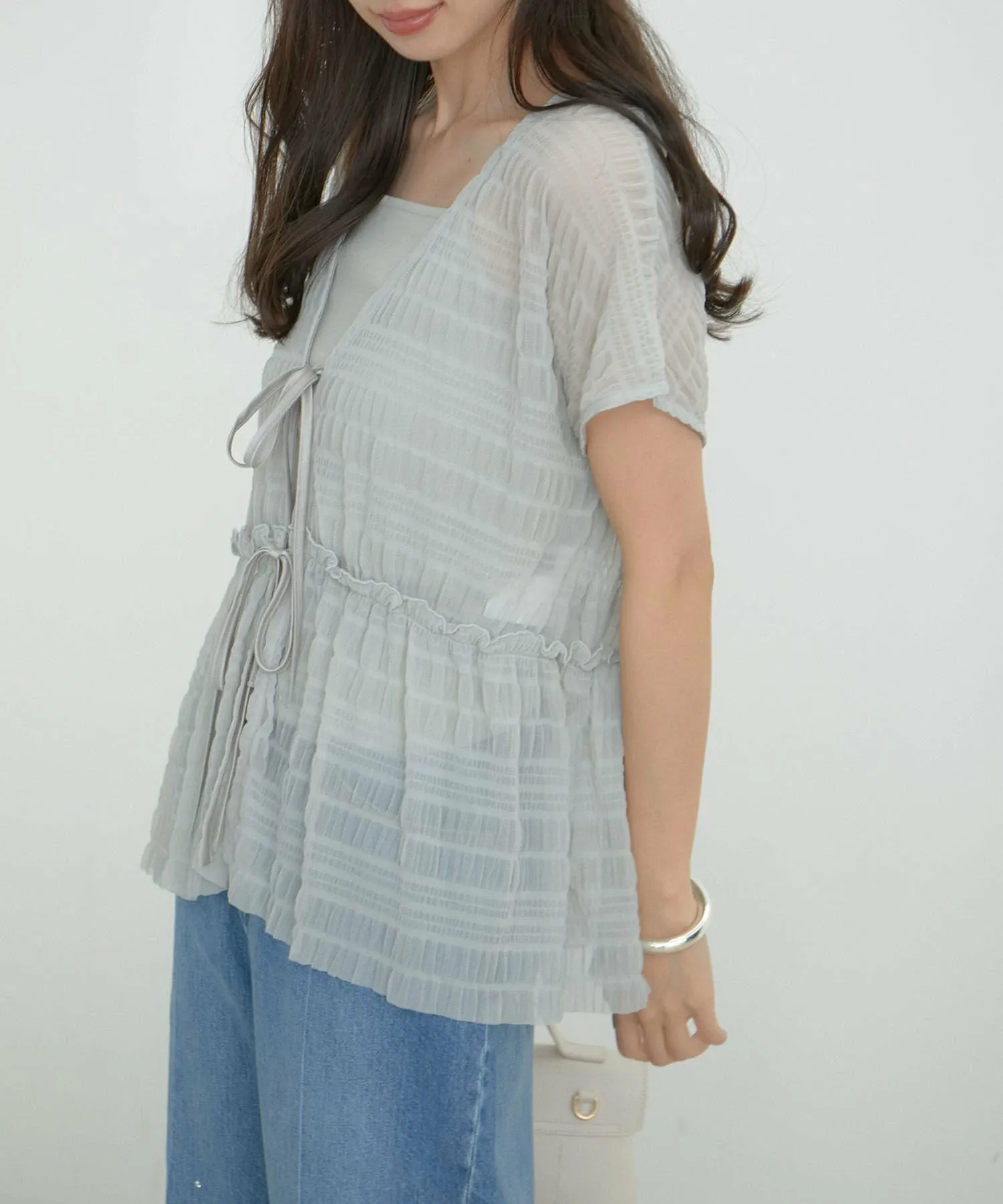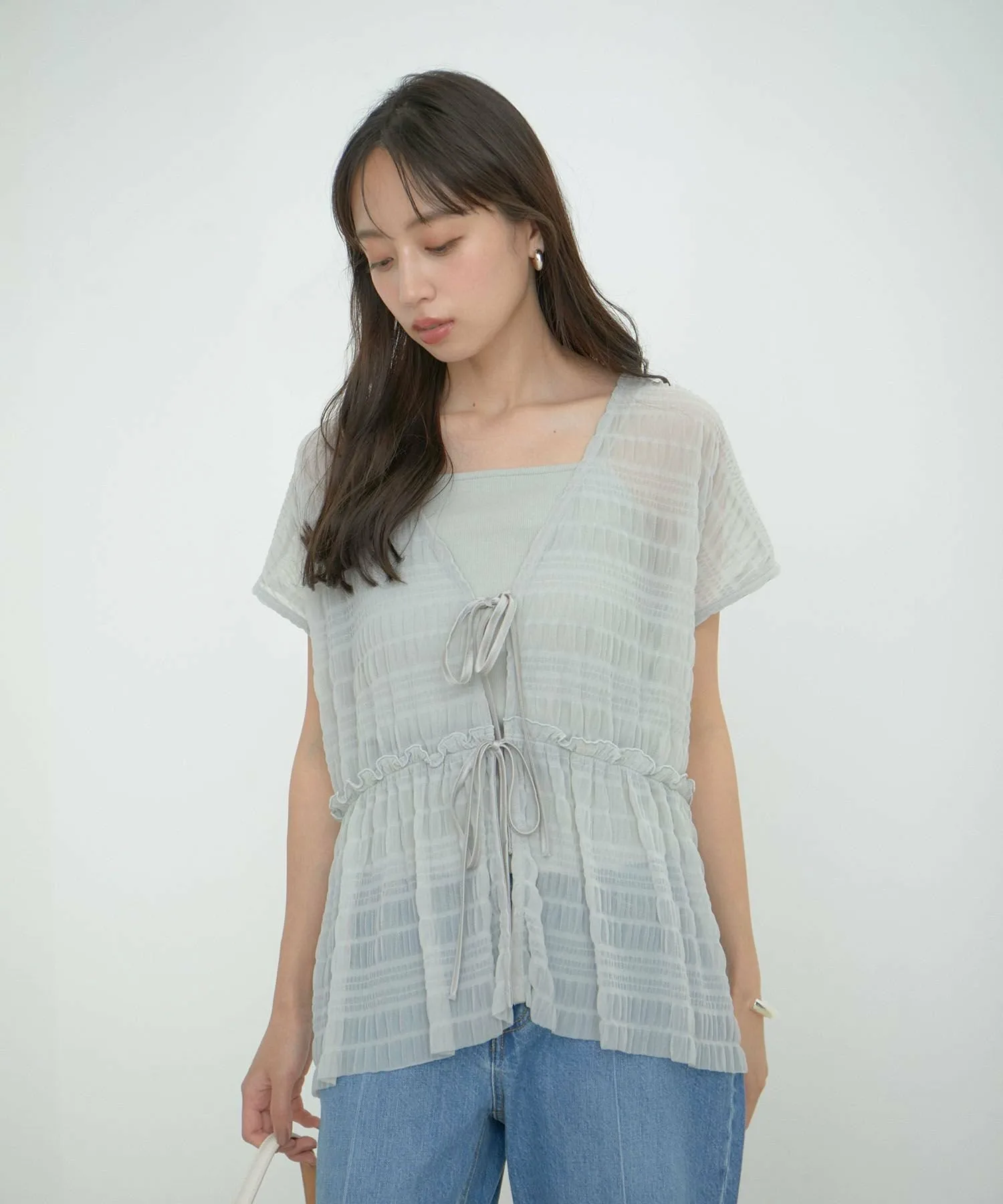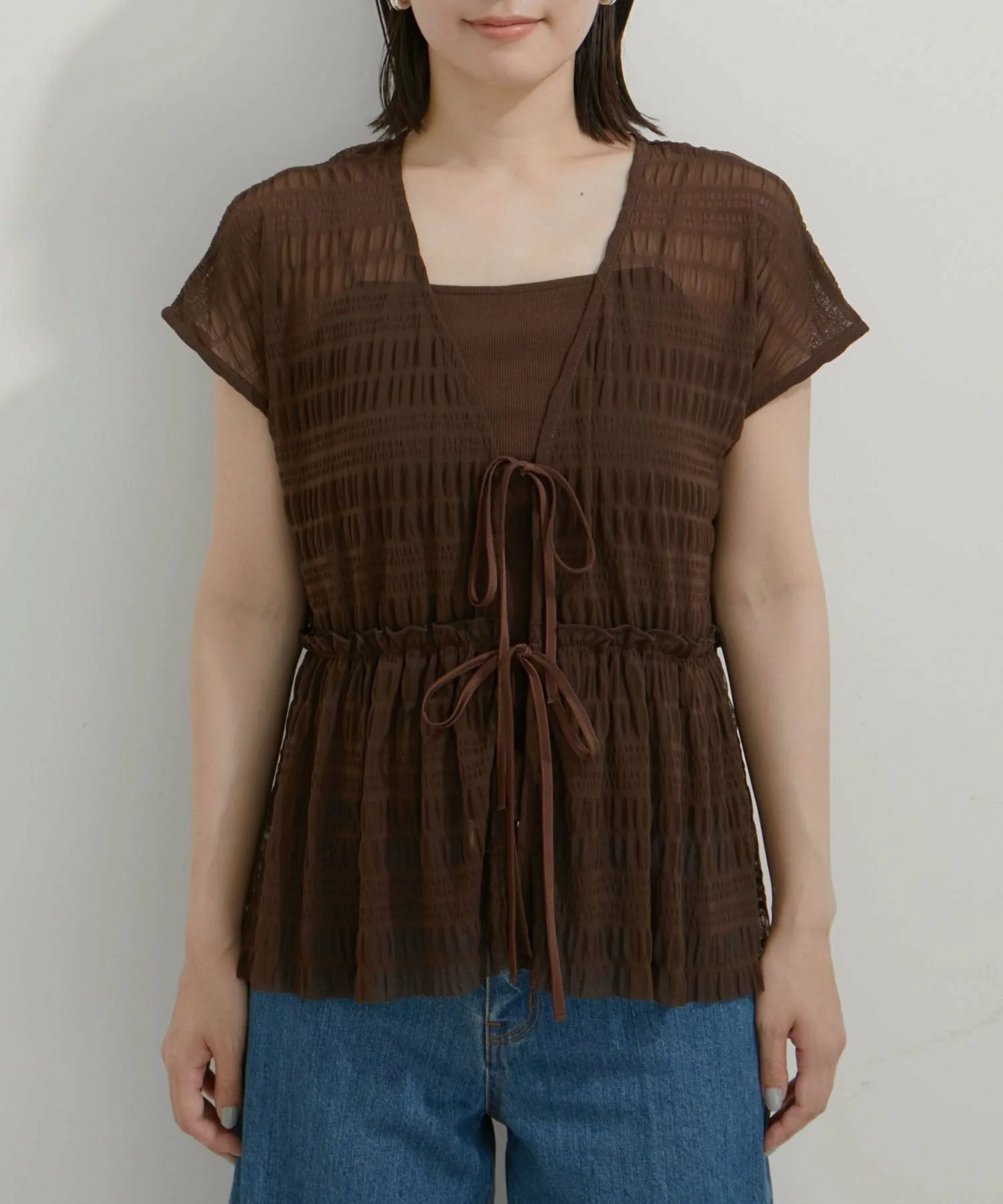 Дизайн и силуэт Это болеро изготовлено из мягкого, присборенного тюля, приятного на ощупь и дышащего, что делает его идеальным для предстоящего жаркого сезона! > <ОСОБЕННОСТИ> ・Длина и ширина достаточно широкие, чтобы закрыть бедра, а модные ленточные акценты позволяют носить его как самостоятельное болеро. ・Внутренняя майка имеет круглые бретели, а открытое декольте создает здоровый, стройный силуэт, что является ключевым моментом! ・Этот комплект сочетает в себе экономичность и стиль.