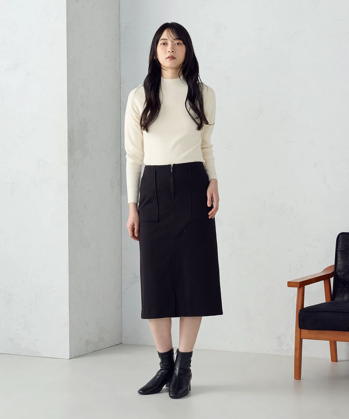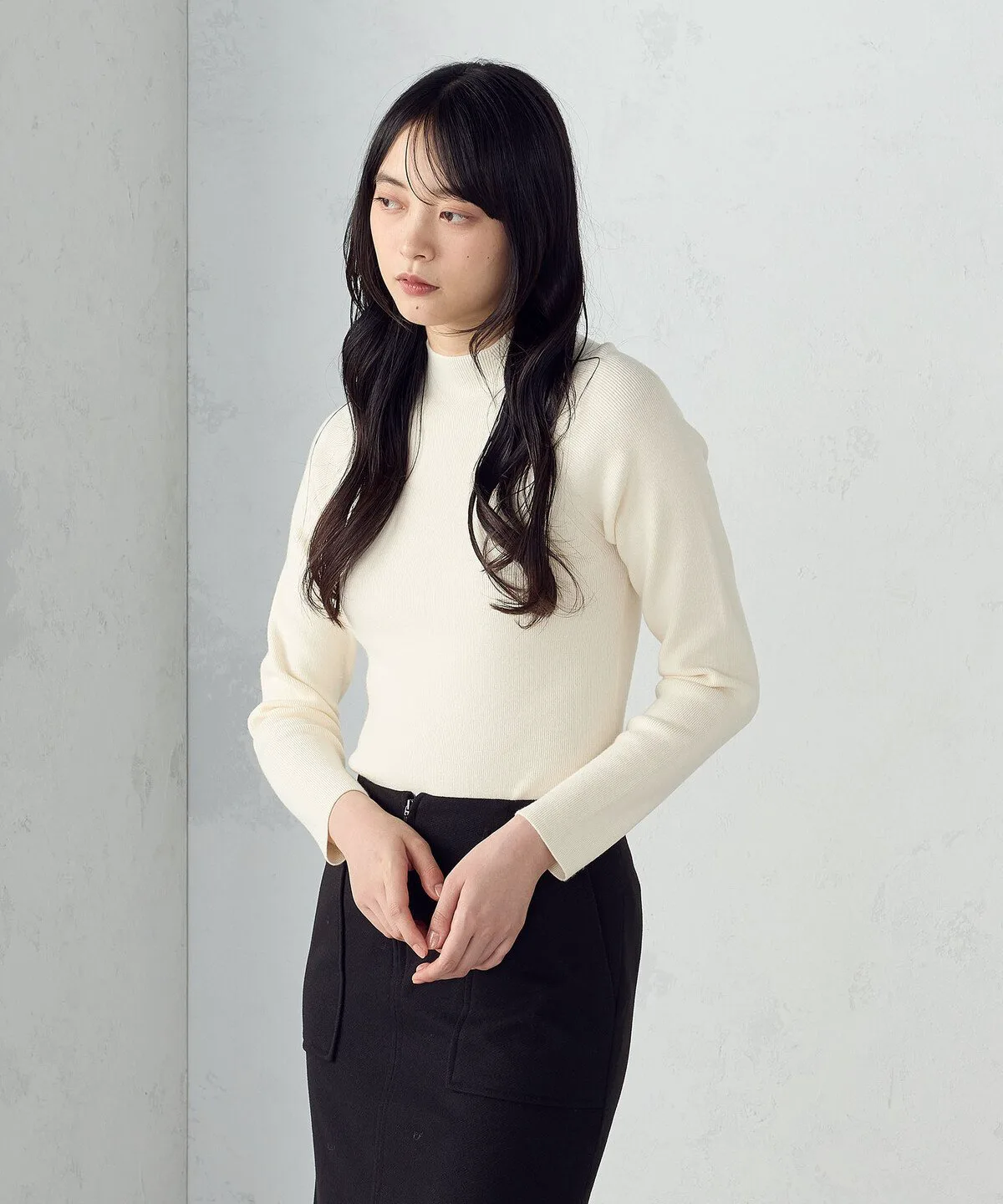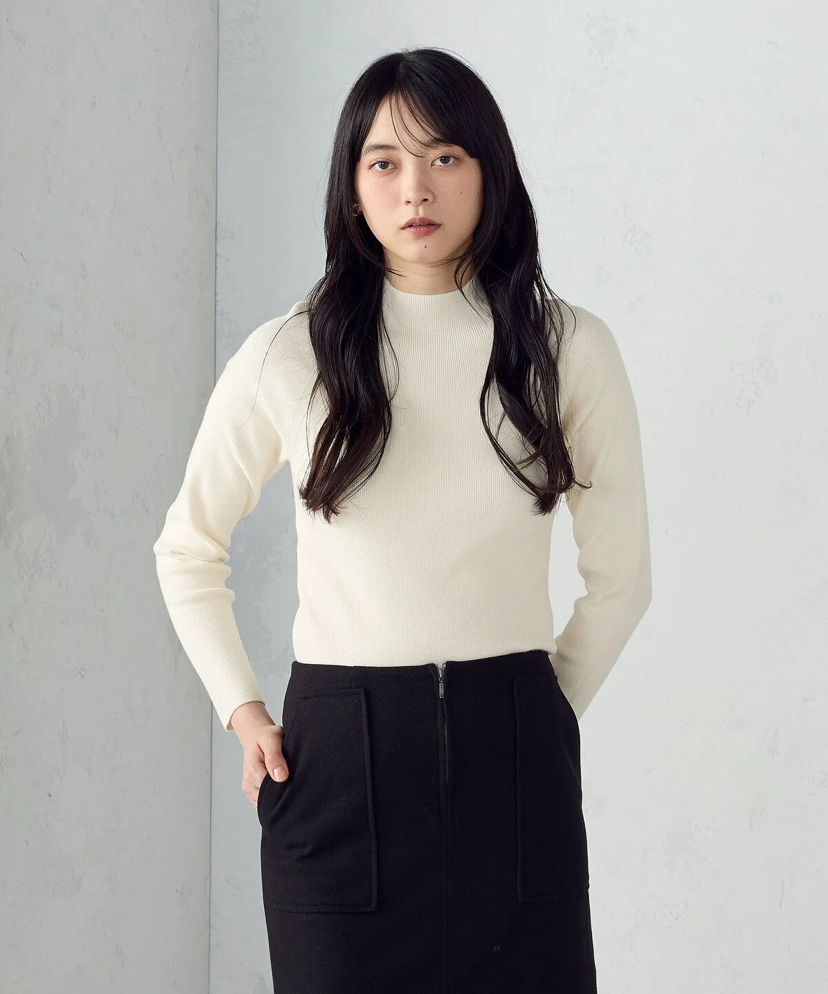 Базовый трикотажный свитер с высоким воротником и тонкой ребристой отделкой.