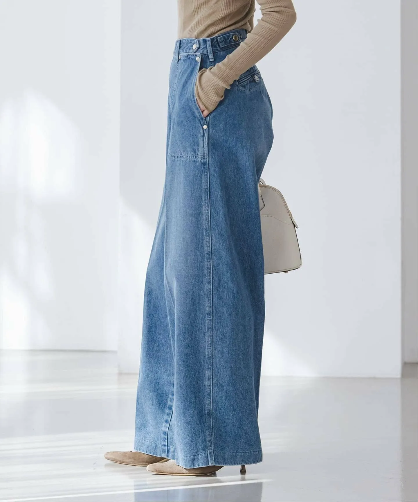 Длина большая, поэтому мы рекомендуем носить его с обувью на каблуке или подошве высотой 4-5 см. Материал: Поскольку это джинсовая ткань, она немного жестковата, но со временем станет более комфортной. Комфорт: Текстура и цвет делают её подходящей для всех сезонов. Центральная складка придаёт ей аккуратный вид. *************************
