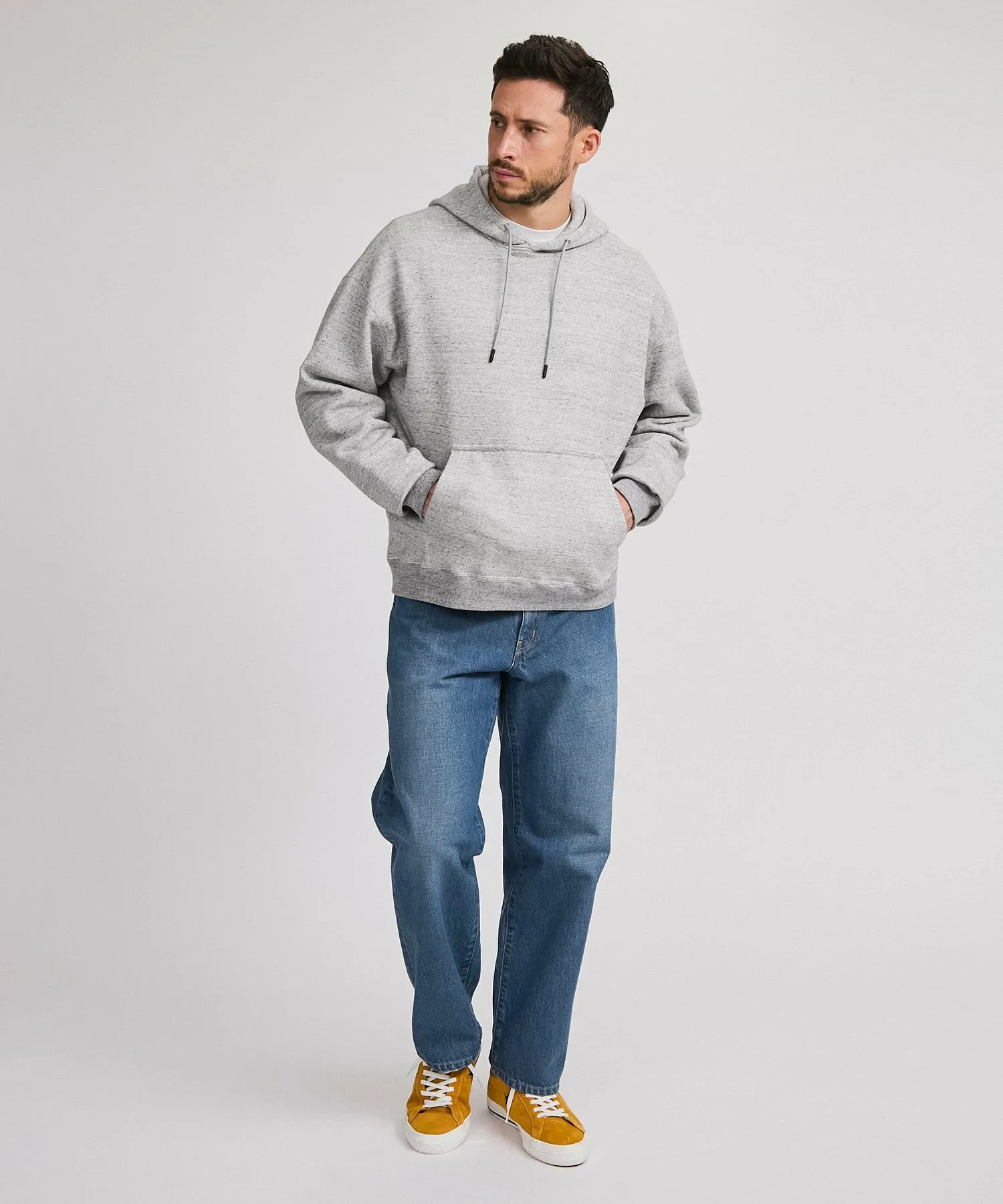 Силуэт имеет свободный крой с закругленными краями и рукавами для ощущения простора, а также приспущенные плечи для создания большого объема.