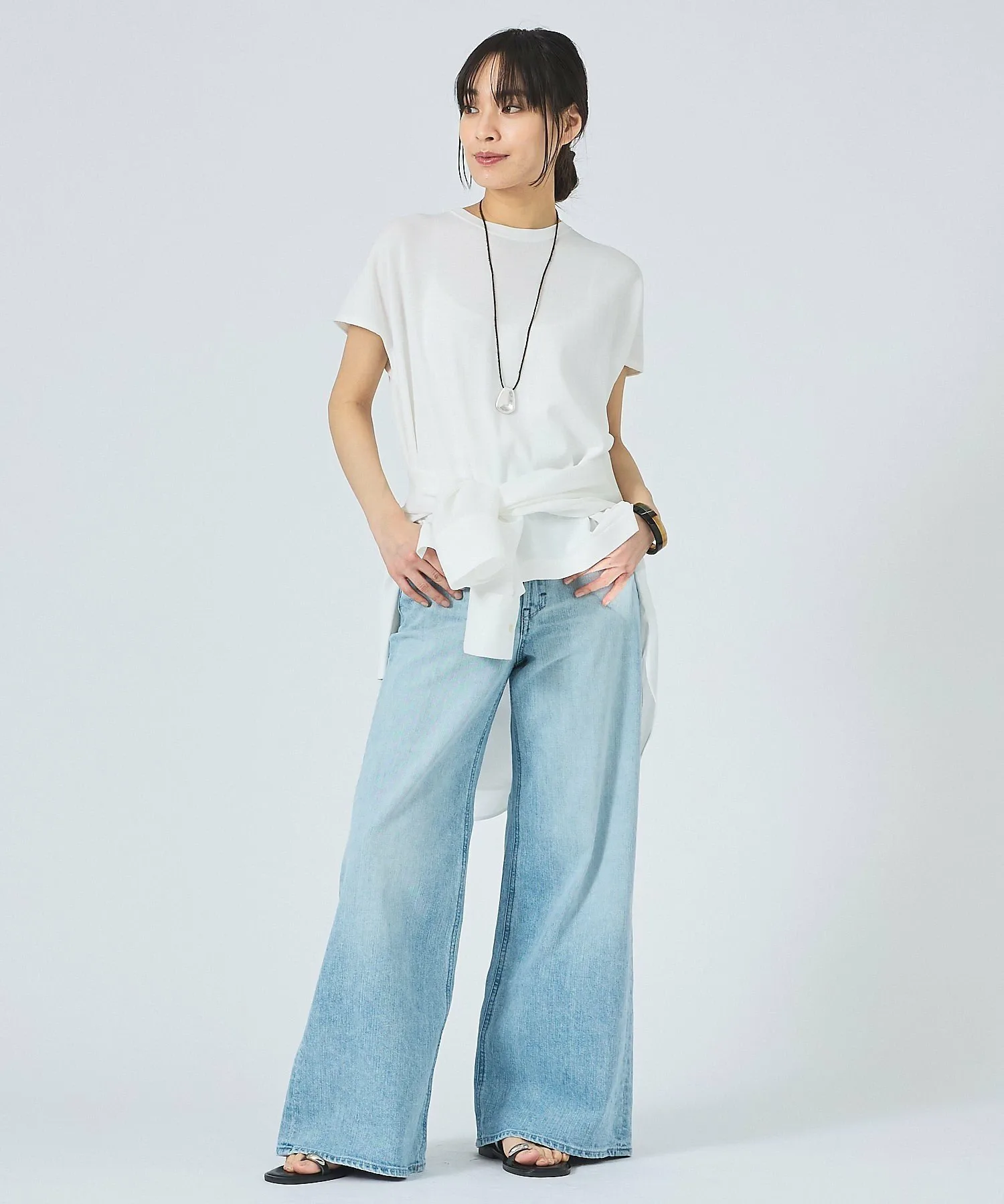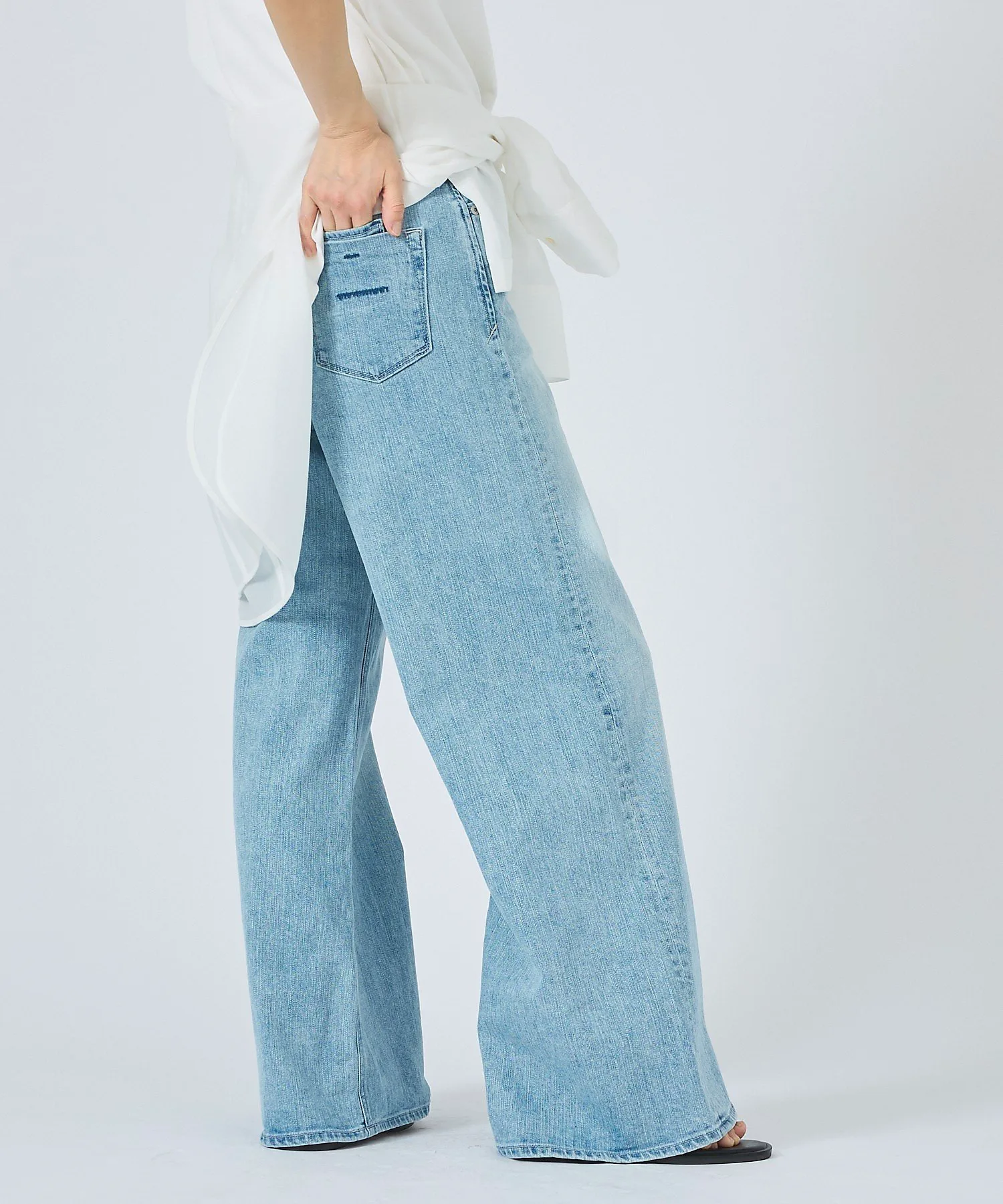 Светлая основа с потертостями и разрезами создает трехмерный эффект, ненавязчиво скрывая недостатки в области живота.
