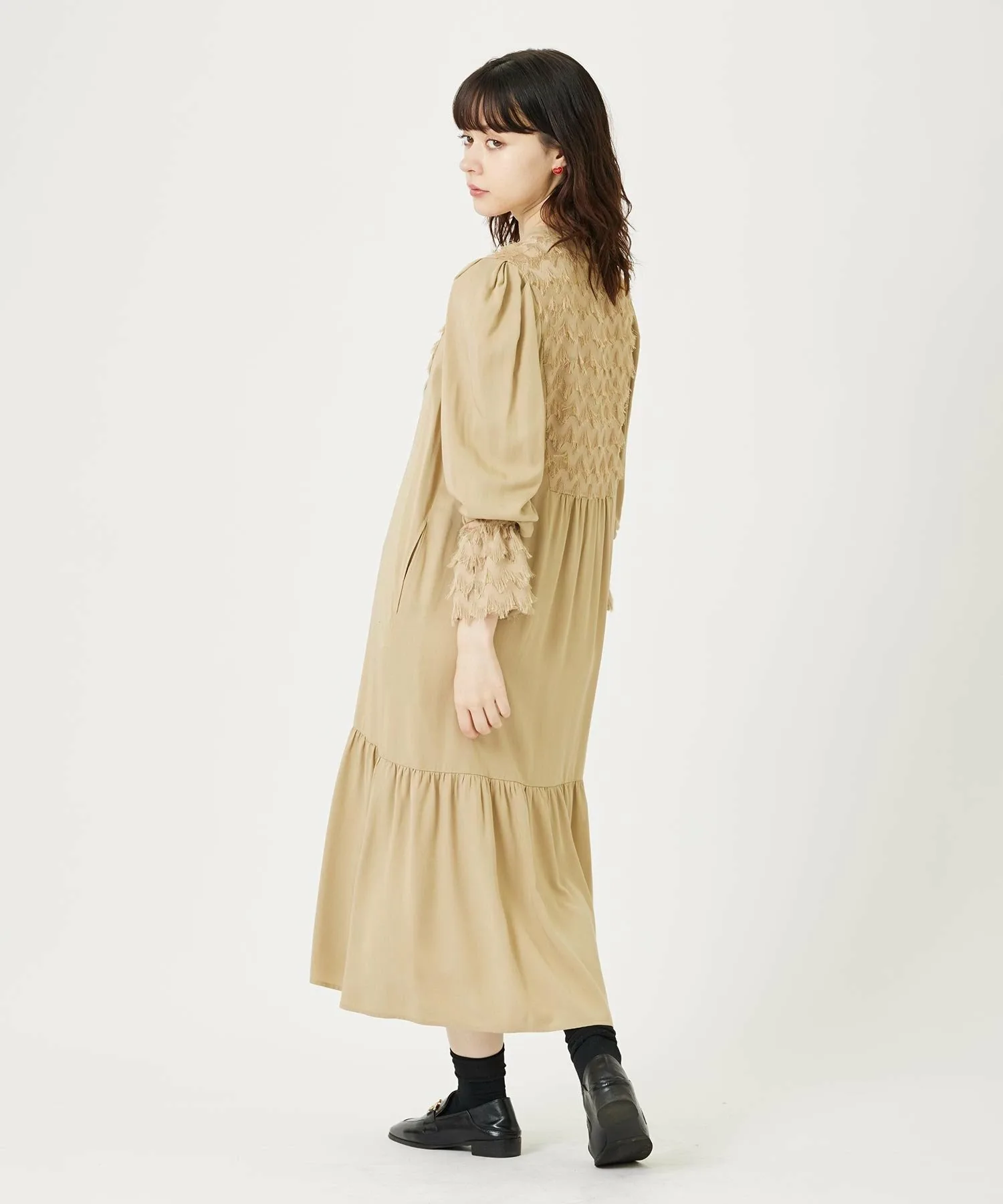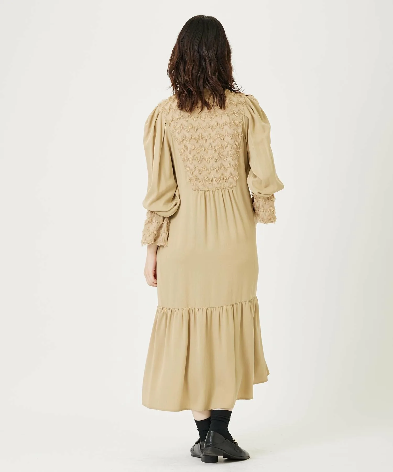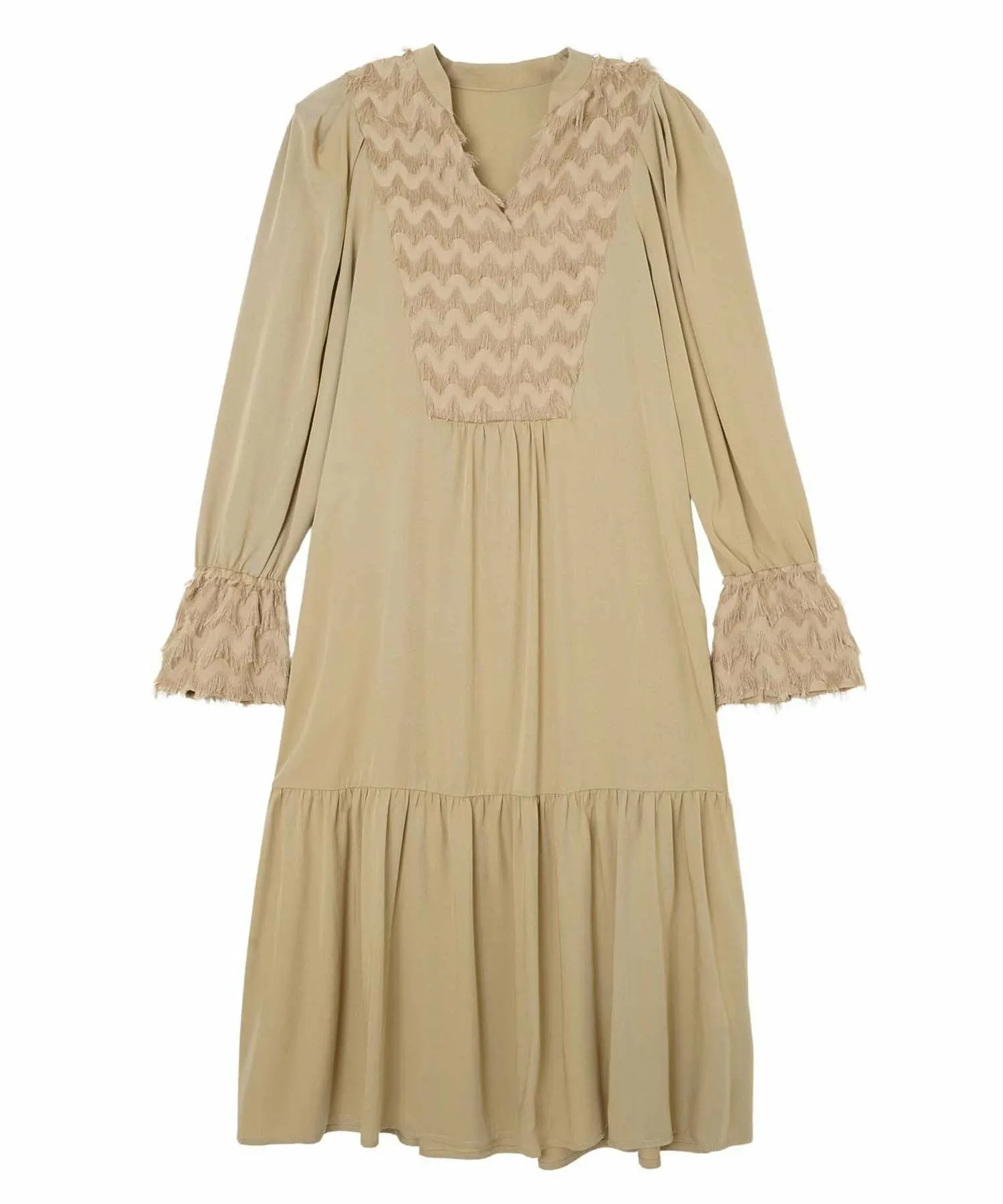 Платье с эффектной бахромой на груди, спине и манжетах.