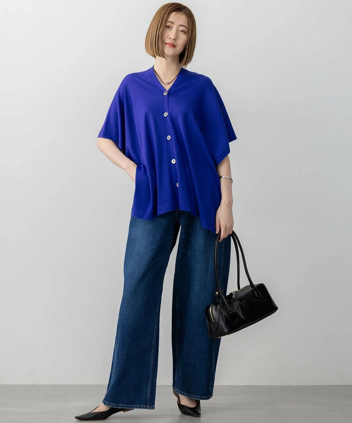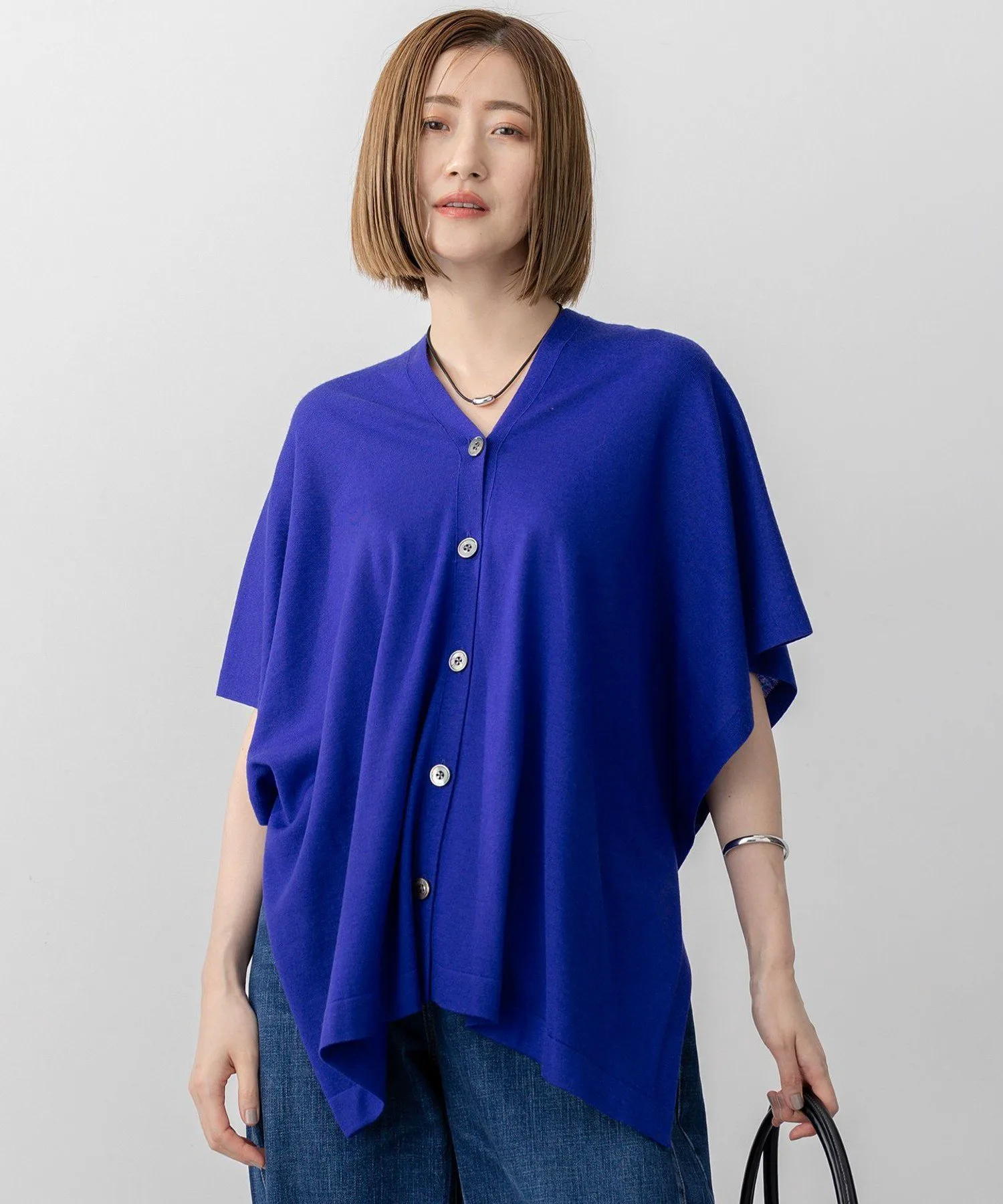 Это вязаное пончо имеет широкий силуэт, благодаря высококачественному материалу. Его можно носить спереди, сзади, слева, справа или по диагонали, создавая множество различных образов. Скрытые пуговицы по бокам создают аккуратный вид в застегнутом виде или легкий, драпированный силуэт в расстегнутом. Его можно носить поверх майки или футболки, или сочетать с рубашкой или водолазкой, что делает его удобным и подходящим для регулирования температуры в любое время года. Добавление его к вашему повседневному образу мгновенно улучшит ваш стиль. Доступно в трех цветах: черный (#005), который прекрасно контрастирует с вашим нижним бельем; хаки (#054), нежный оттенок; и яркий, привлекательный синий (#070).