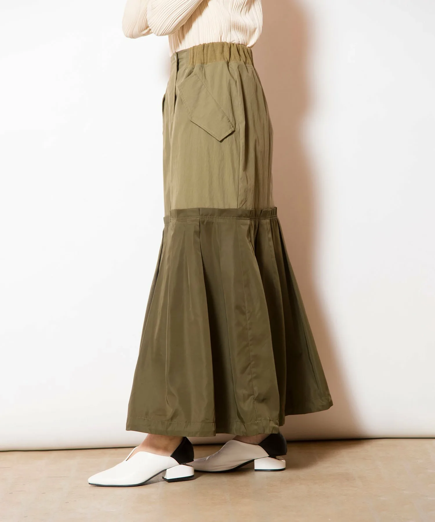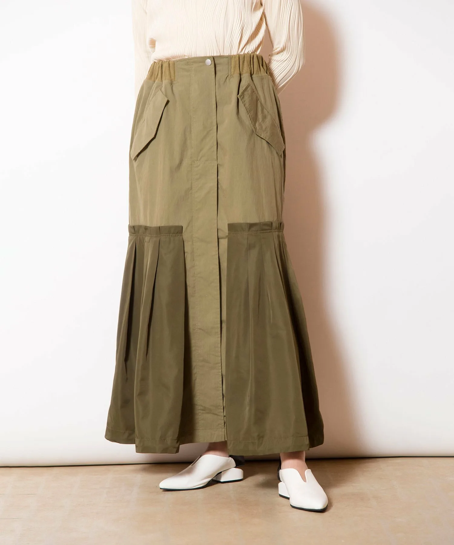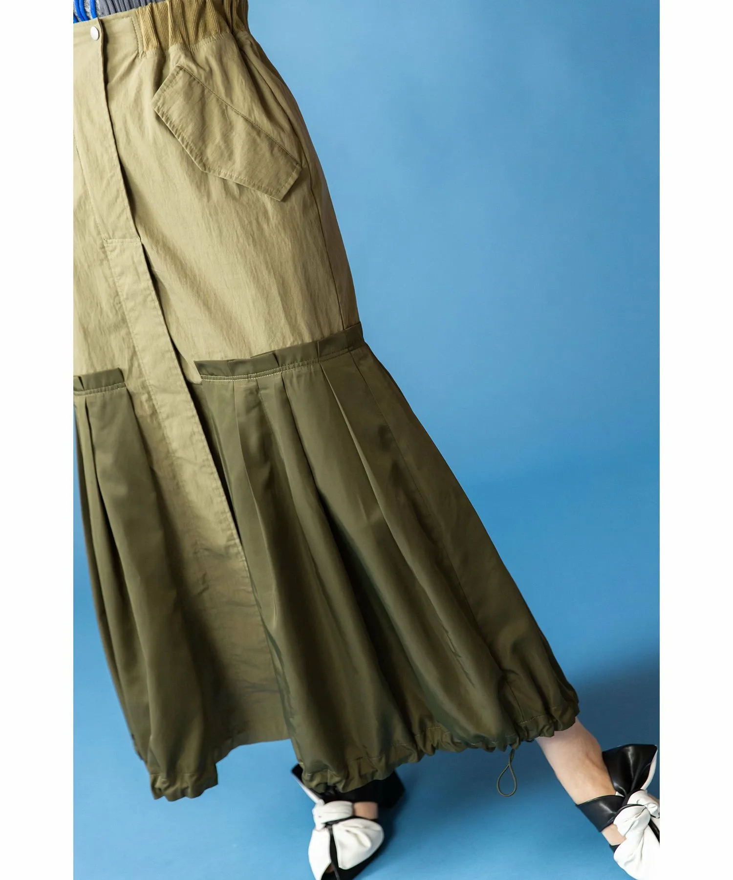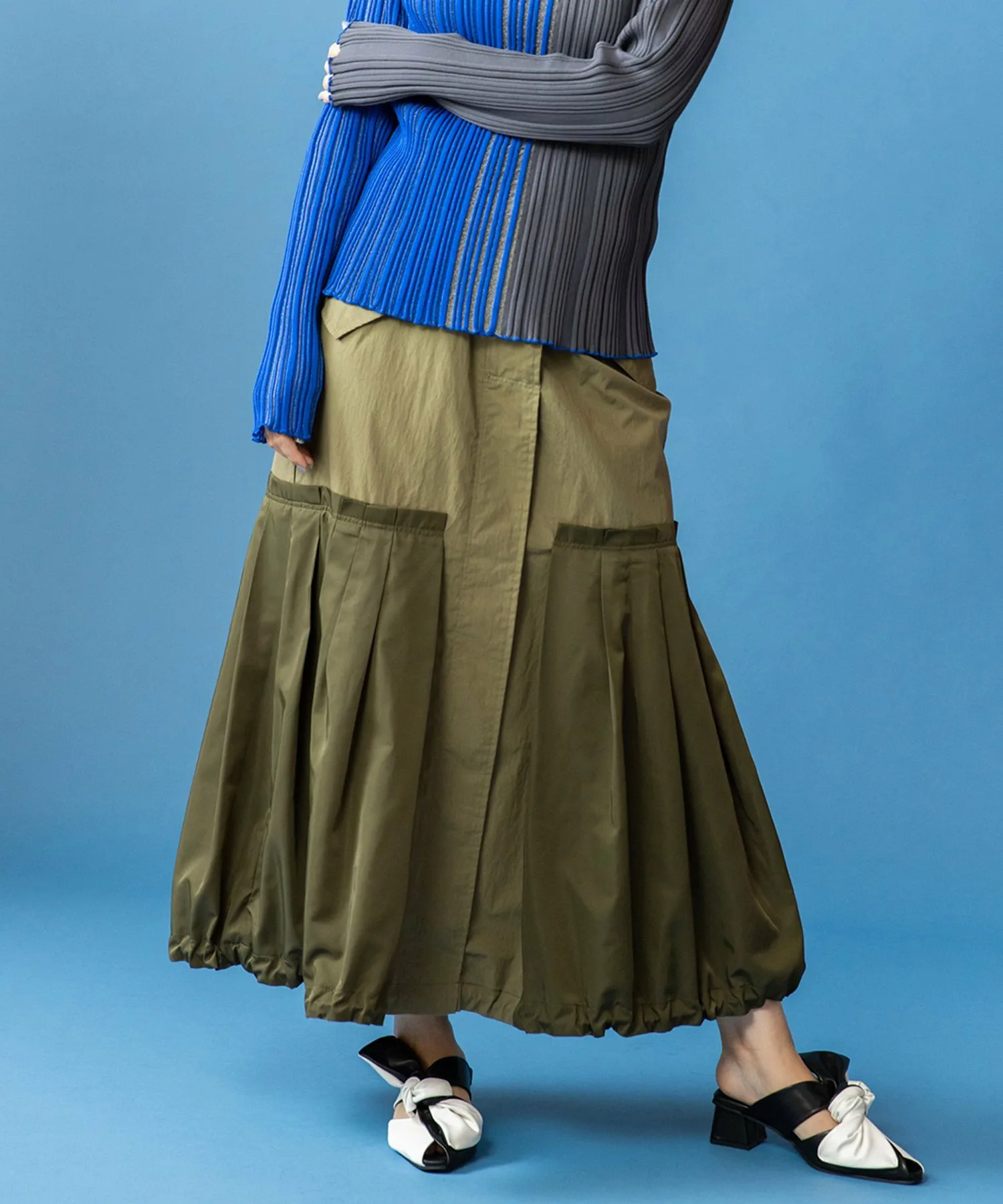 Юбка с деталями в стиле милитари, блестящими вставками и объемным силуэтом, создающим выразительную форму.