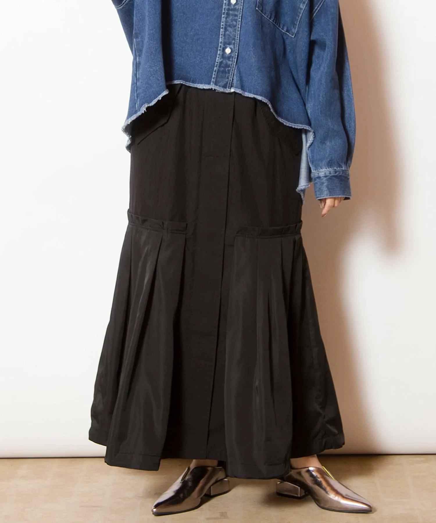 Юбка с деталями в стиле милитари, блестящими вставками и объемным силуэтом, создающим выразительную форму.