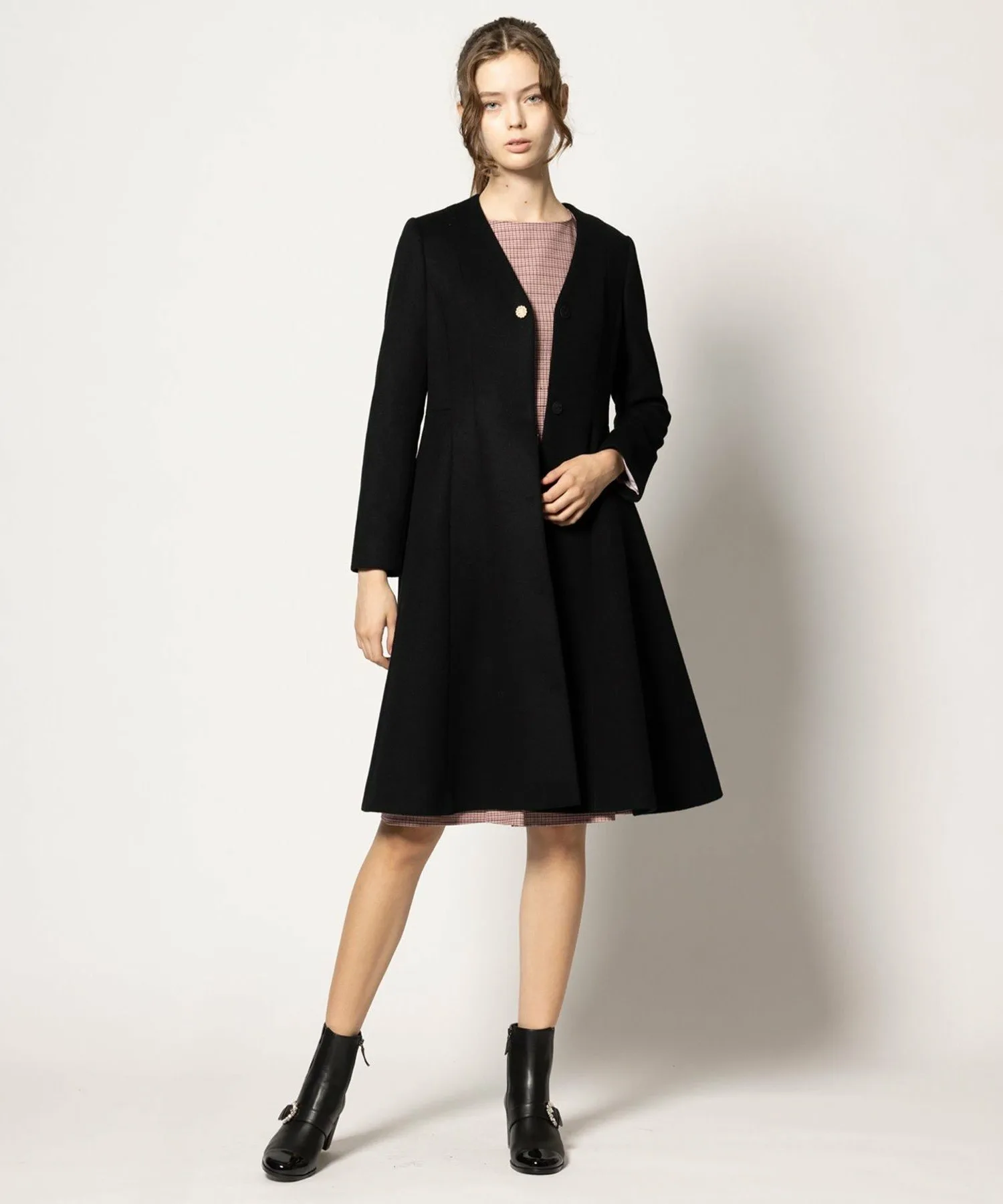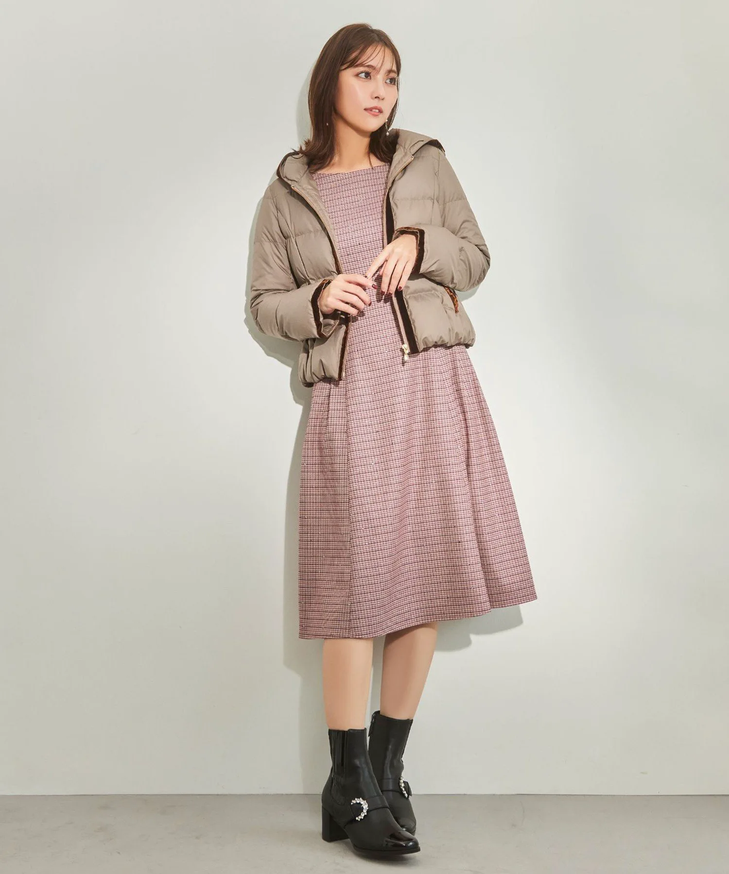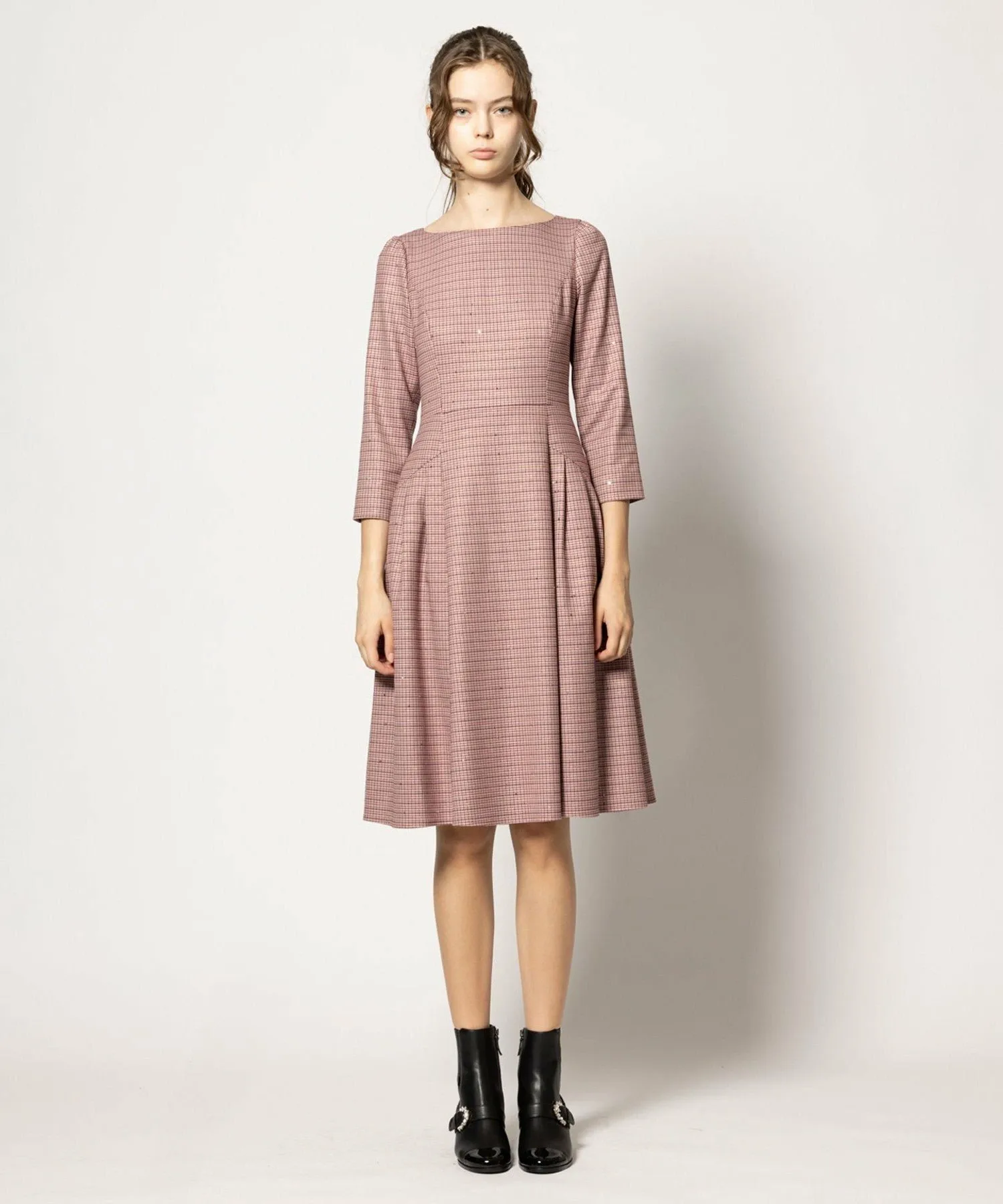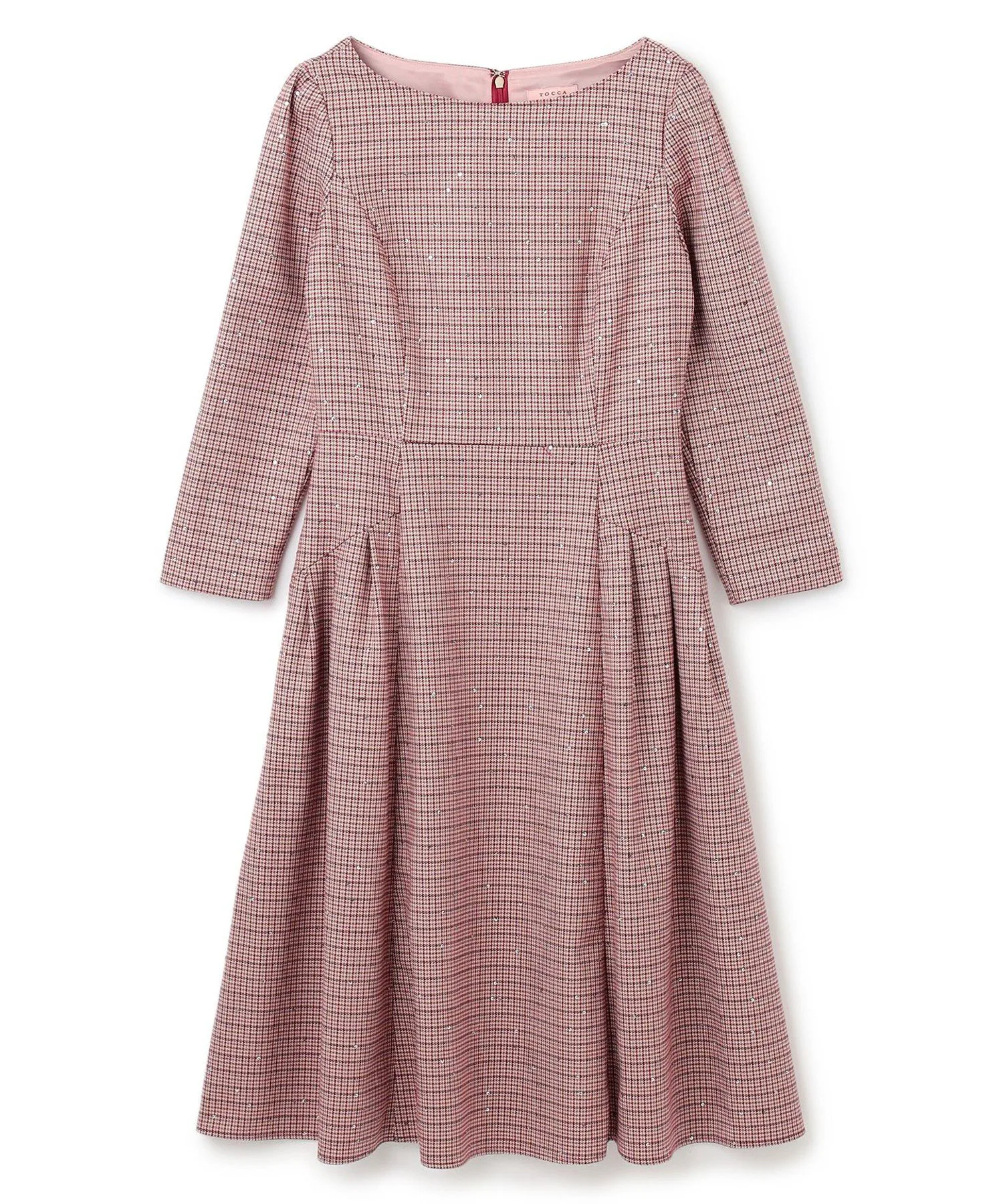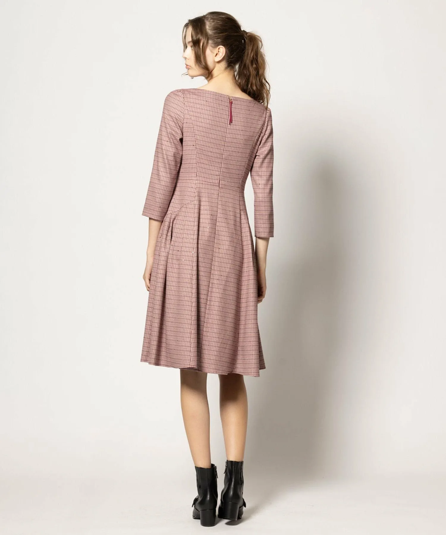 Мы придали, казалось бы, традиционному клетчатому узору женственный силуэт «приталенный и расклешенный», создав изысканное платье в стиле TOCCA.