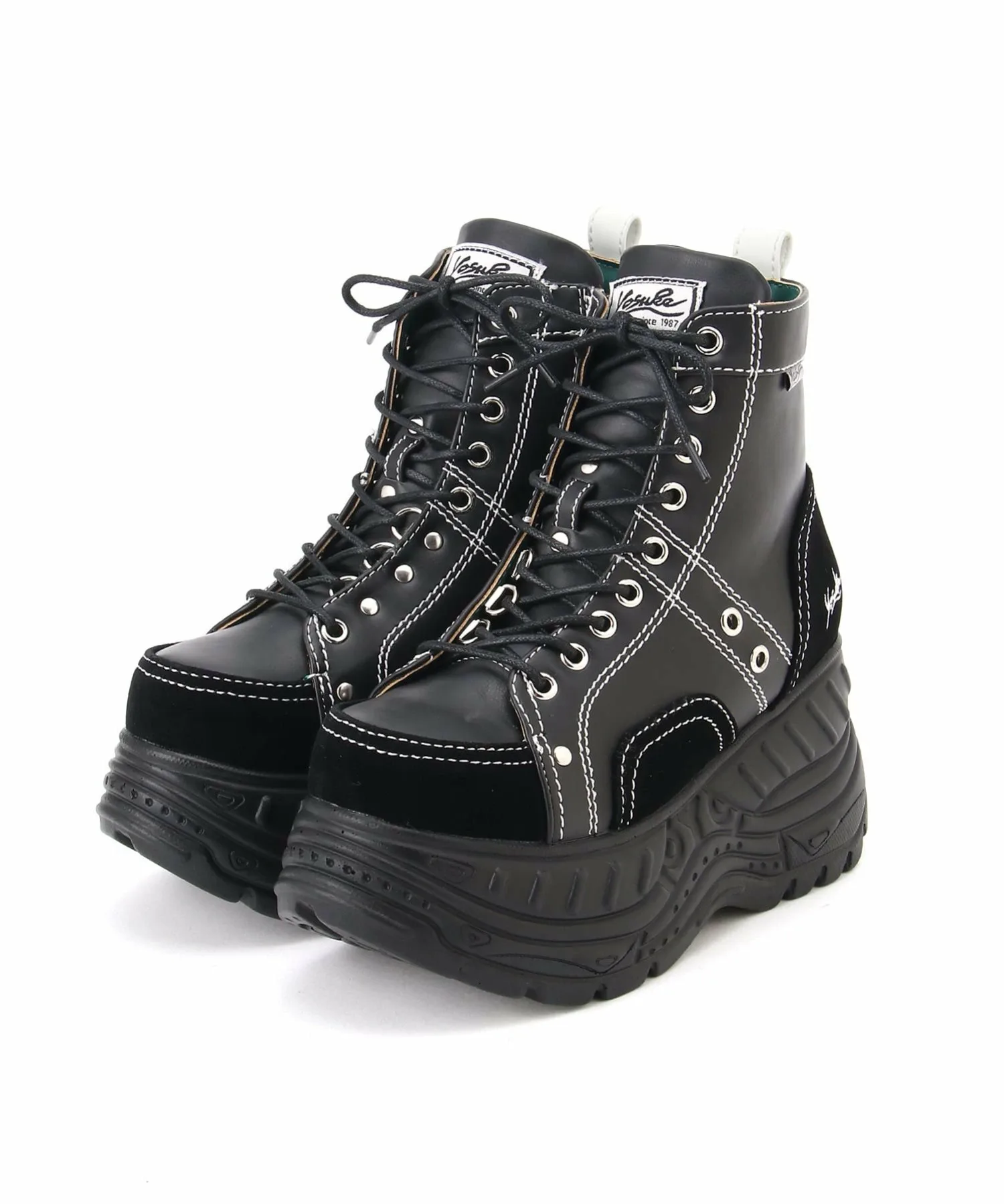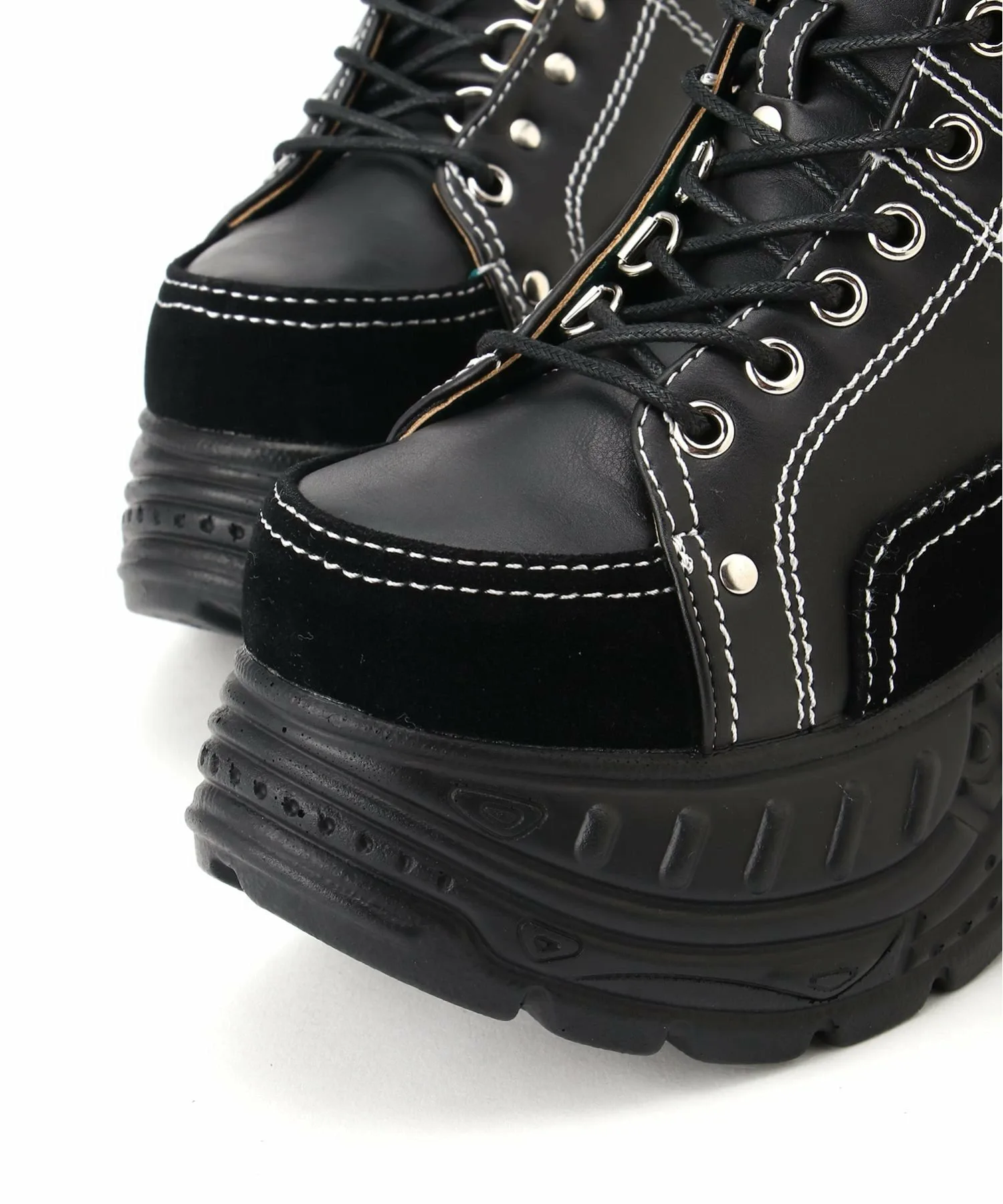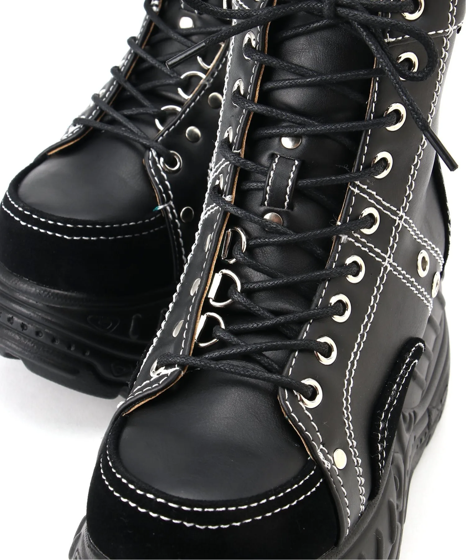 Эти высокие кроссовки на платформе украшены D-образными кольцами, расположенными в разных местах для разнообразия, и цветной строчкой.