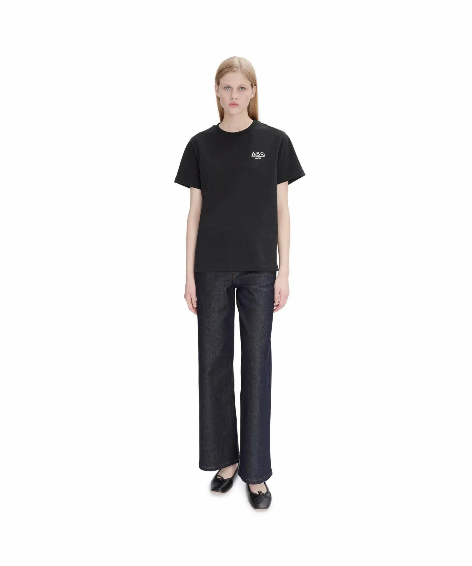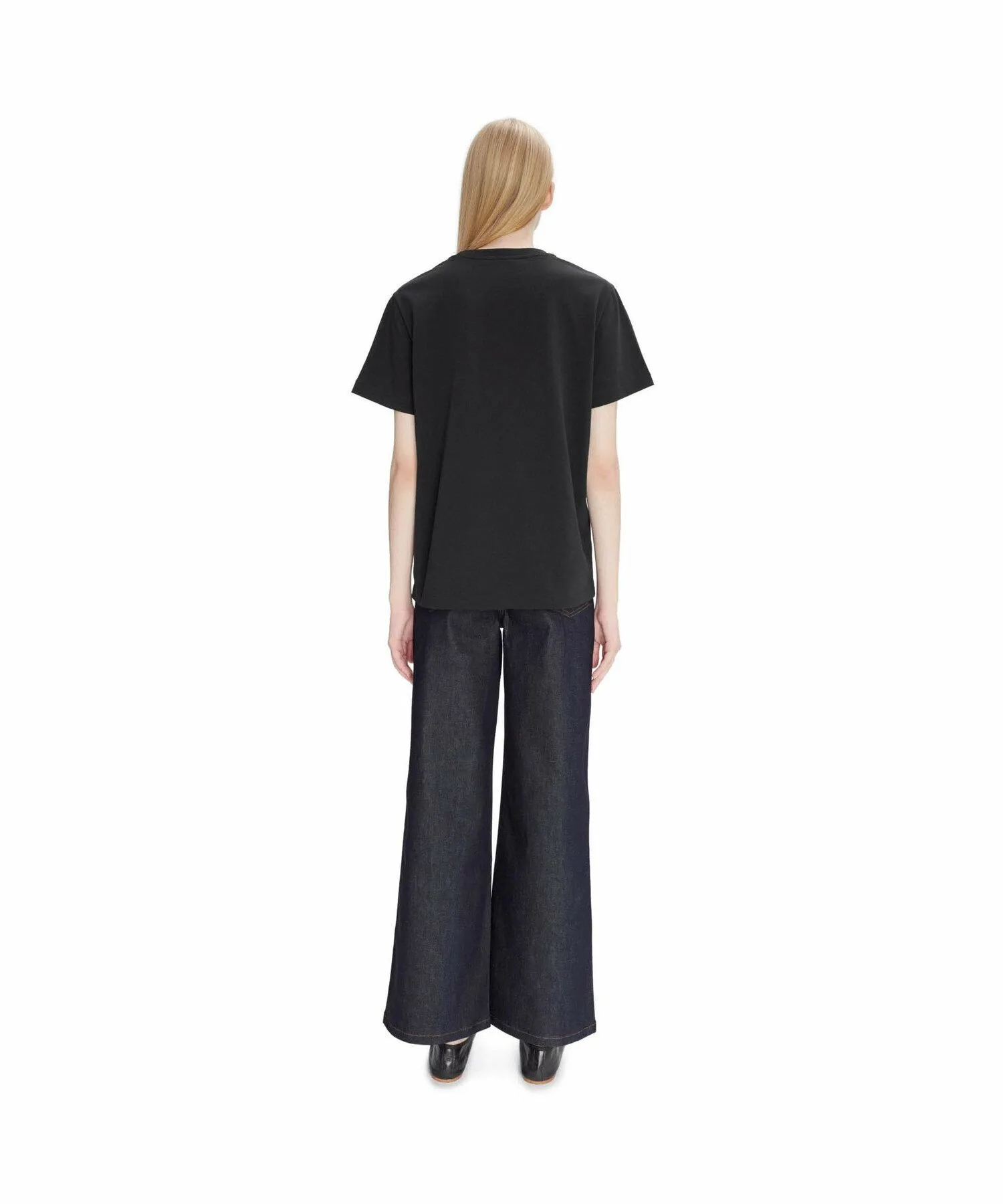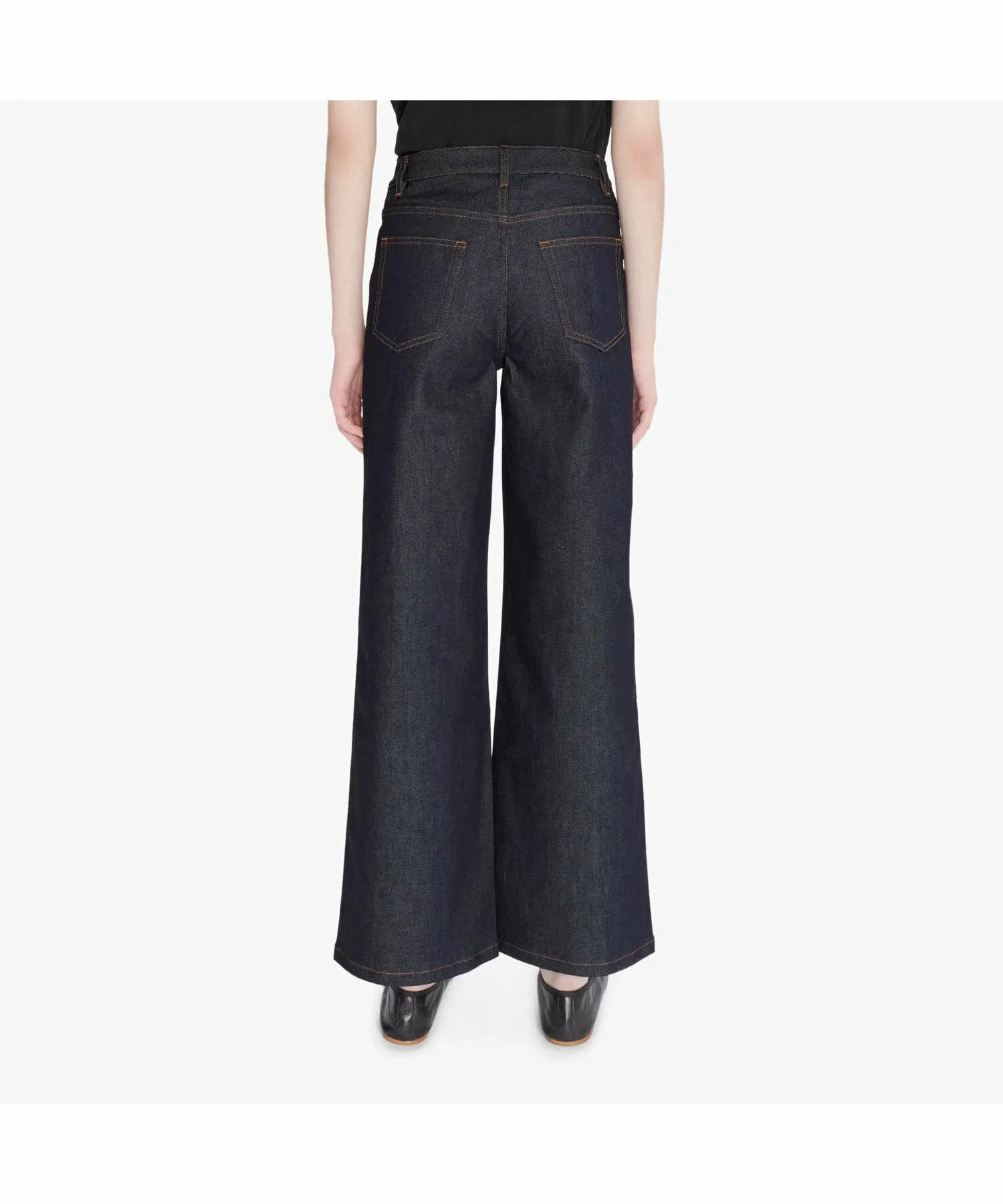 Джинсы в стиле 70-х с широкими штанинами из японского эластичного денима цвета индиго.