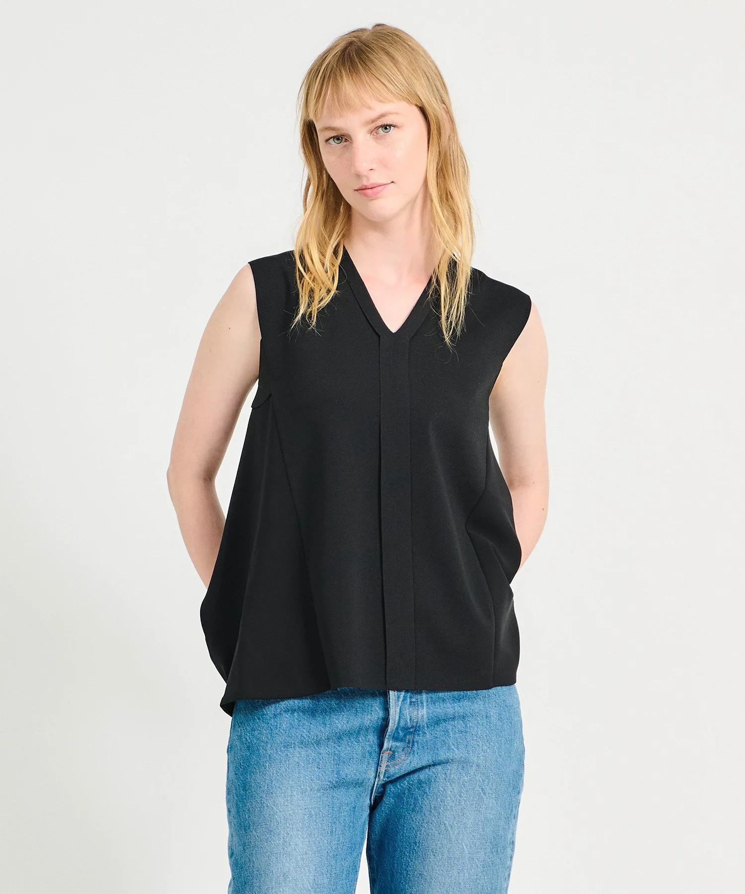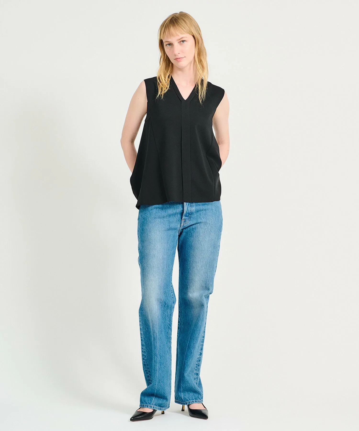 Светло-голубой цвет доступен эксклюзивно в нашем интернет-магазине, магазине Atre Ebisu и магазине GINZA SIX. Обратите внимание, что этот товар не продается в других магазинах. [ESTNATION] Эта классическая модель возвращается в обновленном дизайне. Спинка выполнена из ткани жоржет, создавая струящийся, расклешенный силуэт для элегантного вида. Вертикальные линии, идущие от V-образного выреза, подчеркивают вертикальный эффект, добавляя четкий штрих. Дизайн без рукавов создает гладкий силуэт вокруг рук, при этом деликатно скрывая проблемные зоны. Материал — ацетатный нейлон, обладающий превосходными влагопоглощающими и влагоотводящими свойствами. Он сохраняет ощущение прохлады и комфорта даже в жаркое лето, обеспечивая при этом аккуратный стиль. Идеально подходит как в комплекте, так и в сочетании с повседневными брюками для повседневной носки. Универсальная вещь, которую можно носить как на работе, так и вне ее.